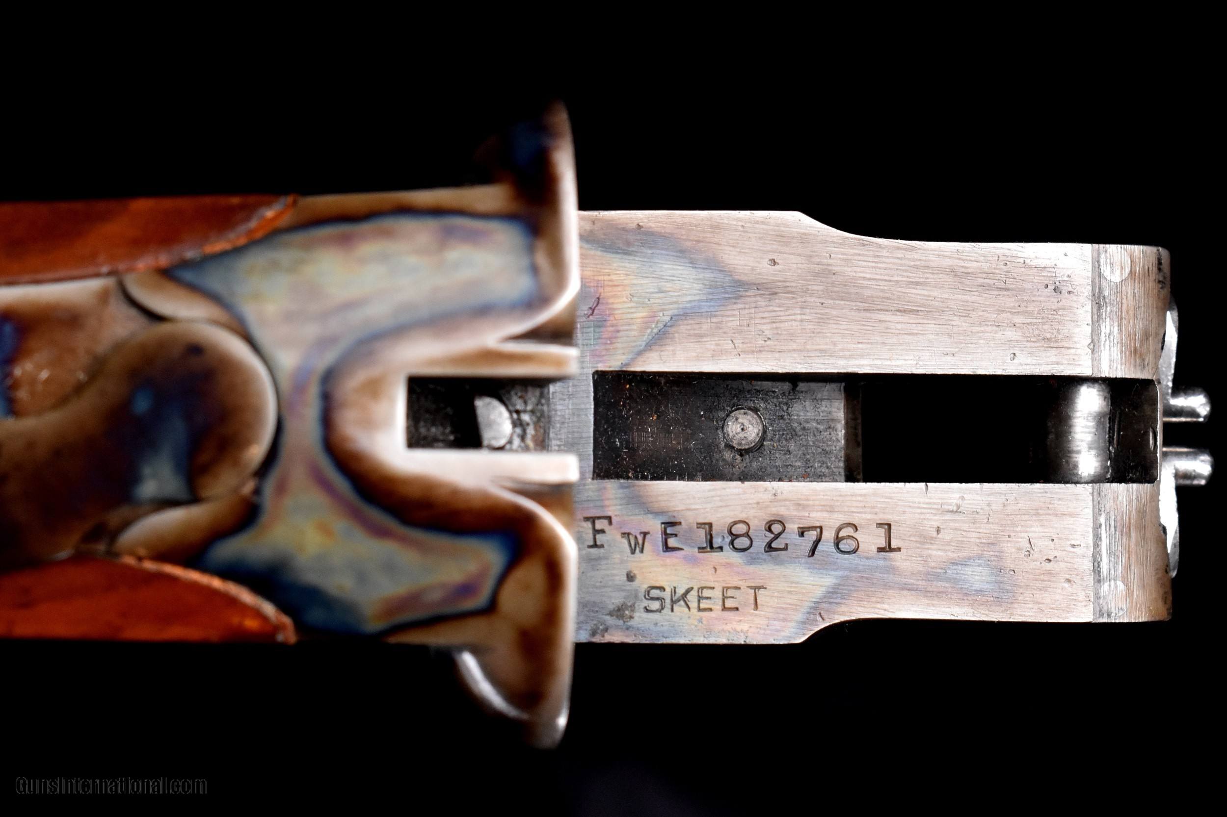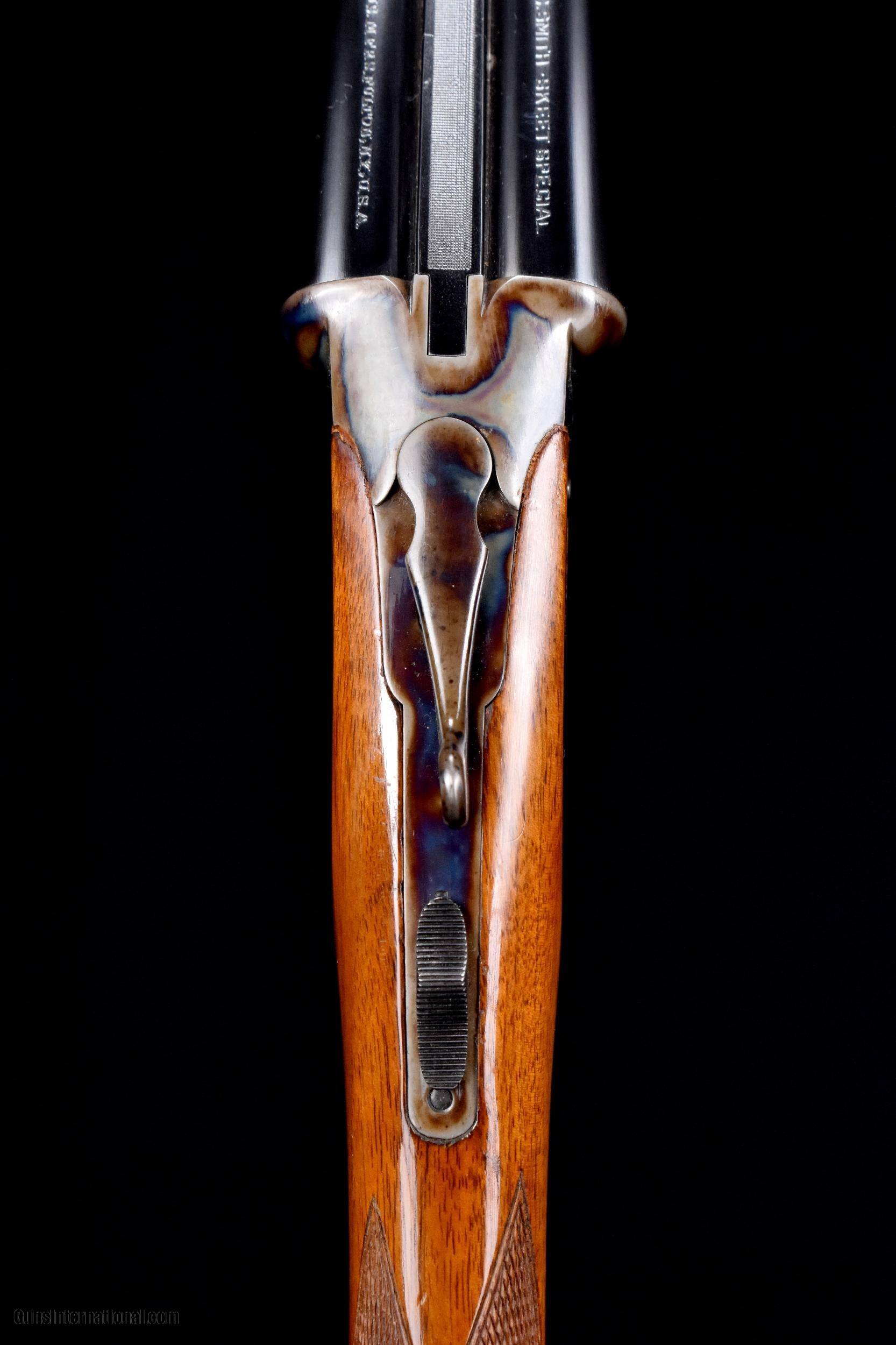 Description: Very nice and scarce Skeet Special Grade L.C. Smith. This gun made with 26" barrels, original beavertail forend. Case hardened action engraved in Skeet Special Grade pattern. Made with Hunter One SST, Auto Ejectors, and non-auto safety. Straight grip buttstock checkered in point pattern and terminates with original checkered butt. Overall, the gun remains in near mint condition and faithfully restored. The gun retains virtually all of its restored finish to all wood and metal surfaces and has only the most minor of subsequent handling marks. Bores are bright and shiny. Mechanics are crisp. This fine Skeep Special is priced at $3495 plus shipping to your FFL. Please dont hesitate to contact me with any questions or reasonable offers at (704) 280-2382 or via PM on this. SOLD Curio/Relic: Yes Shotgun Gauge: 16 Gauge Manufacturer: L.C. Smith Model: Skeet Special Serial Number: FWE 182761 Barrel Length: 26” Chambers: 2-1/2” Condition: Near mint as restored Metal Condition: Near mint as restored Wood Condition: Near mint as restored Bore Condition: Bright and shiny Triggers: Hunter One Stock Comb: 1-1/2” Stock Heel: 2-1/2” Fore End: Beavertail Butt Pad: Orig. Checkered butt LOP: 14-3/8” Weight: 6lbs 11oz Choke Left: .008 Choke Right: .008 Minimum Wall Thickness Left: Over .025 Minimum Wall Thickness Right: Over .025 |