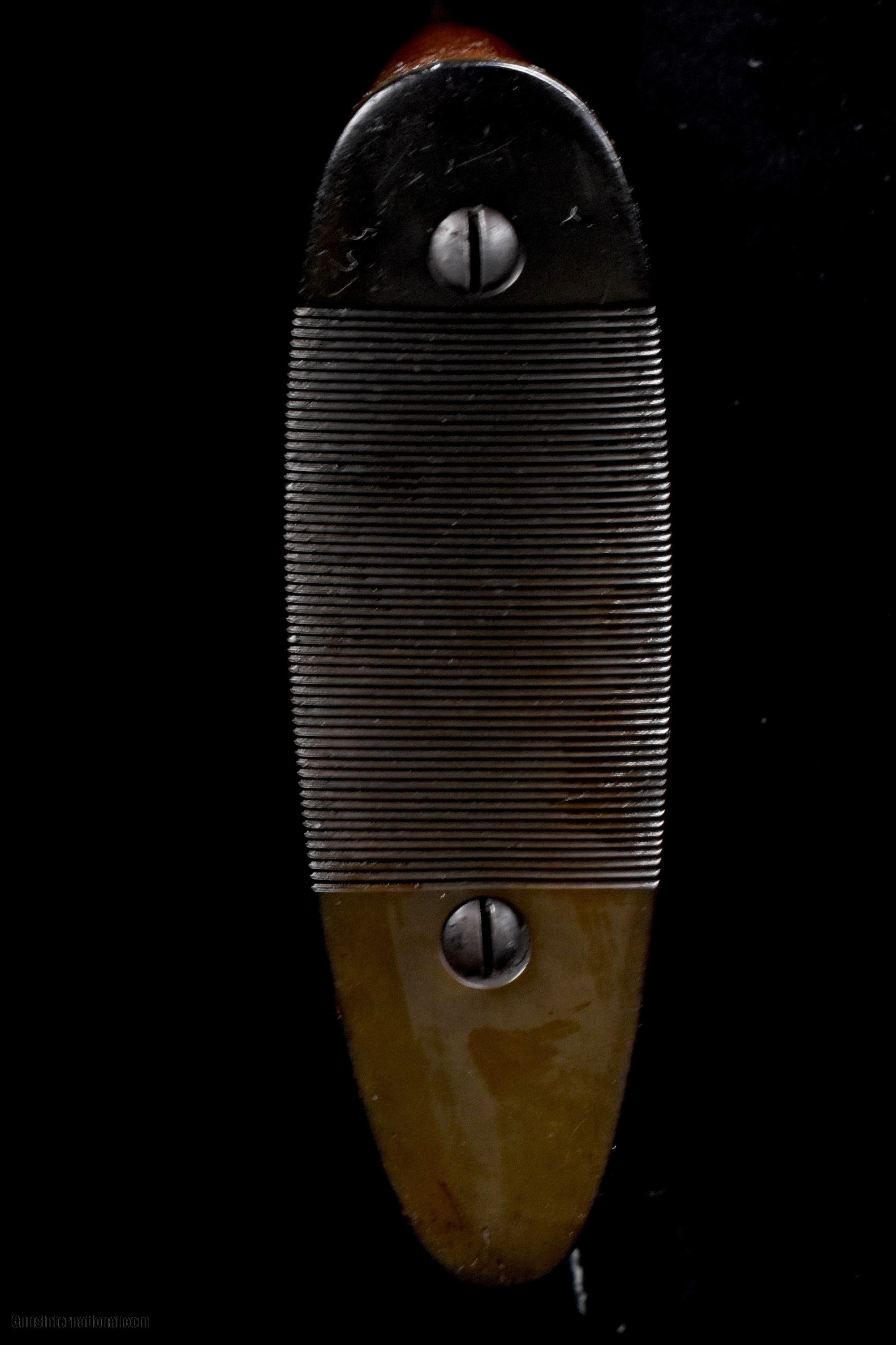 Description: Beautiful high original condition L.C. Smith 2E 12ga gun made with 30" fluid steel barrels, double triggers, auto ejectors, auto safety. Checkered splinter forend. Case hardened action is engraved in standard Grade 2 pattern with birds in circles on both sides with light scroll. Checkered capped pistol grip buttstock is nicely figured and terminates with the original buttplate which has turned a pleasing chocolate color. The gun remains in excellent original condition with more than 90% bold original case color. Barrels are excellent and original and retain about 97% original blue. Stocks are sound and retain more than 97% original finish with only minor impressions. Bores are bright and shiny and mechanics are crisp. This fine Smith is priced at $3195 plus shipping to your FFL. Please dont hesitate to contact me with any questions or reasonable offers at (704) 280-2382 or via PM on this site. SOLD Curio/Relic: Yes Shotgun Gauge: 12 Gauge Manufacturer: L.C. Smith Model: 2E Serial Number: 202,935 Barrel Length: 30” Chambers: 2-3/4” Ejectors: Yes Condition: Excellent Metal Condition: Excellent Wood Condition: Excellent Bore Condition: Bright and shiny Triggers: Double triggers Stock Comb: 1-5/8” Stock Heel: 2-5/8” Fore End: Splinter Butt Pad: Original Buttplate LOP: 14” Weight: 7lbs even Choke Left: .036(Full) Choke Right: .019(Modified) Minimum Wall Thickness Left: Over .025 Minimum Wall Thickness Right: Over .025 |