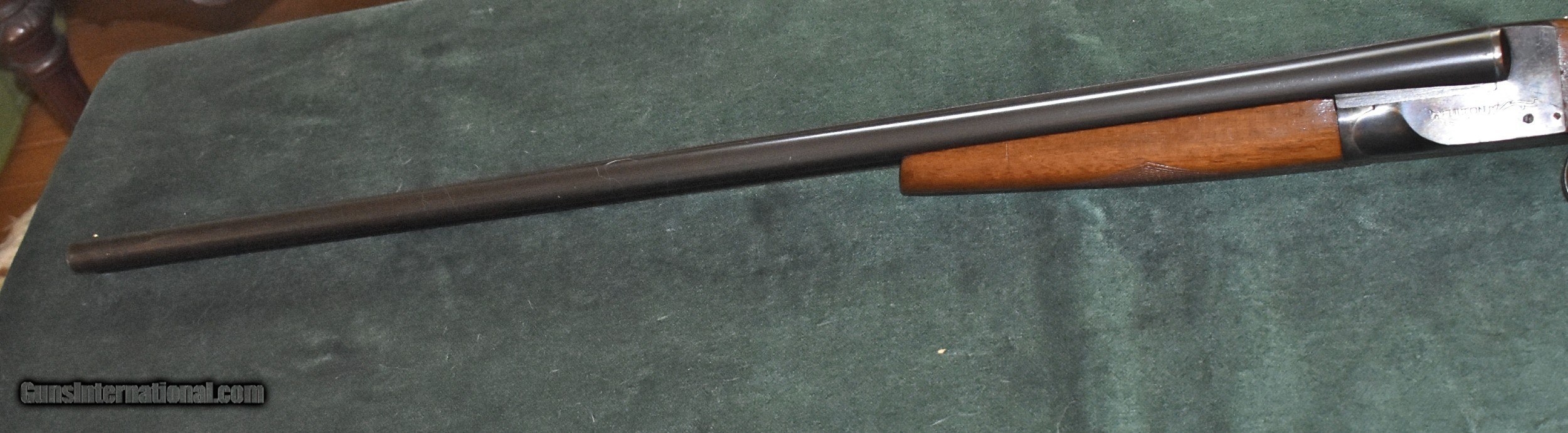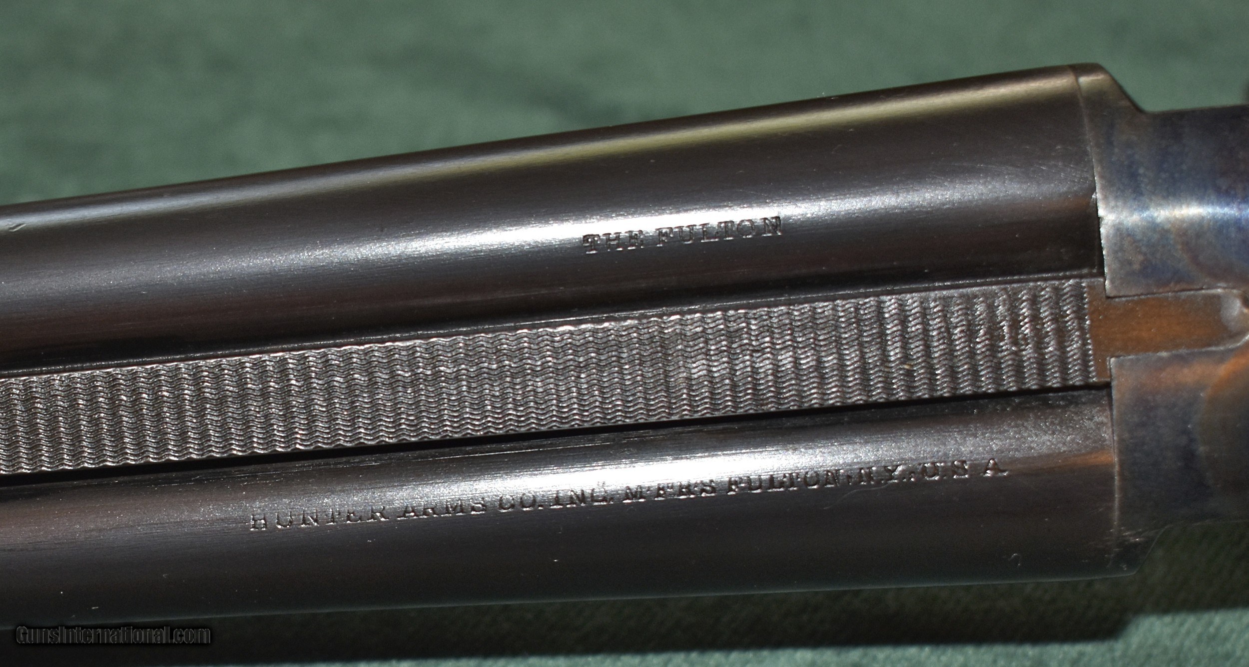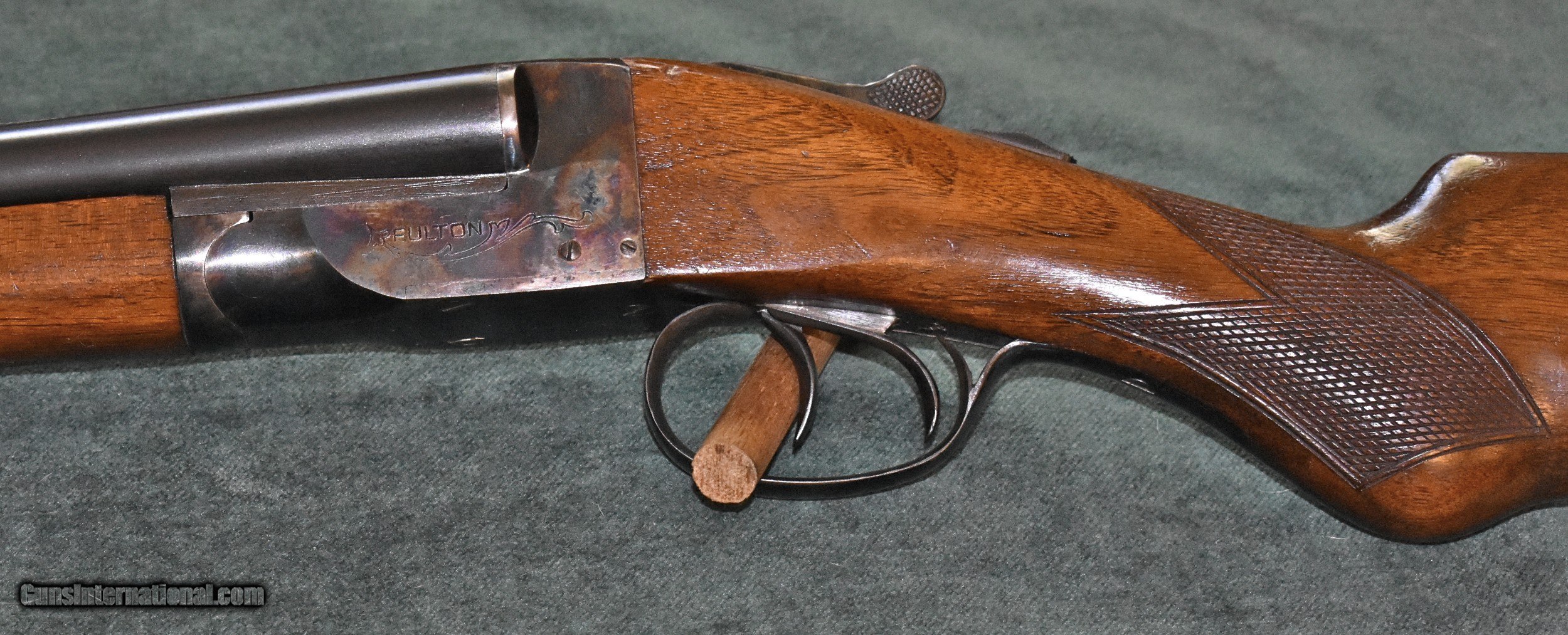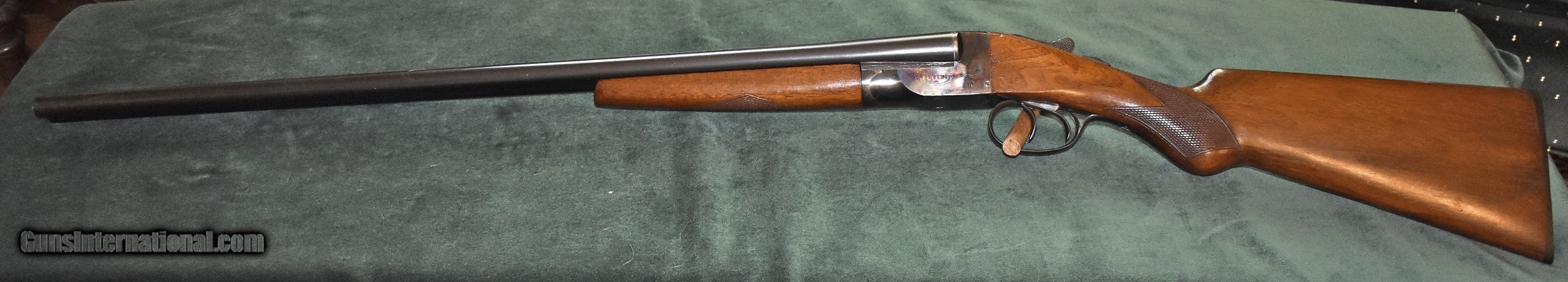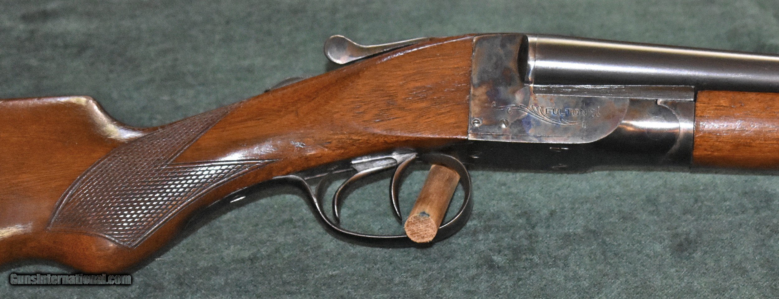 Description: Twenty gauge "The Fulton" built by Hunter Arms who also built the L.C.Smith shotguns.Built around 1938,this gun is in really outstanding all original condition.It retains 100% of the original case colors and barrel blue.It retains 99% of the original stock finish.The 28" barrels have mint bores and are choked modified (.015") and full (.030").The gun has been shot very little.The top lever is far to the right.The barrels are on face and lock up tighly with no play.The Fulton was an economy model and therefore they saw very hard use.It is very rare to find one in this kind of conditon.At 6-8 this gun is light enough to make a great walking pheasant gun.It would also make a great dove or clays gun.A good value in an American made double for shooter or collector.C&R eliglble. SOLD Curio/Relic: Yes Shotgun Gauge: 20 Gauge Manufacturer: Hunter Arms Model: The Fulton Serial Number: 172700 Barrel Length: 28 Chambers: 23/4 Ejectors: extractors Condition: excellent Metal Condition: mint Wood Condition: excellent Bore Condition: mint Barrel Type: Armor Steel Action: double barrel Triggers: double Stock Dimensions: 141/8"x11/2"x21/2 Fore End: splinter Butt Pad: factory buttplate Weight: 6-8 Manufacture Date: 1938 Choke Left: full (.030") Choke Right: modified (.015") |
