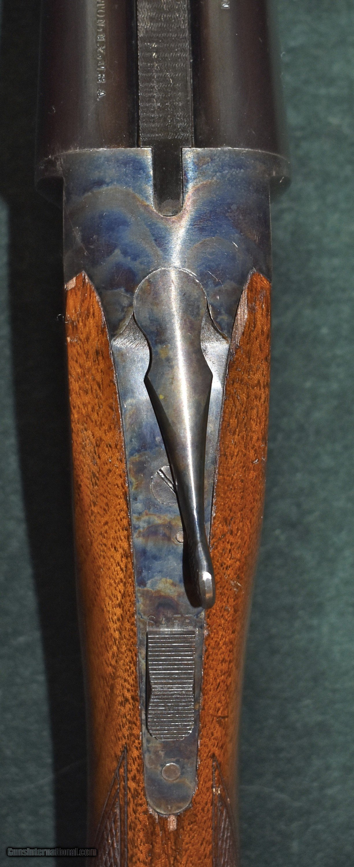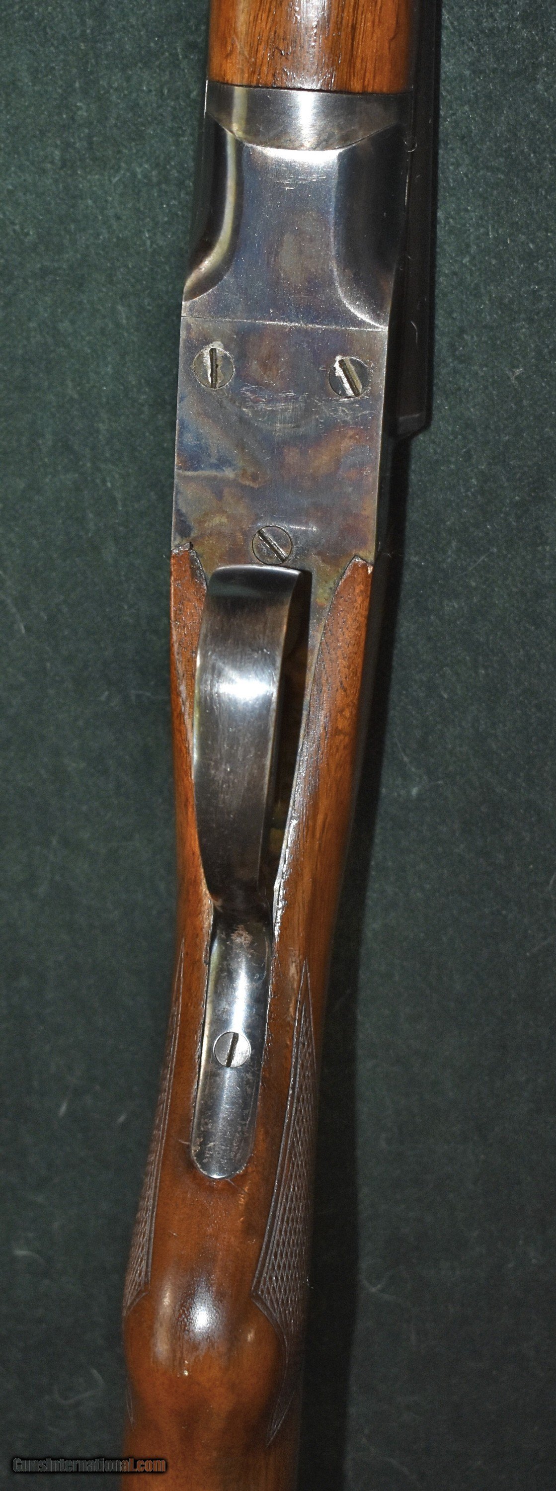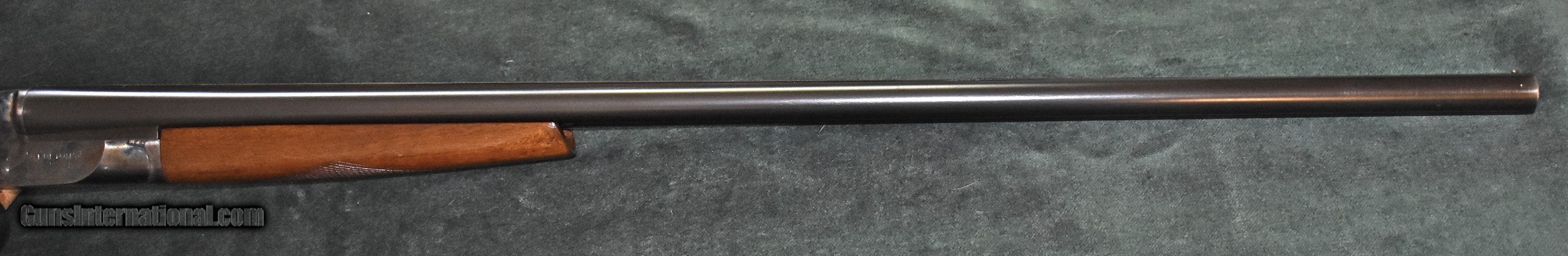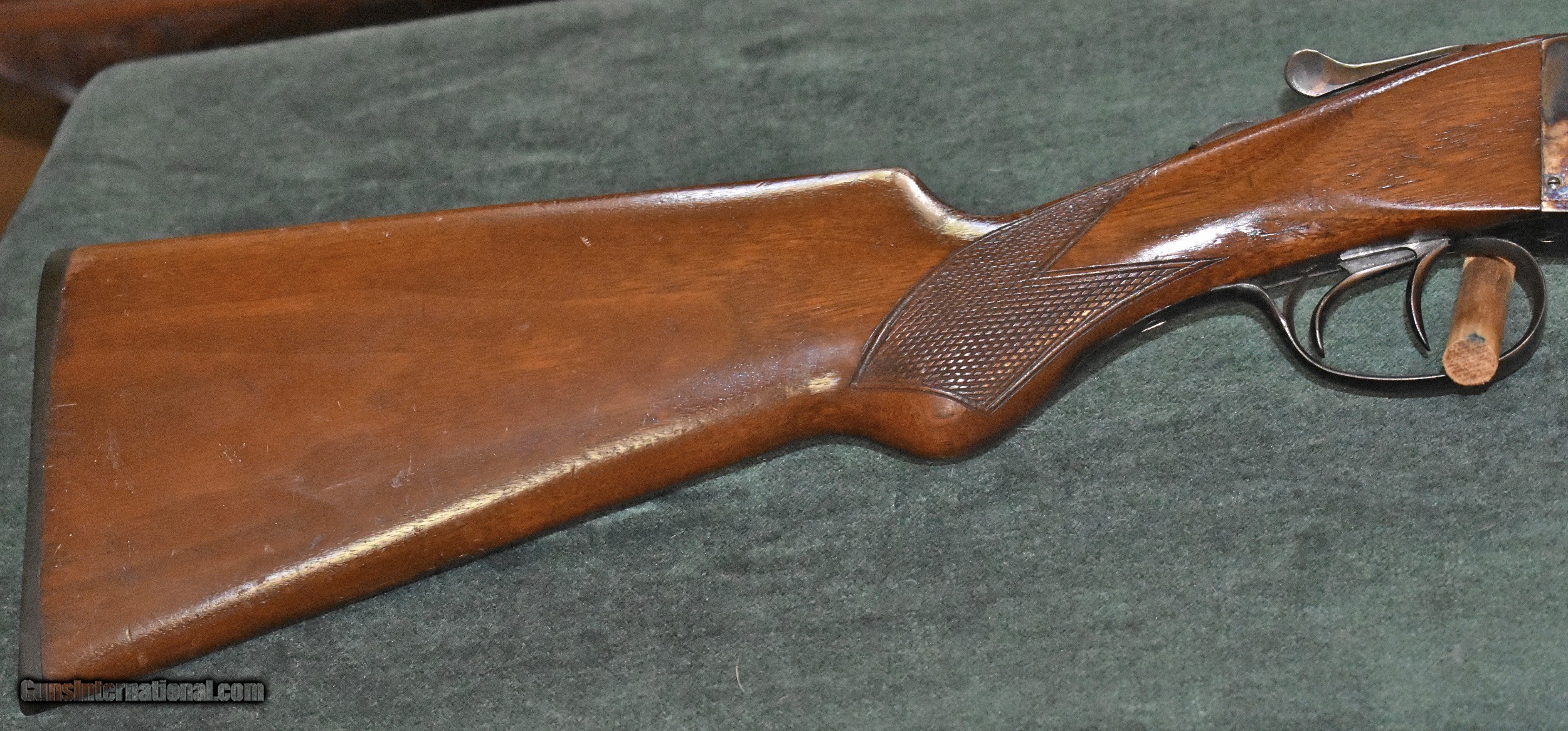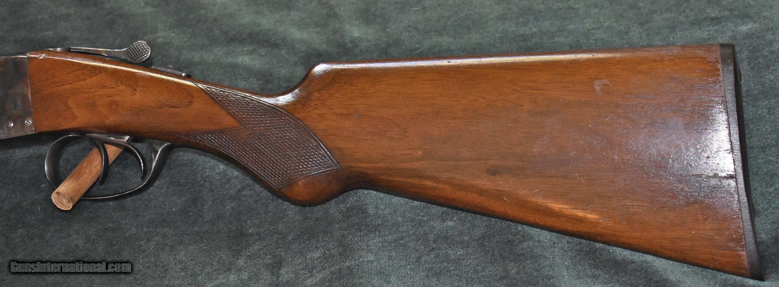 Description: Twenty gauge "The Fulton" built by Hunter Arms who also built the L.C.Smith shotguns.Built around 1938,this gun is in really outstanding all original condition.It retains 100% of the original case colors and barrel blue.It retains 99% of the original stock finish.The 28" barrels have mint bores and are choked modified (.015") and full (.030").The gun has been shot very little.The top lever is far to the right.The barrels are on face and lock up tighly with no play.The Fulton was an economy model and therefore they saw very hard use.It is very rare to find one in this kind of conditon.At 6-8 this gun is light enough to make a great walking pheasant gun.It would also make a great dove or clays gun.A good value in an American made double for shooter or collector.C&R eliglble. SOLD Curio/Relic: Yes Shotgun Gauge: 20 Gauge Manufacturer: Hunter Arms Model: The Fulton Serial Number: 172700 Barrel Length: 28 Chambers: 23/4 Ejectors: extractors Condition: excellent Metal Condition: mint Wood Condition: excellent Bore Condition: mint Barrel Type: Armor Steel Action: double barrel Triggers: double Stock Dimensions: 141/8"x11/2"x21/2 Fore End: splinter Butt Pad: factory buttplate Weight: 6-8 Manufacture Date: 1938 Choke Left: full (.030") Choke Right: modified (.015") |