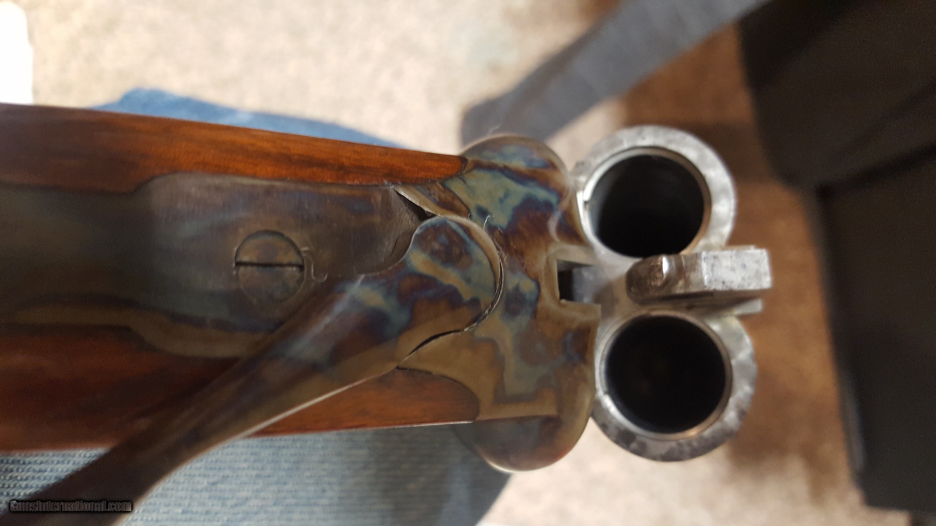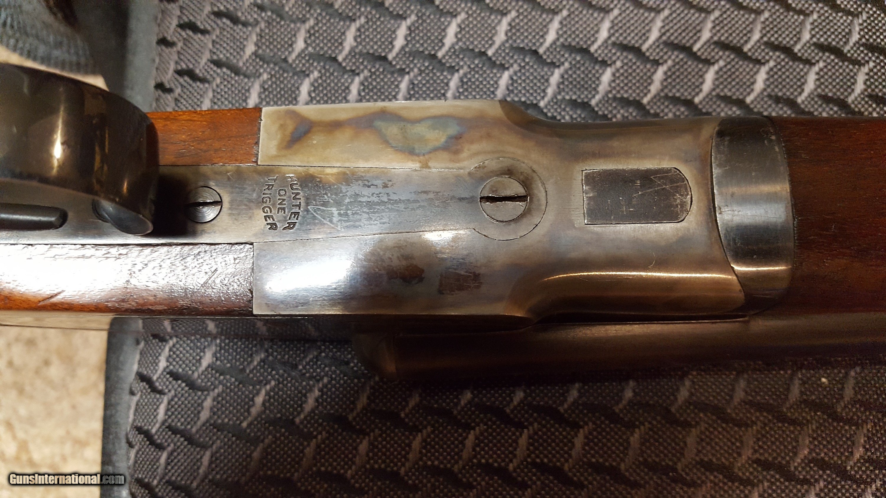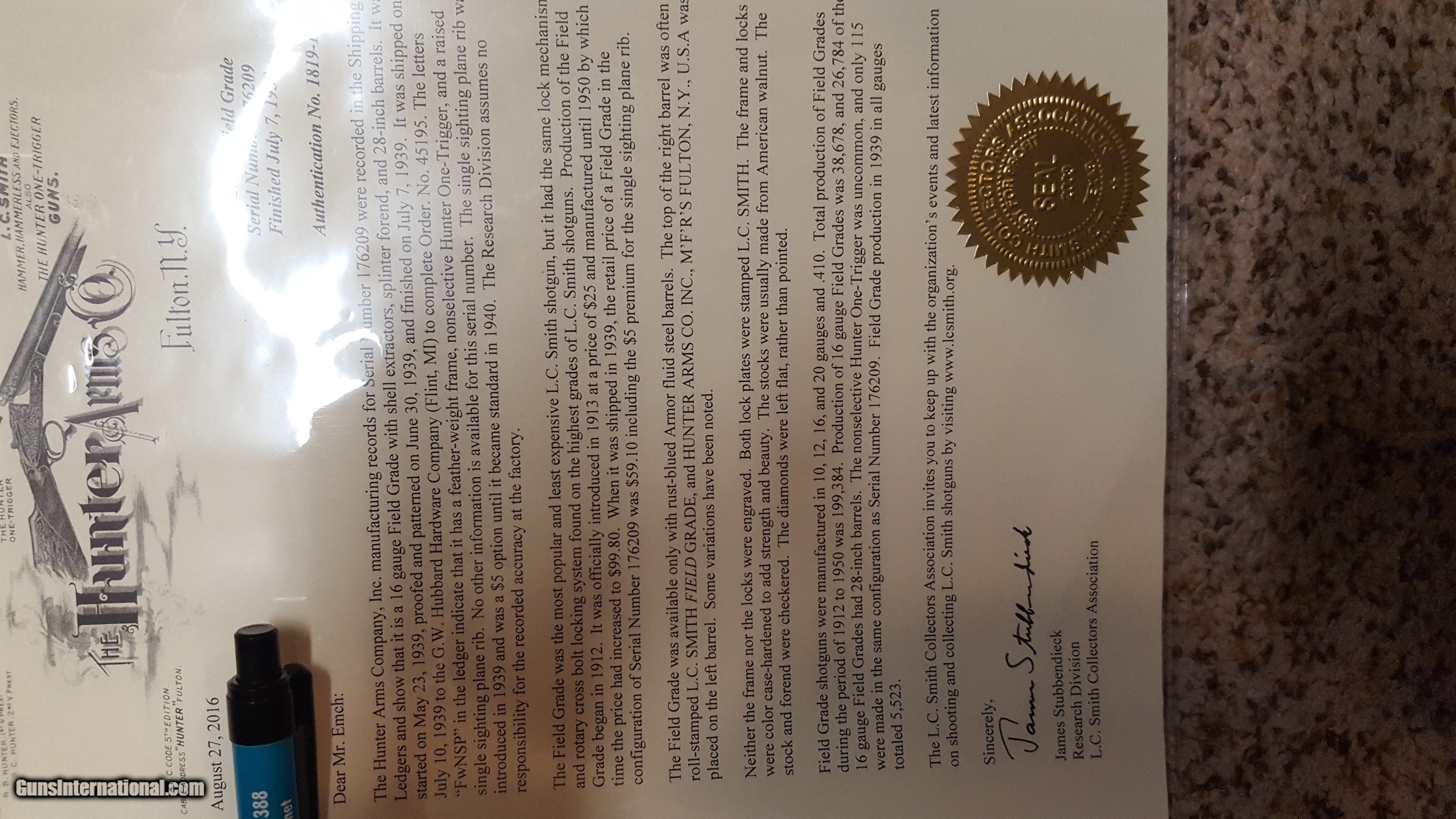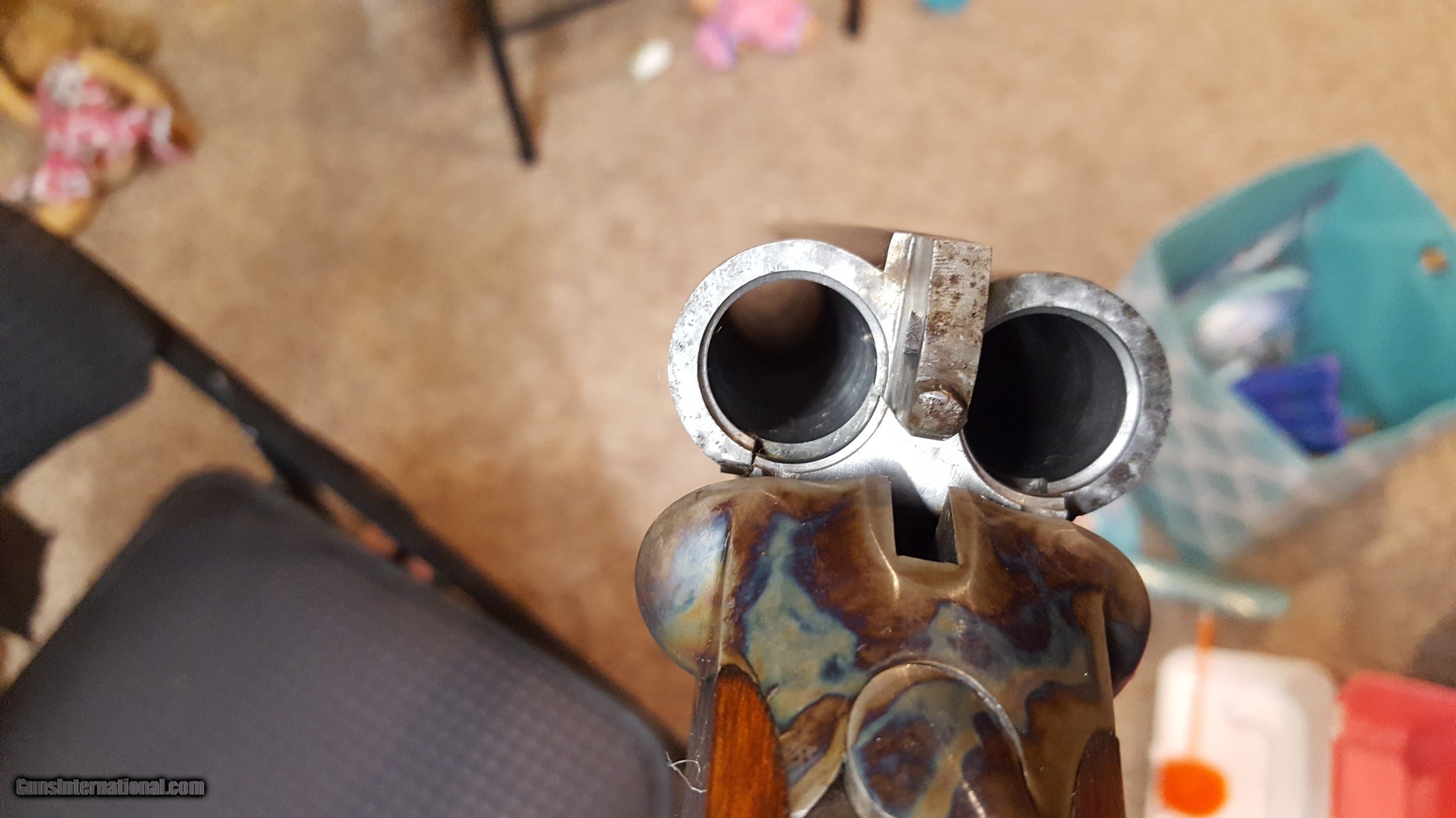 Description: This is a great gun, a rare single non-selective trigger 16 field, one of only 115! Wonderful bright color I think especially nice. Pics tell the tale. This gun has no cracks but does have a little crackling in the varnish on buttstock which I tried to show in pics. Still has polish marks on breech face which always indicates a high condition gun. 28 inch tubes choked IC/IM. 1 1/2 2 1/4 drops with 14 pull. First year for the plane rib wich was a five dollar option the buyer paid. Made in 1939. Included is a factory letter confirming entire gun. Small spot of bluing loss near muzzle, possibly from blood. Great gun in a great gauge! Call 330-466-1092 with questions. thanks for your interest. SOLD Curio/Relic: Yes Shotgun Gauge: 16 Gauge Serial Number: 176209 Barrel Length: 28 Ejectors: no Bore Condition: mint Barrels: 28 Triggers: single NS Butt Pad: plate LOP: 14 Choke Left: IM Choke Right: IC |