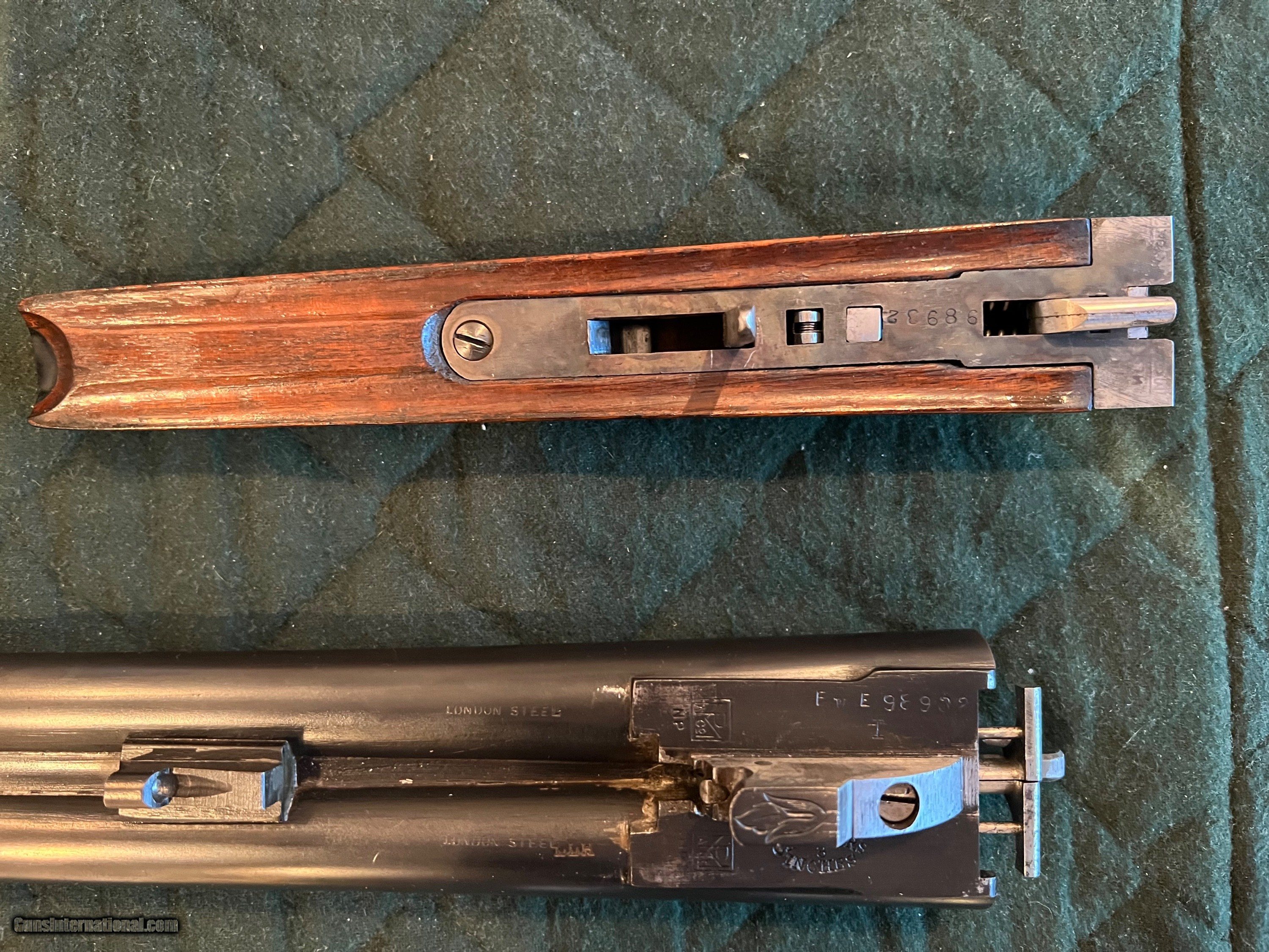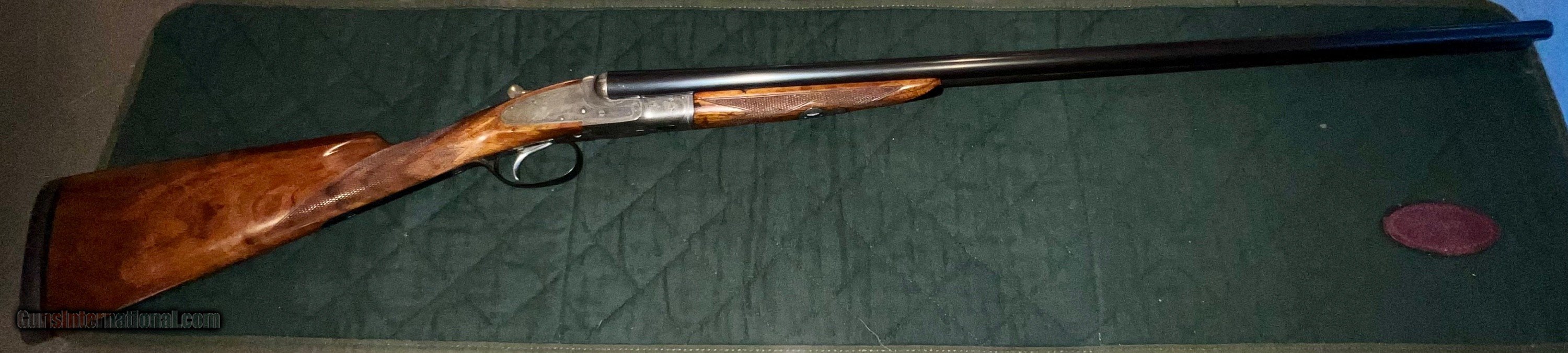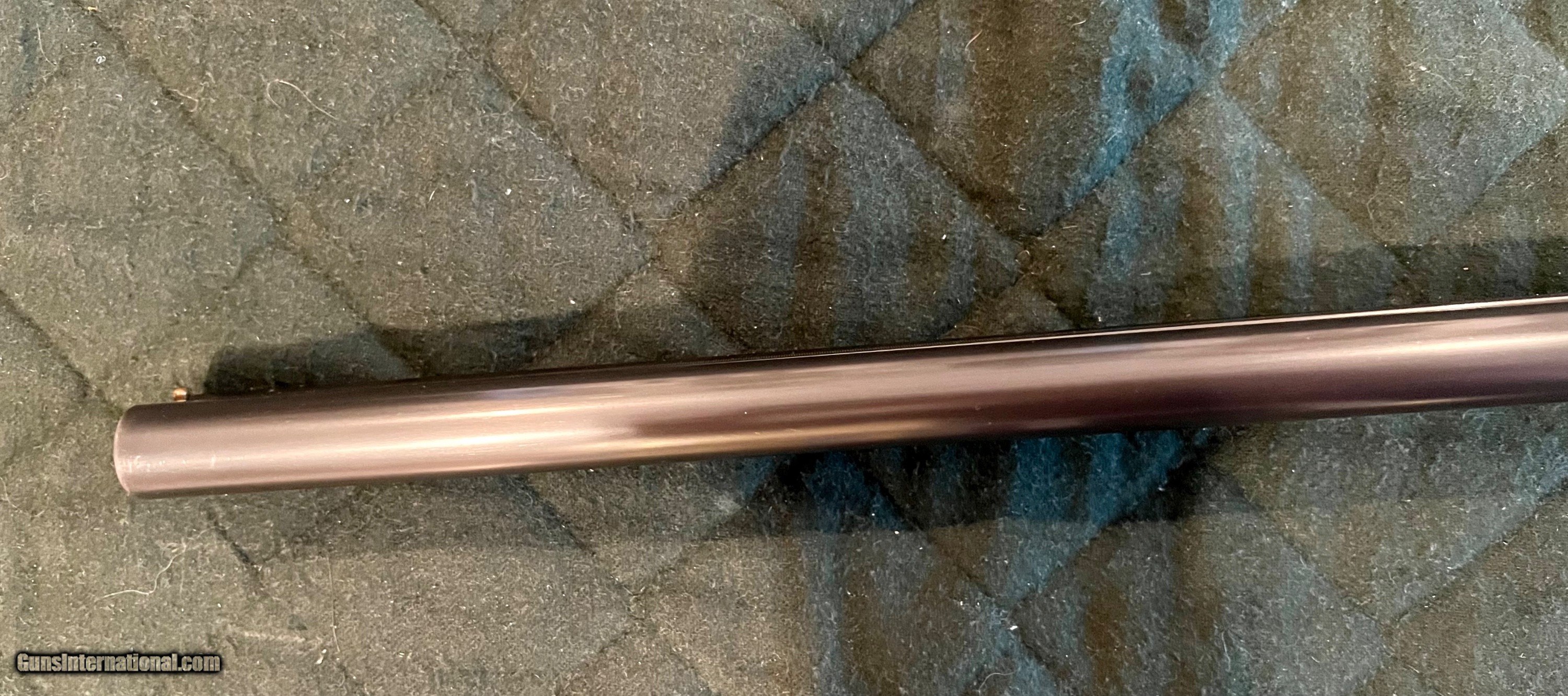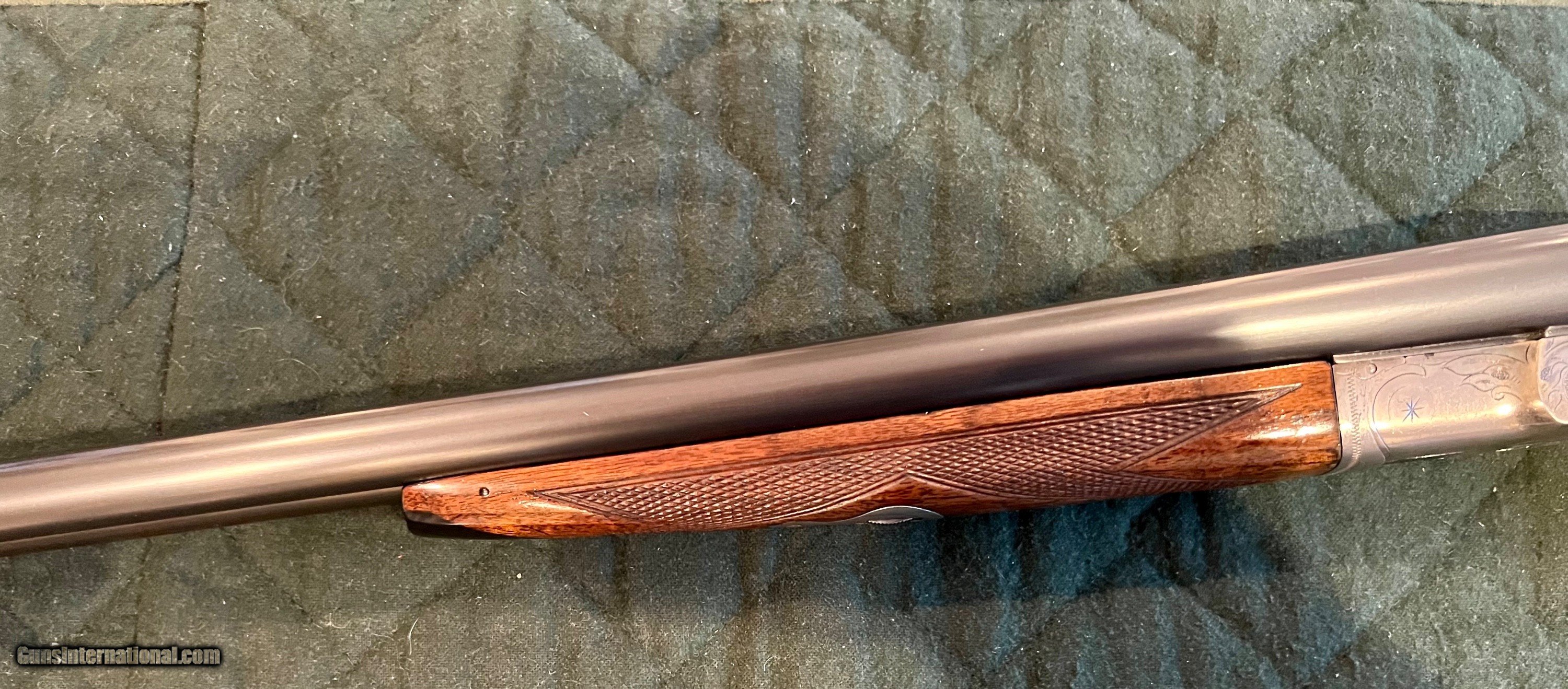 Description: Very Nice L C Smith 20 Gauge Ideal Grade shotgun with 30" Barrels and very rare 3" Chambers. Barrels are clearly marked accordingly. English stock, Splinter forend. Re-stocked at some point. This gun has Wonderfully modern shootable dimensions including a 14 1/4" LOP over a rubber pad Drop at Comb is 1 1/2" and 2" Drop at Heel. Cased in a leather and canvas case which has a reproduction label. Barrels are tight on face, choked Full and Full. Has factory Hunter One Single Trigger. Case color finish thinning on receiver, and blue on barrels, trigger guard and tang is better than 95%. Gun weighs 6lbs 9.2 Ounces. Nicely balanced, elegant 20 Gauge with great proportions. Thanks for your interest. Please see my other ads. SOLD Manufacturer: L C Smith Model: Ideal Grade Barrel Length: 30 Chambers: 3 Ejectors: yes Condition: Excellent Bore Condition: perfect Action: Side by Side Triggers: Hunter One- Factory Single Stock: English Fore End: Splinter Butt Pad: Rubber LOP: 14.25 Weight: 6lbs 9 oz Sights: single bead Choke Left: Full Choke Right: FUll Case: Leather and Canvas |
