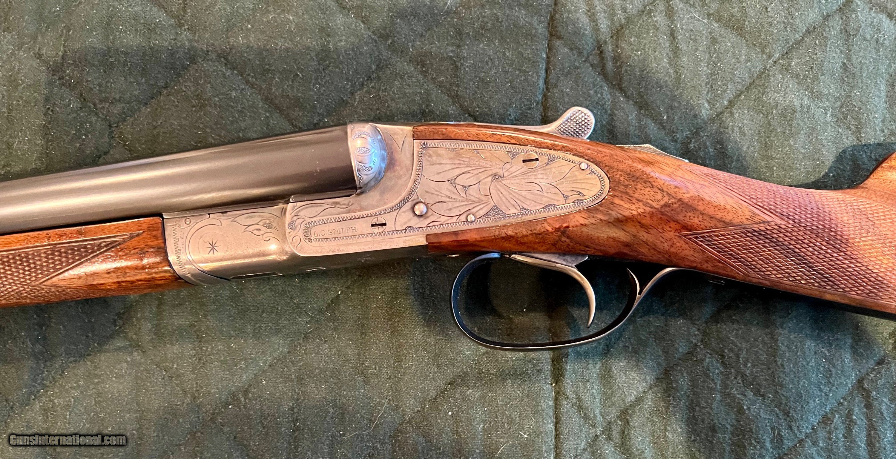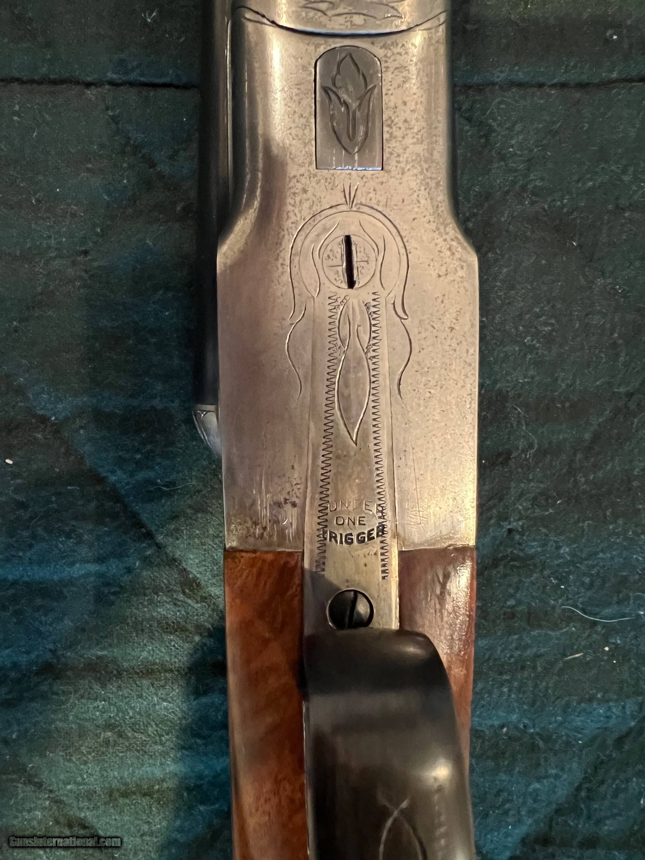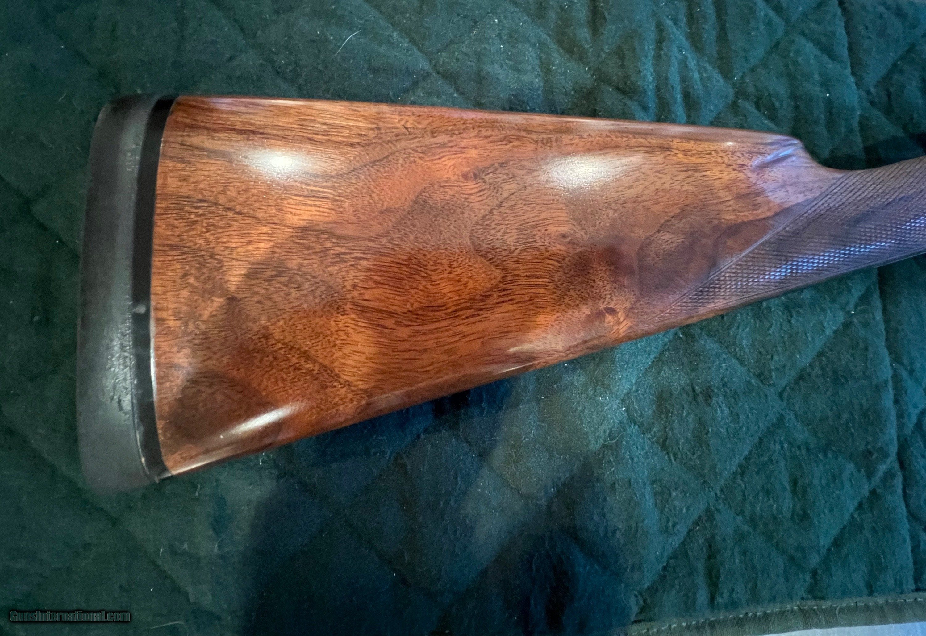 Description: Very Nice L C Smith 20 Gauge Ideal Grade shotgun with 30" Barrels and very rare 3" Chambers. Barrels are clearly marked accordingly. English stock, Splinter forend. Re-stocked at some point. This gun has Wonderfully modern shootable dimensions including a 14 1/4" LOP over a rubber pad Drop at Comb is 1 1/2" and 2" Drop at Heel. Cased in a leather and canvas case which has a reproduction label. Barrels are tight on face, choked Full and Full. Has factory Hunter One Single Trigger. Case color finish thinning on receiver, and blue on barrels, trigger guard and tang is better than 95%. Gun weighs 6lbs 9.2 Ounces. Nicely balanced, elegant 20 Gauge with great proportions. Thanks for your interest. Please see my other ads. SOLD Manufacturer: L C Smith Model: Ideal Grade Barrel Length: 30 Chambers: 3 Ejectors: yes Condition: Excellent Bore Condition: perfect Action: Side by Side Triggers: Hunter One- Factory Single Stock: English Fore End: Splinter Butt Pad: Rubber LOP: 14.25 Weight: 6lbs 9 oz Sights: single bead Choke Left: Full Choke Right: FUll Case: Leather and Canvas |