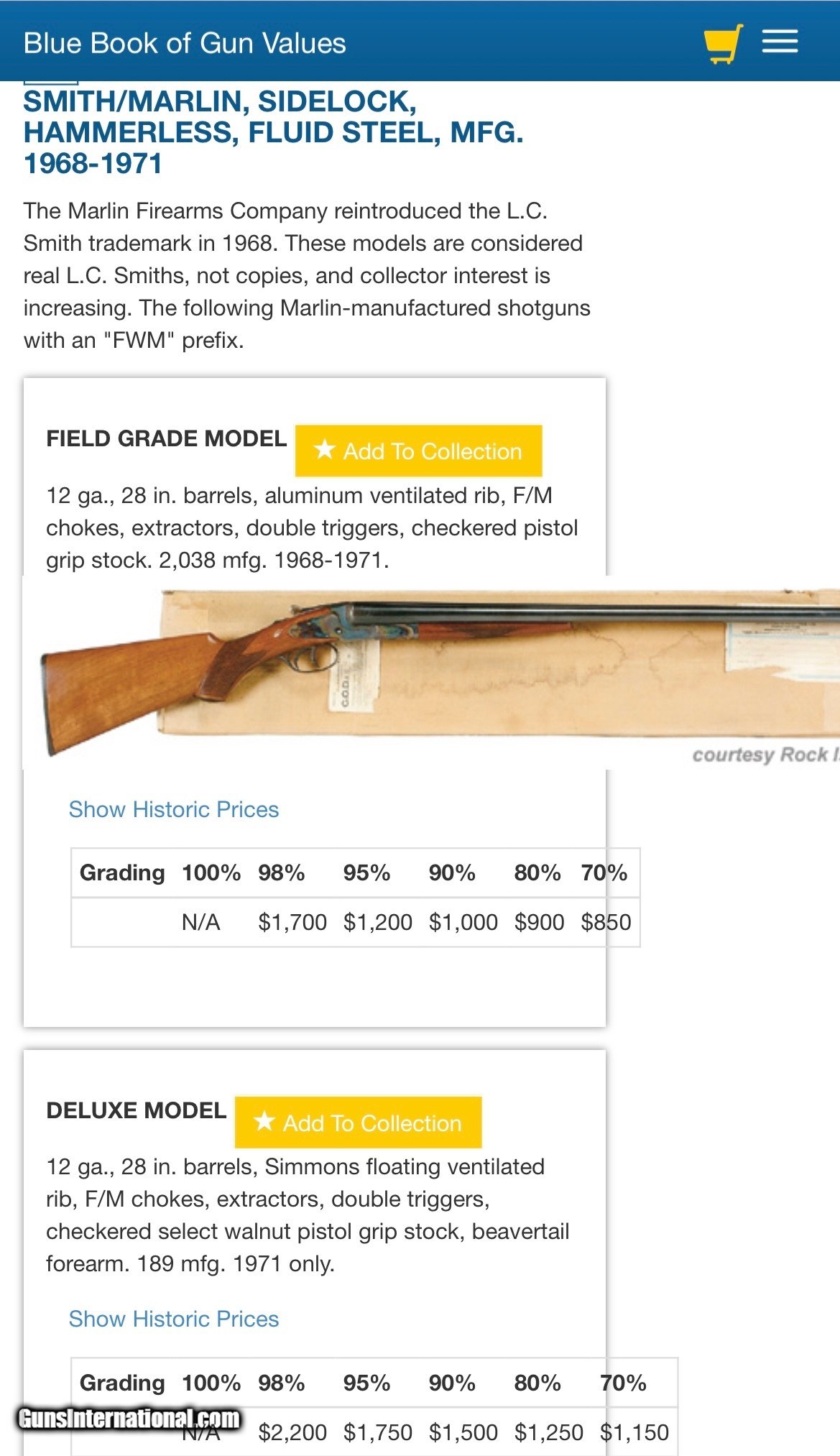 Description: The Marlin Firearms Company reintroduced the L.C. Smith trademark in 1968. These models are considered real L.C. Smiths, not copies, and collector interest is increasing. The following Marlin-manufactured shotguns with an "FWM" prefix. 12 ga., 28 in. barrels, Simmons floating ventilated rib, F/M chokes, extractors, double triggers, checkered select walnut pistol grip stock, beavertail forearm. 189 mfg. 1971 only. This SxS is serial number FMW100183 making it one of the last LC's produced. It's in excellent condition with beautiful original case coloring and finish. 28" barrels and 14" L.O.P. SALE PENDING Please call with any inquiries or for additional photos Jay Szymaszek 860-595-9515 SOLD Shotgun Gauge: 12 Gauge Manufacturer: LC Smith by Marlin Model: Deluxe Serial Number: FMW100183 Condition: Excellent Metal Condition: Excellent Wood Condition: Excellent Bore Condition: Excellent LOP: 14 Manufacture Date: 1971 Choke Left: Full Choke Right: Mod |