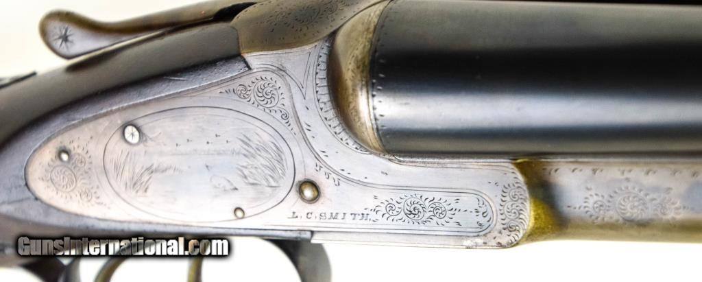 Description: Fine condition - Engraved L.C. Smith 12 guage double barrel shotgun with matching extra barrel set - shotgun - 26" round, concave matte solid rib barrel - Beavertail checkered walnut forearm with case hardware and serrated push button release, accompanying a English style checkered walnut stock equipped with a brown White Line Pachmayr recoil pad - forearm has a hairline crack running horizontal with forearm on left side and few minor handling marks, while stock has .5" hairline crack to each side of wrist - retains about 80% vivid case to receiver with greatest loss to bottom front of frame balance to soft grey patina - retains about 97%+ blue finish to trigger guard with loss to sharp edges - barrels retain about 98%+ blue finish to barrels with loss to muzzle and sharp edges of rib, possibly professional reblue - few areas of light surface pitting to barrels. Bore are bright and shiny through out with no pits or rust - Markings: crisp & legible- engraved receiver of wildlife fowl scenes on lock plates, light scrollwork with simply line designs and "L.C. SMITH" in block letters - water table marked with patent dates of July 60 & 5-66 - Sights: dual white bead sights - hammerless - double triggers - tang safety - top-break lever - tang mounted automatic safety. Includes a Hunter Arms Co. of Fulton, N.Y. matching extra double barrel complete with forearm; 30" SxS barrels with solid concave matte rib - both barrels retain about 98% blue finish with very little visible wear - sights are of white bead at front and mid-barrel - barrels marked with serial # "201967/3E", as well as Nitro proof steel trade mark - barrel assembly complete with walnut Beavertail forend with serrated push release - forearm checkered with in a "W" design - forearm marked with matching serial number and grade - forearm hardware is finished in case, however appears muted and balance to soft grey patina, hardware is finalized with engravings of scrollwork and single line designs - overall condition of extra barrel set and forearm is Excellent with Excellent bright and shiny bore, forearm wood Excellent condition with very little visible wear - From estate of Dr. Fred J. Rinehart - Yr. Mfg.: 1904 - SN: 201967. Choke is not marked on the barrels. Caliper measurements are: 30 Inch barrel: Left; .697" equating to about Improved /modified choke. Right; .693 equating to a full choke. 26 Inch barrel, Left .728 inch Right .728 inch both equating to about cylinder/skeet choke. Both barrel sets have their own wooden forearm. Ships to FFL or C&R license holder . Seller accepts cashiers check, personal check or money order. SOLD Shotgun Gauge: 12 Gauge Manufacturer: L. C. Smith Model: 3 E Serial Number: 201967 Caliber Info: 12 Ga. Bore: Excellent Chambers: Excellent Ejectors: Excellent Condition: Very Good Metal Condition: Very good Wood Condition: Good Bore Condition: Excellent Barrels: Excellent Barrel Type: SXS Action: Break Triggers: 2 Gauge Info: 12 Stock: Wood Manufacture Date: 1904 |