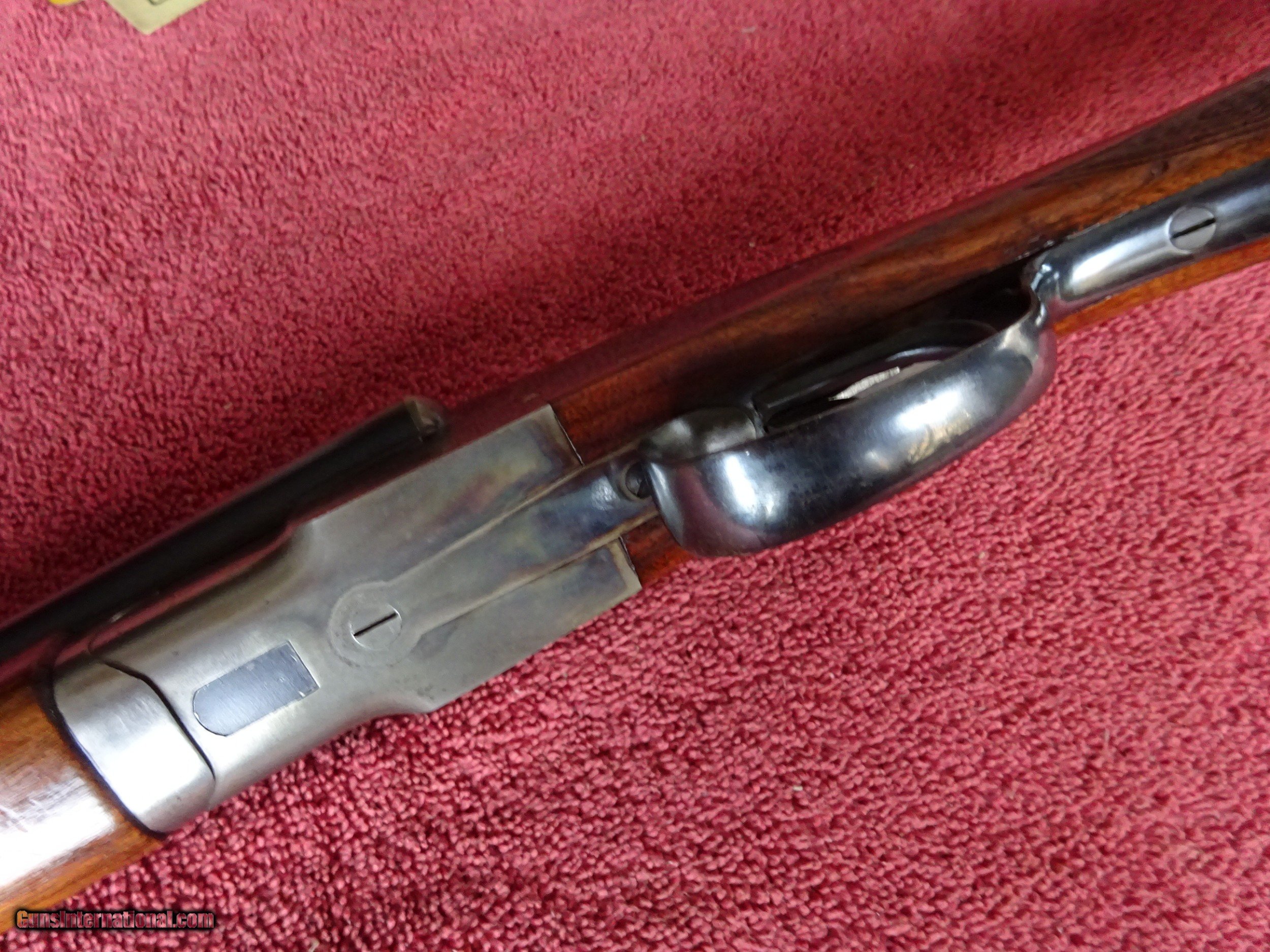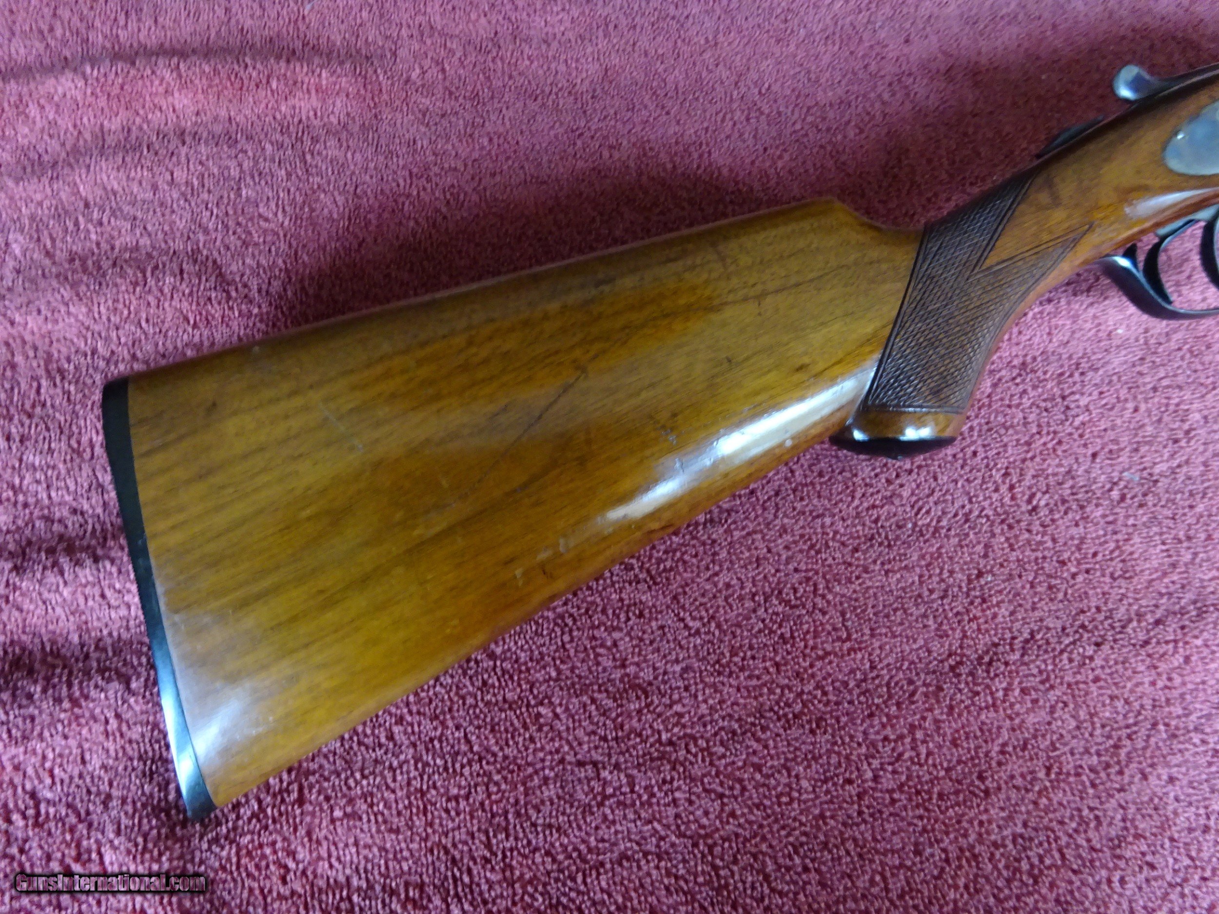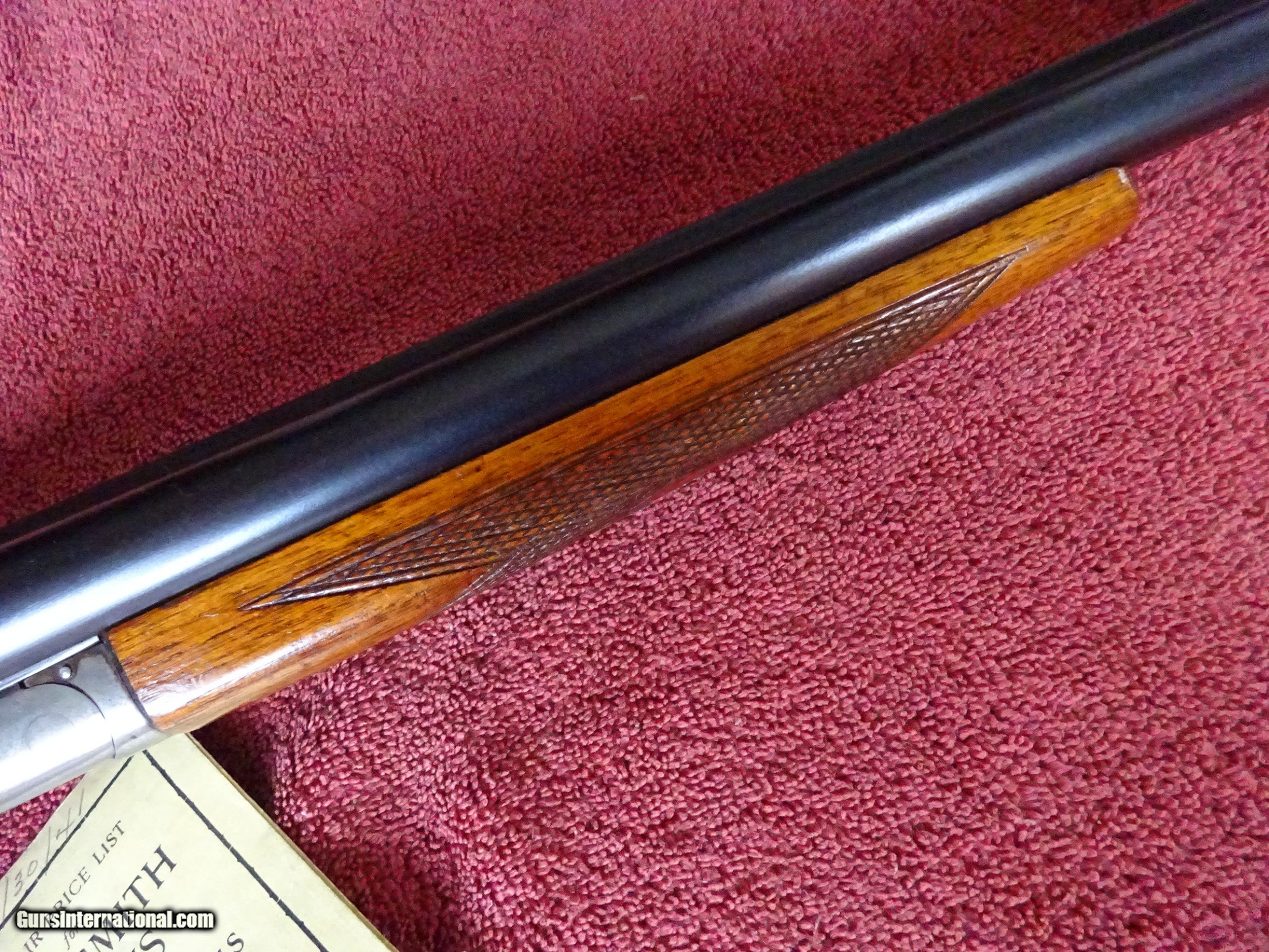 Description: L C SMITH, HUNTER ARMS, FIELD GRADE 20 GAUGE. AUTOMATIC EJECTORS, 26" BARRELS, SOLID RAISED RIB, TWIN SIGHTS, IMCYL. AND MODIFIED, 1 3/4" CHAMBERS, 100% BLUE, MIRROR PERFECT BORES. FEATHERWEIGHT FRAME WITH BOLD VIVID CASE COLOR, TOP LEVER TO THE FAR RIGHT, TIGHT AS NEW. PISTOL GRIP STOCK, SPLINTER FOREARM, FINE CHECKERING, EXCELLENT WOOD WITH NORMAL HANDLING MARKS IN THE VARNISH. ORIGINAL GRIP CAP AND BUTTPLATE, 1 3/8" X 2 1/2" X 14", 6 1 /2 POUNDS. 100% ORIGINAL CONDITION, INCLUDES ORIGINAL HANGTAG. MADE IN 1941. $2500.00 + $50.00 Insured shipping to an FFL address. See all Pats gun listings on this site! We also have hundreds of pieces of ORIGINAL gun company advertising & memorabilia available for sale on our site SPORTINGCOLLECTIBLES. We have no reprints or reproductions. Email for more information. SOLD Curio/Relic: Yes |