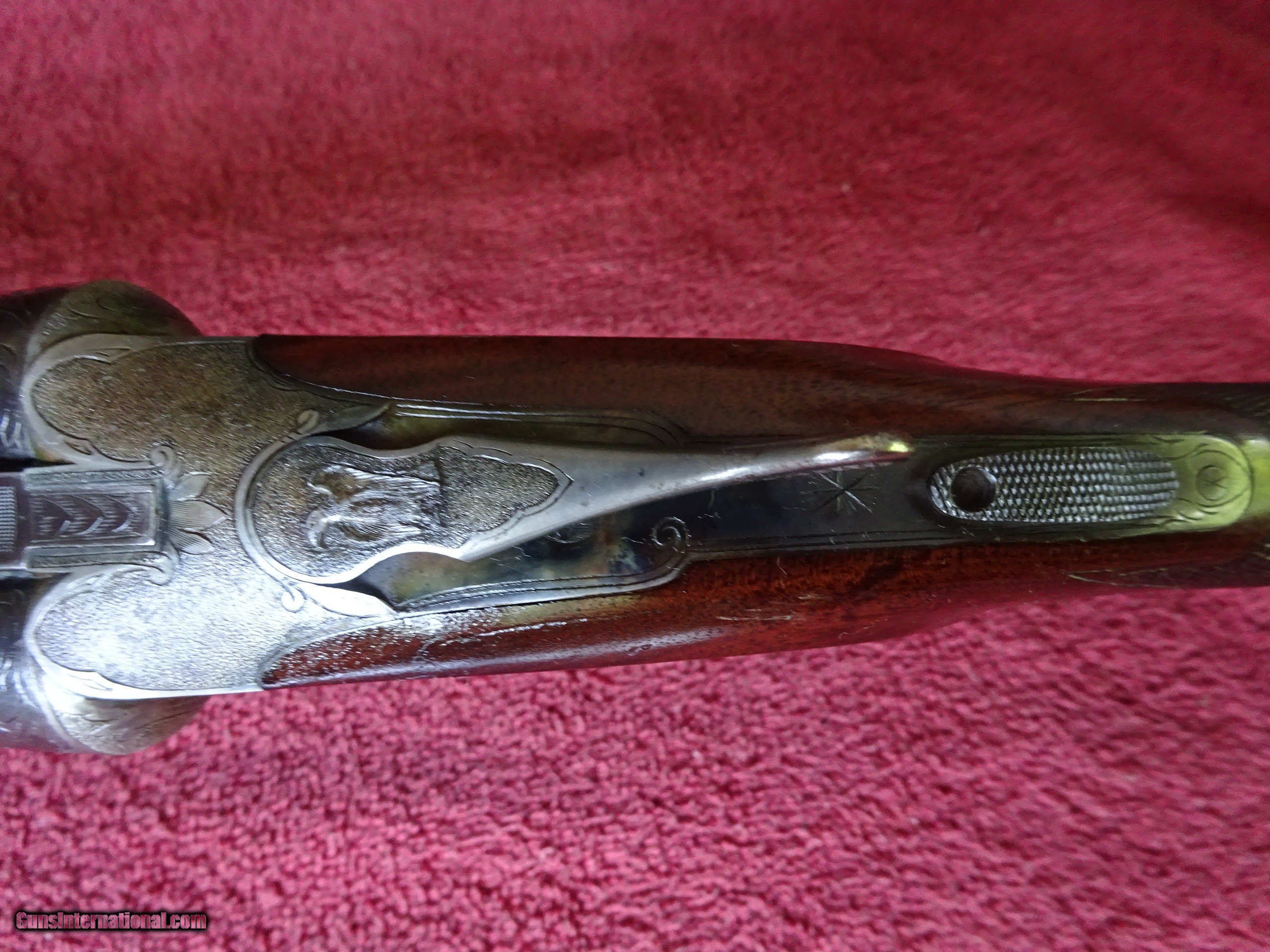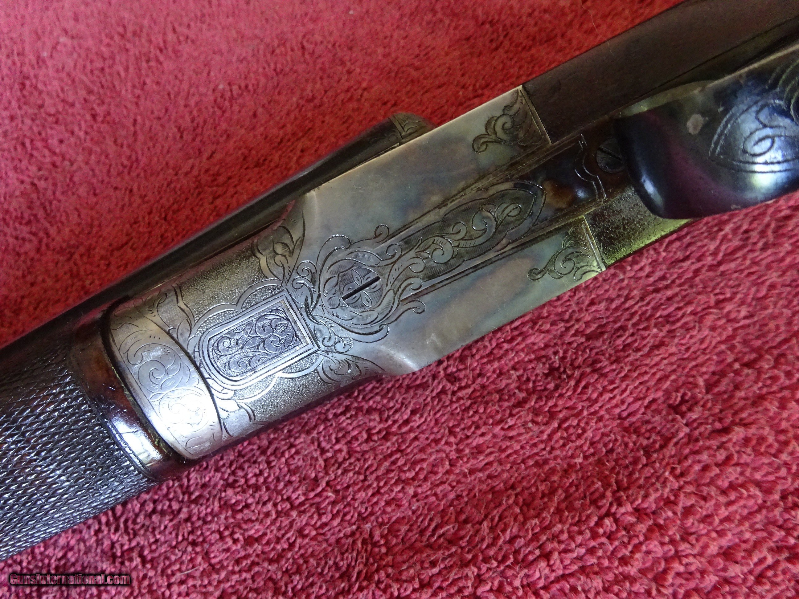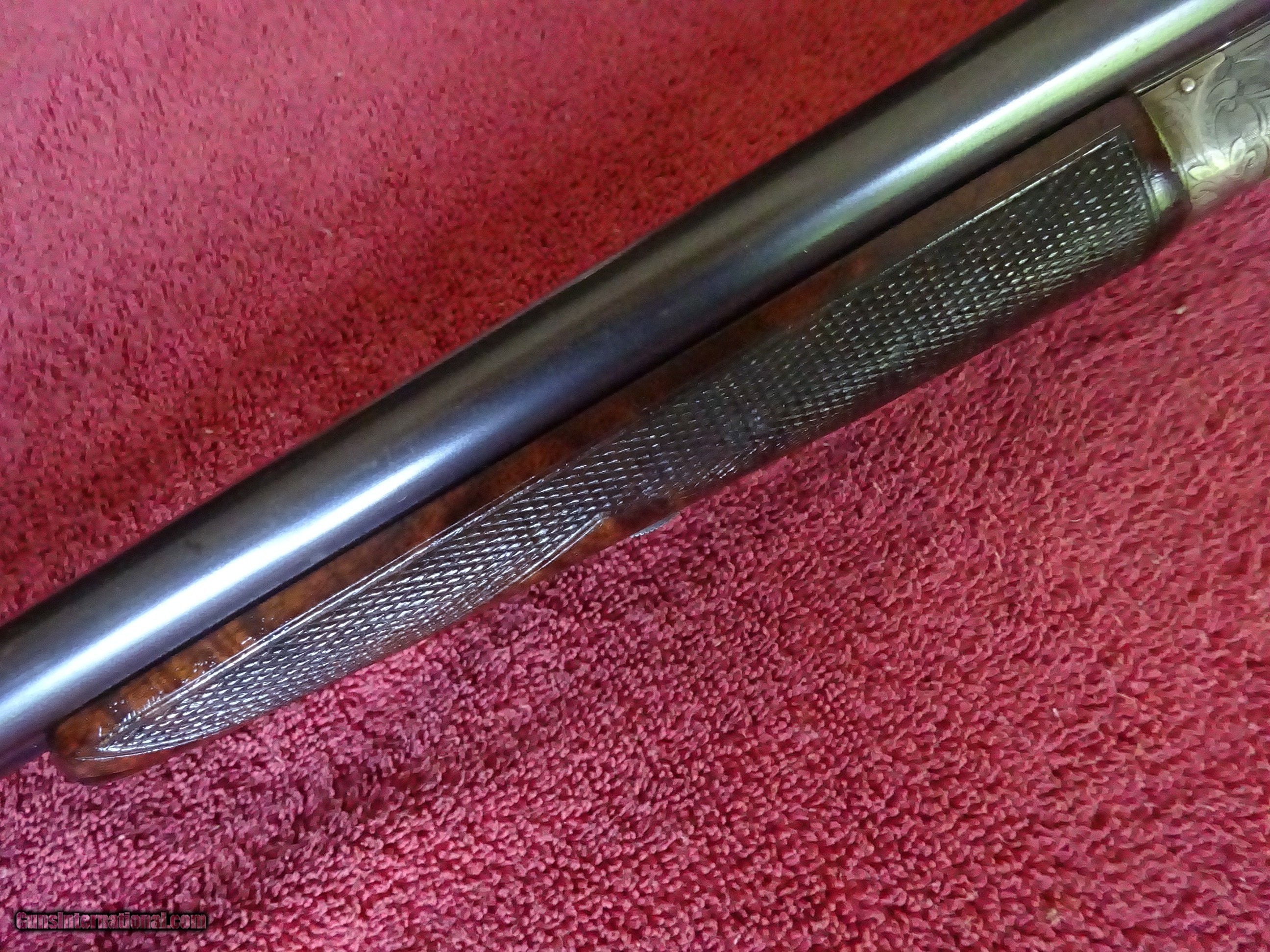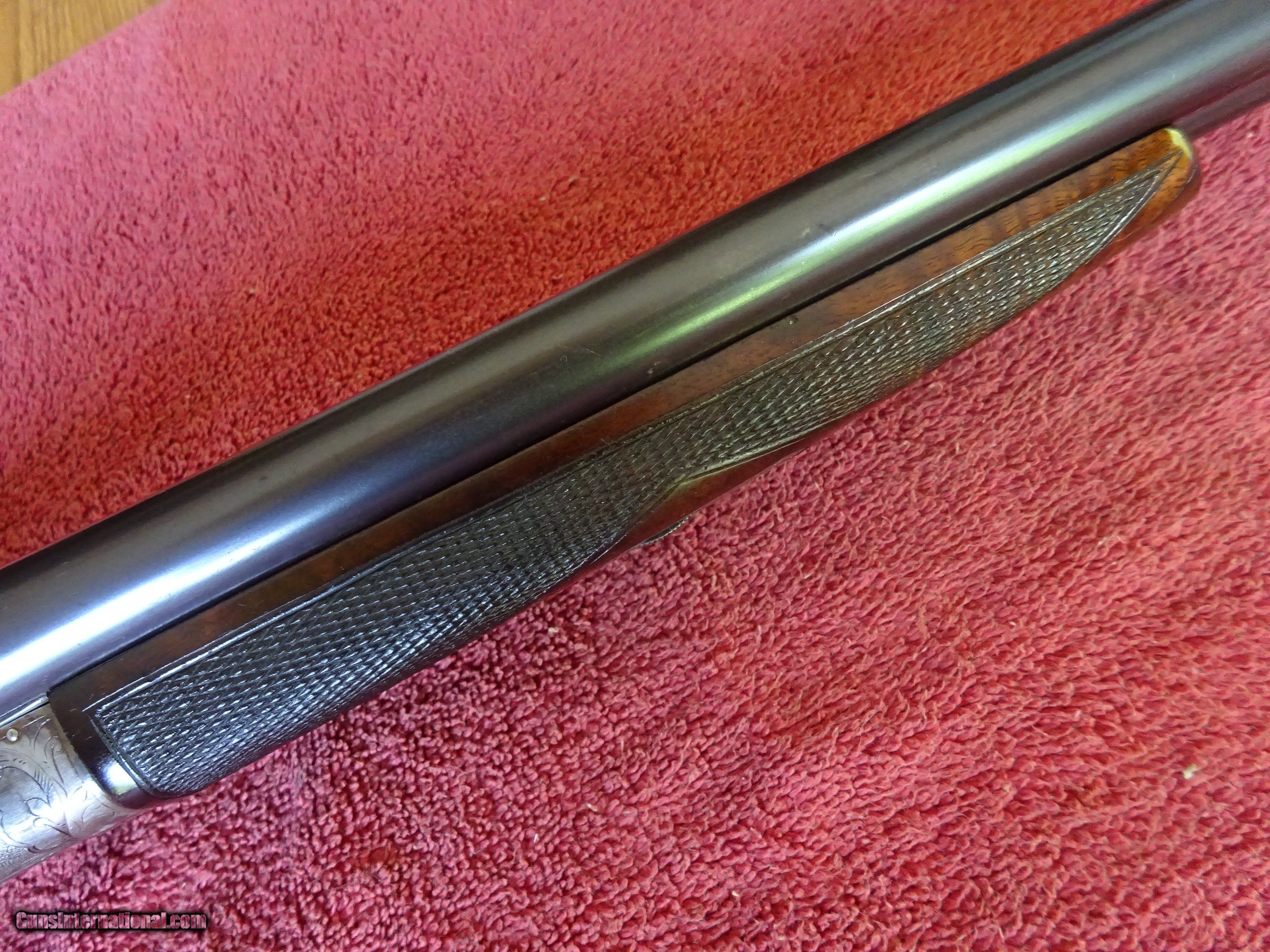 Description: L C SMITH, HUNTER ARMS, EAGLE GRADE 20 GA. NITRO STEEL 30" BARRELS, EXCELLENT BRIGHT BLUE, MIRROR PERFECT BORES, MODIFIED (.20) AND FULL (.35), 2 1/2" CHAMBERS, TWIN BEAD SIGHTS, GOLD BAR INLAY AT THE RIB EXTENSION, SCROLL ENGRAVED AT THE BREECH ENDS, AUTOMATIC EJECTORS, BARRELS RING LIKE A BELL. FEATHERWEIGHT FRAME, VIVID CASE COLOR, RIGHT LOCK HAS A MALLARD IN FLIGHT CUT IN DEEP RELIEF WITH A STIPPLED BACKGROUND, LEFT LOCK HAS A ROOSTER PHEASANT IN FLIGHT CUT IN DEEP RELIEF WITH A STIPPLED BACKGROUND, A RELIEF CUT EAGLE ON THE TOP LEVER, PLUS ACANTHUS SCROLLWORK AND FINE BORDERS, ENGRAVED SCREWS, TOP LEVER TO THE FAR RIGHT, TIGHT ON FACE. TRIGGERGUARD HAS MOST ALL THE ORIGINAL BLUE. PISTOL GRIP STOCK SPLINTER FOREARM, HIGHLY FIGURED WALNUT. VERY GOOD WOOD AND CHECKERING, FOREARM HAS EBONY WEDGE AT THE TIP. STOCK HAS SILVER SHIELD INLAY, NOT ENGRAVED. 1 1/2" X 2 3/8" X 13 3/4", JOSTAM PAD, 7 POUNDS 2 OUNCES. MADE ABOUT 1931. TOTAL PRODUCTION OF EAGLE GRADE 20 GA. GUNS WAS 76. ONLY 8 WERE BUILT WITH 30" BARRELS. EXTREMELY RARE SMITH IN VERY PLEASING ORIGINAL CONDITION. $12,500.00 + $70.00 Insured shipping to an FFL address. Layaway is available. See all Pats gun listings on this site! We also have hundreds of ORIGINAL gun company advertising & memorabilia pieces available for sale on our site SPORTINGCOLLECTIBLES. We have no reprints or reproductions. Email for more information. SOLD Curio/Relic: Yes |