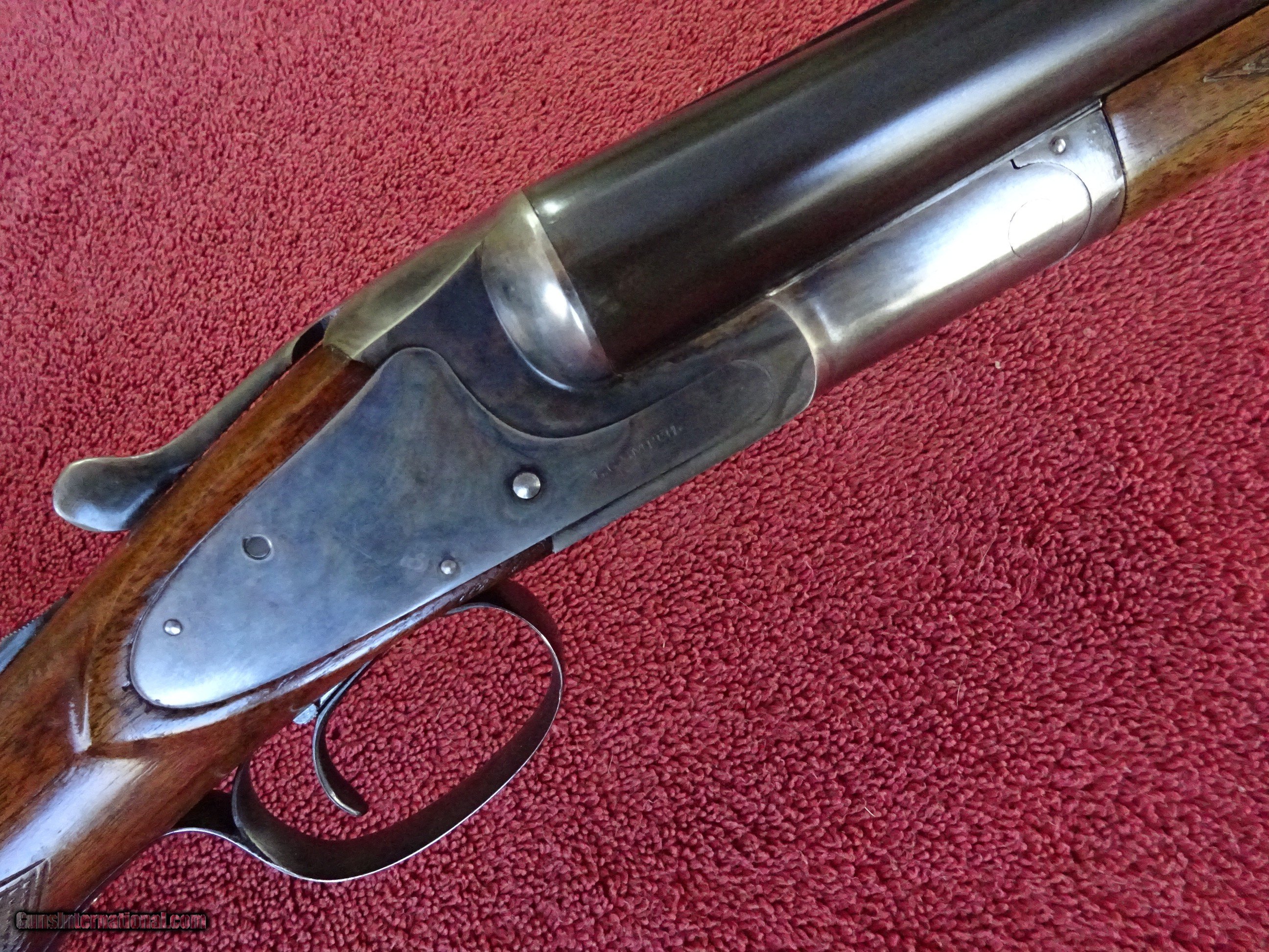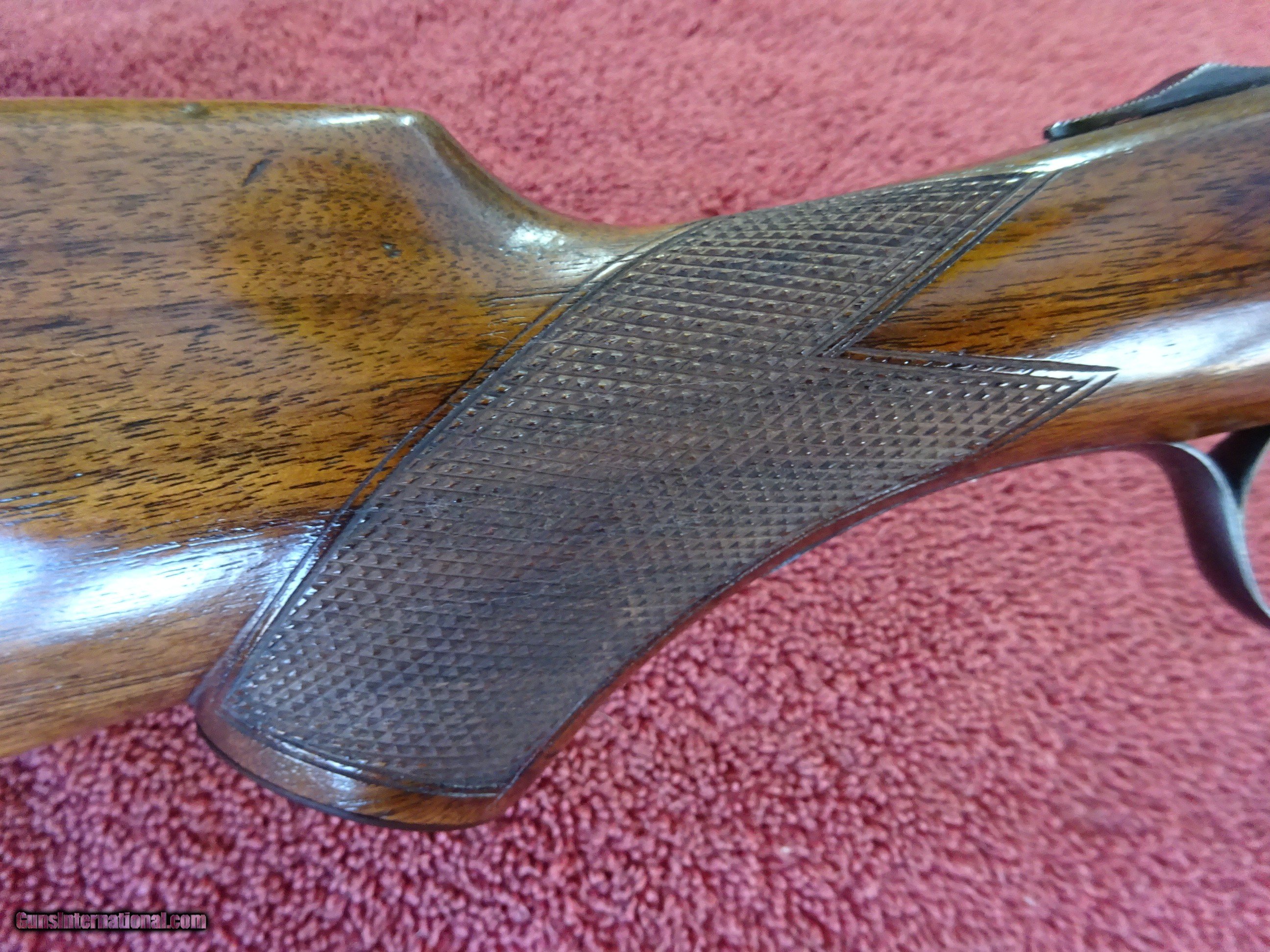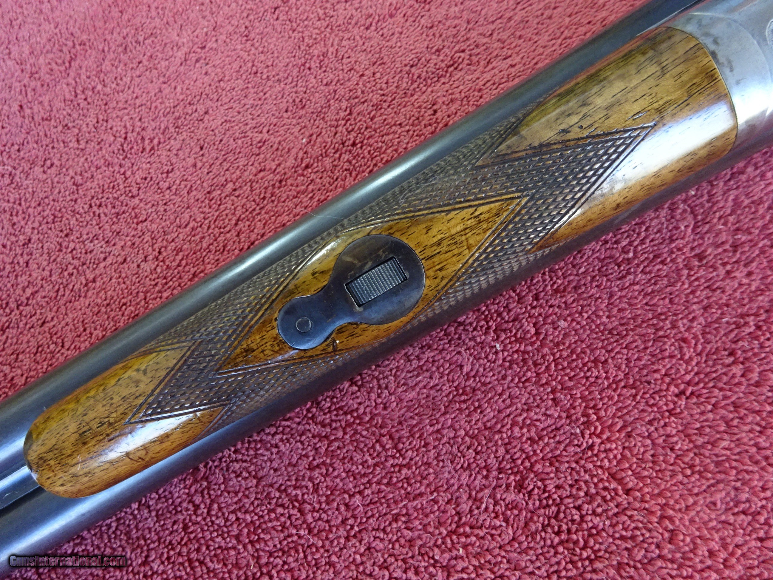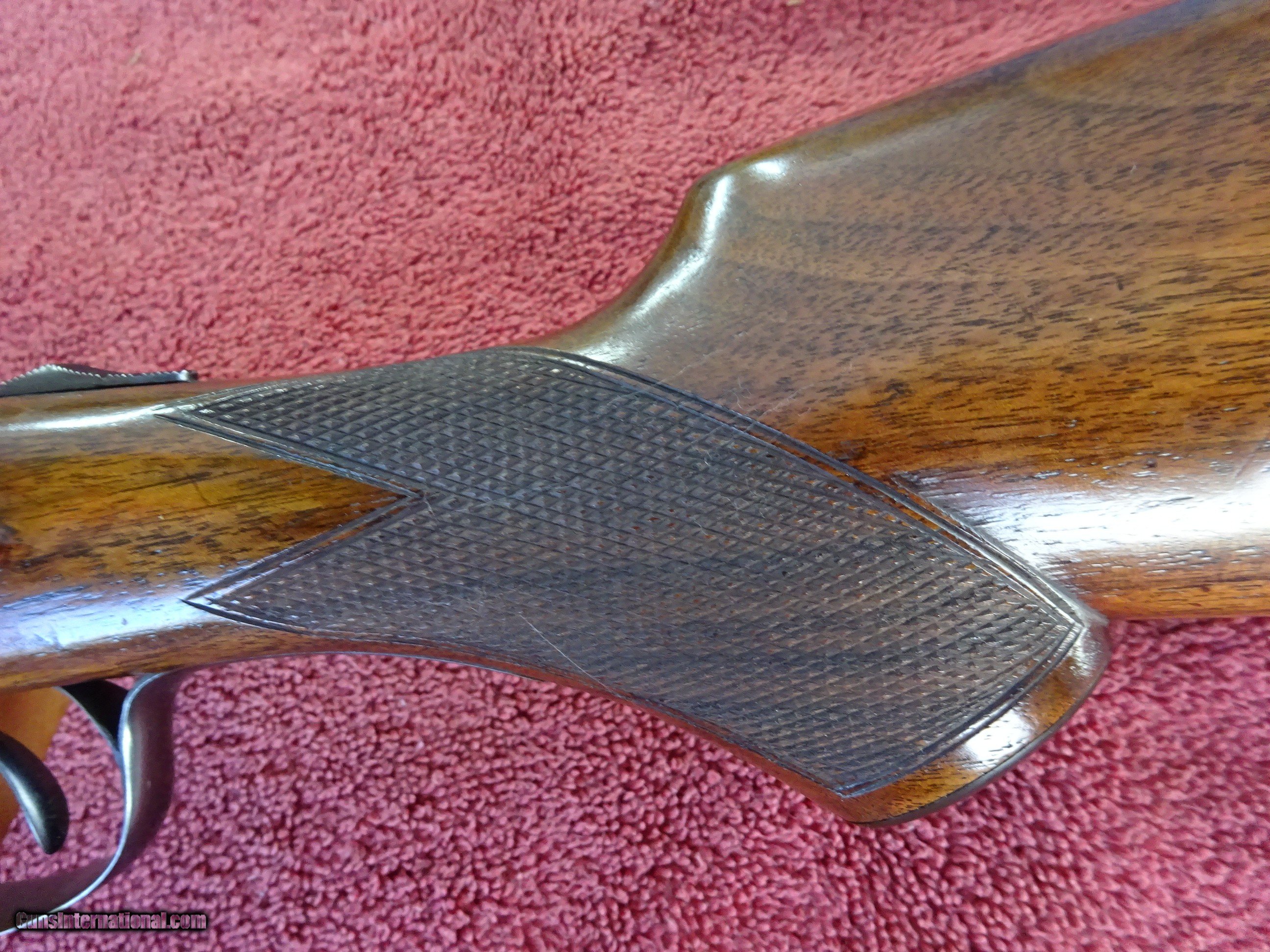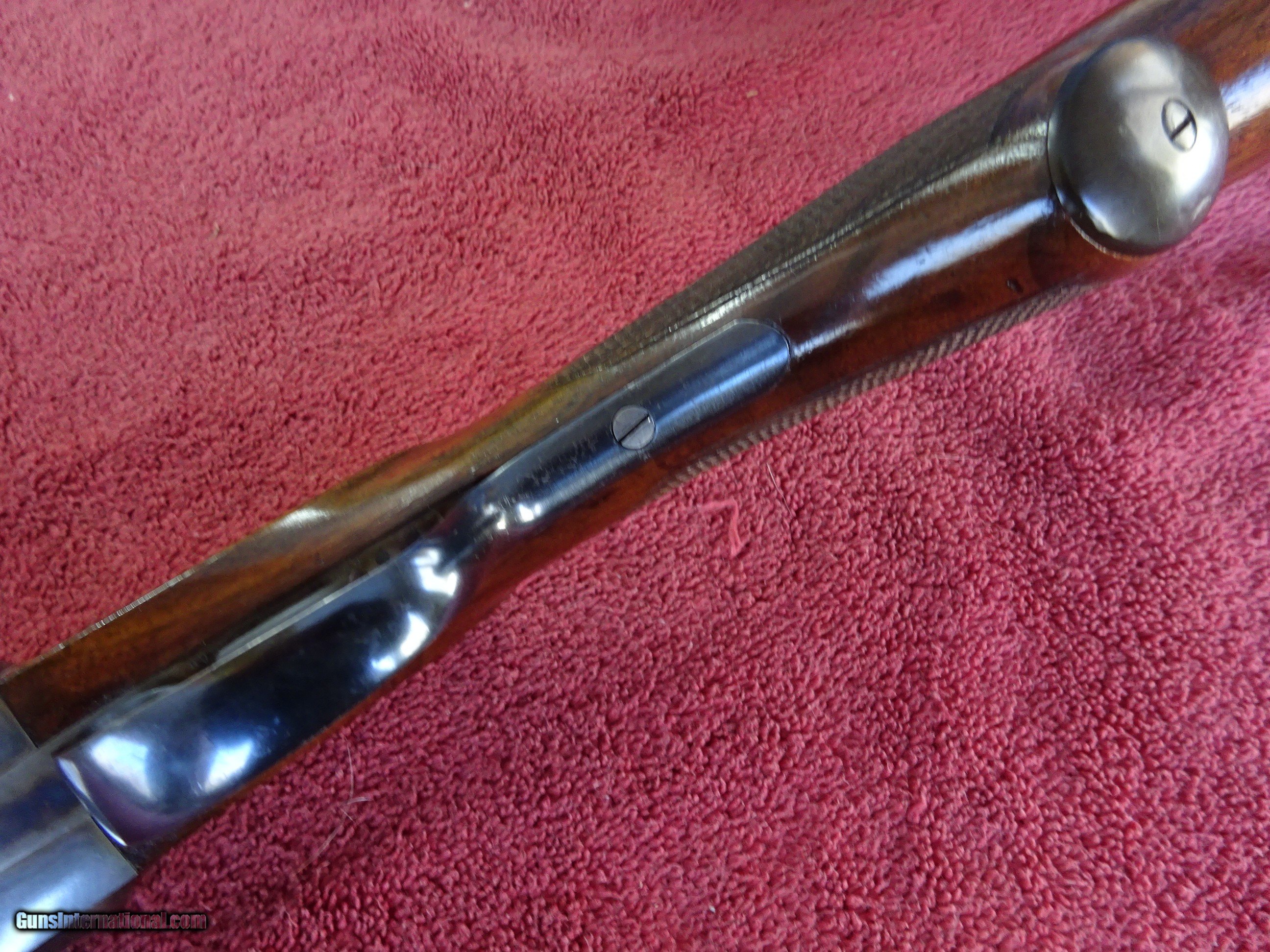 Description: L C SMITH, HUNTER ARMS, FIELD GRADE 12 GAUGE, 30" ARMOR STEEL BARRELS. VERY GOOD BLUE, MIRROR PERFECT BORES, SINGLE BEAD SIGHT, FULL (.035) AND FULL (.035), 2 3/4" CHAMBERS, AUTOMATIC EJECTORS. REGULAR FRAME, VERY GOOD CASE COLOR COVERAGE, HUNTER SINGLE SELECTIVE TRIGGER. TOP LEVER TO THE FAR RIGHT, TIGHT ON FACE, EXCELLENT SCREWS. PISTOL GRIP STOCK, SPLINTER FOREARM, EXCELLENT WOOD AND CHECKERING. GREAT DIMENSIONS, 1 1/4" X 2 1/4" X 14 1/4", HALF INCH SOLID PAD, 8 POUNDS EVEN. GREAT WILD TURKEY GUN. GUN IN VERY PLEASING CONDITION. MADE IN 1929. $1275.00 + $70.00 Insured shipping to an FFL address. Layaway is available. See all Pats gun listings on this site! We also have hundreds of ORIGINAL gun company advertising & memorabilia pieces available for sale on our site SPORTINGCOLLECTIBLES. We have no reprints or reproductions. Email for more information. If you need to call, morning or evening is best, and please note the Seller's Inventory number. SOLD Curio/Relic: Yes |