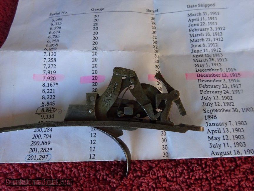 Description: L C SMITH, HUNTER ARMS, MONOGRAM GRADE 20 GAUGE, HUNTER SINGLE SELECTIVE TRIGGER ASSEMBLY, COMPLETE WITH ENGRAVED TRIGGER FLOOR PLATE. SERIAL NUMBER 7220 WHICH IS LISTED IN THE L C SMITH BOOK AS MADE IN 1915. EXCELLENT CONDITION. $750.00 + $10.00 Insured shipping to a US address. See all Pats listings We also have hundreds of pieces of ORIGINAL gun company advertising & memorabilia available for sale. We have no reprints or reproductions. Email for more information. SOLD |
