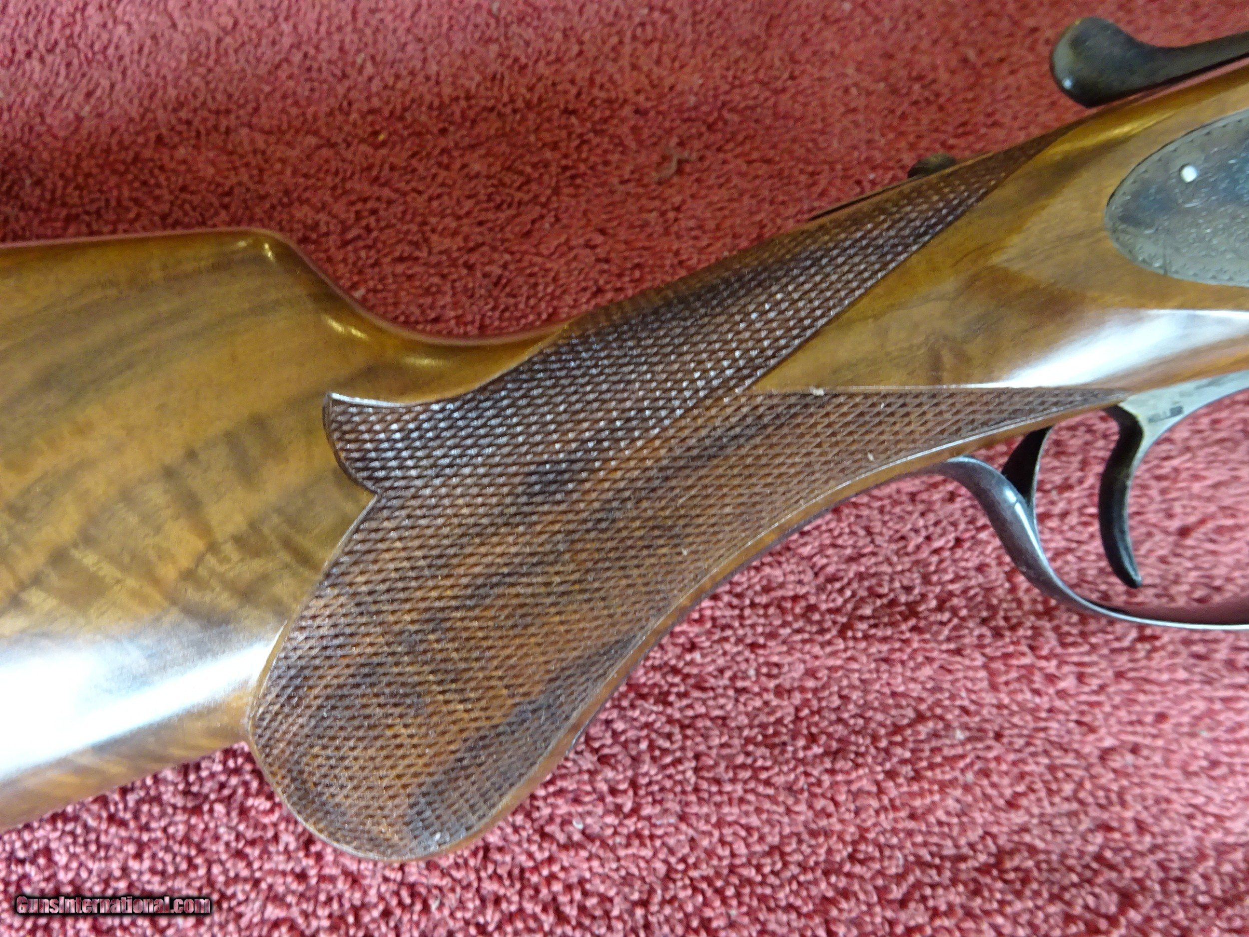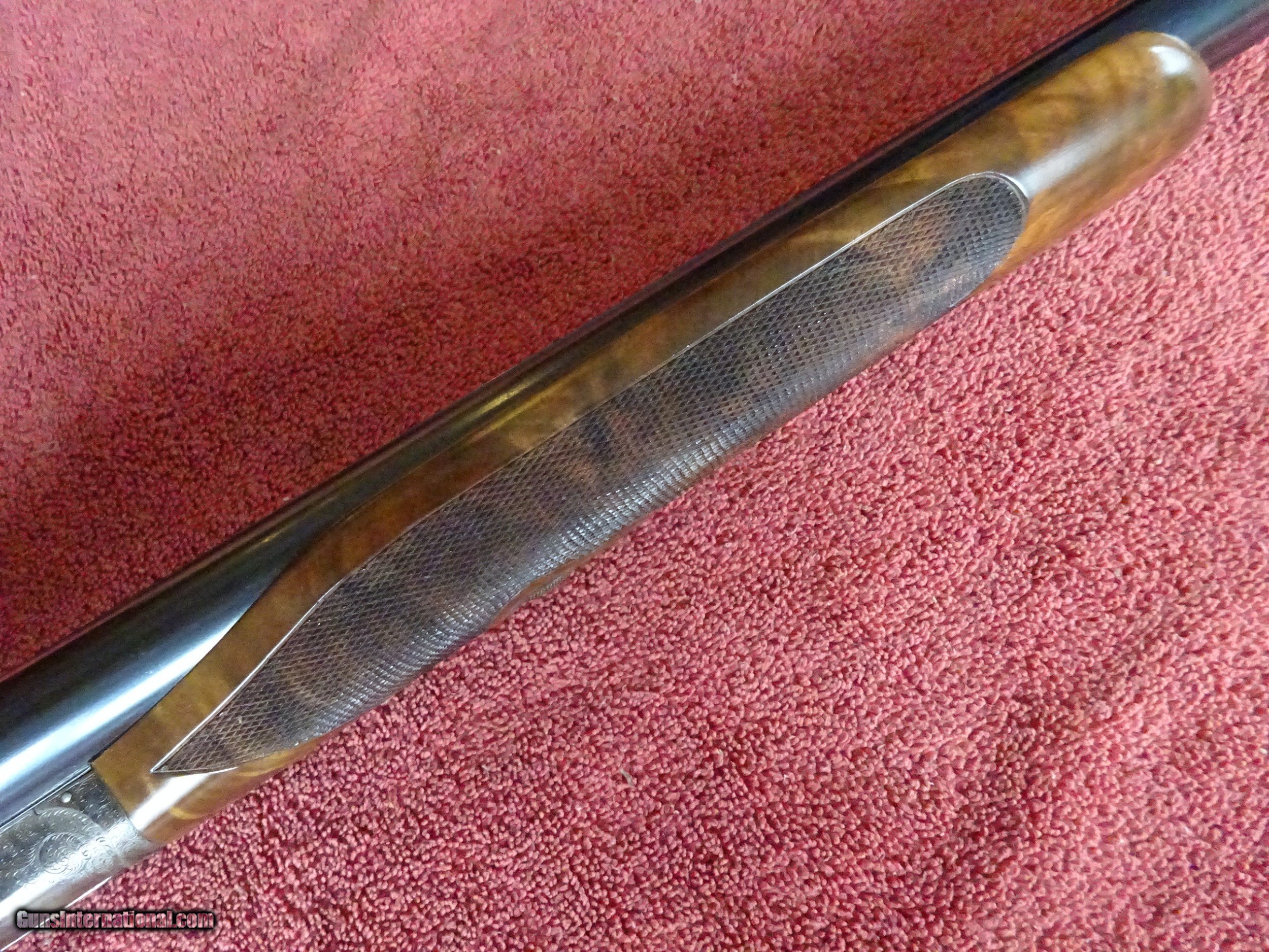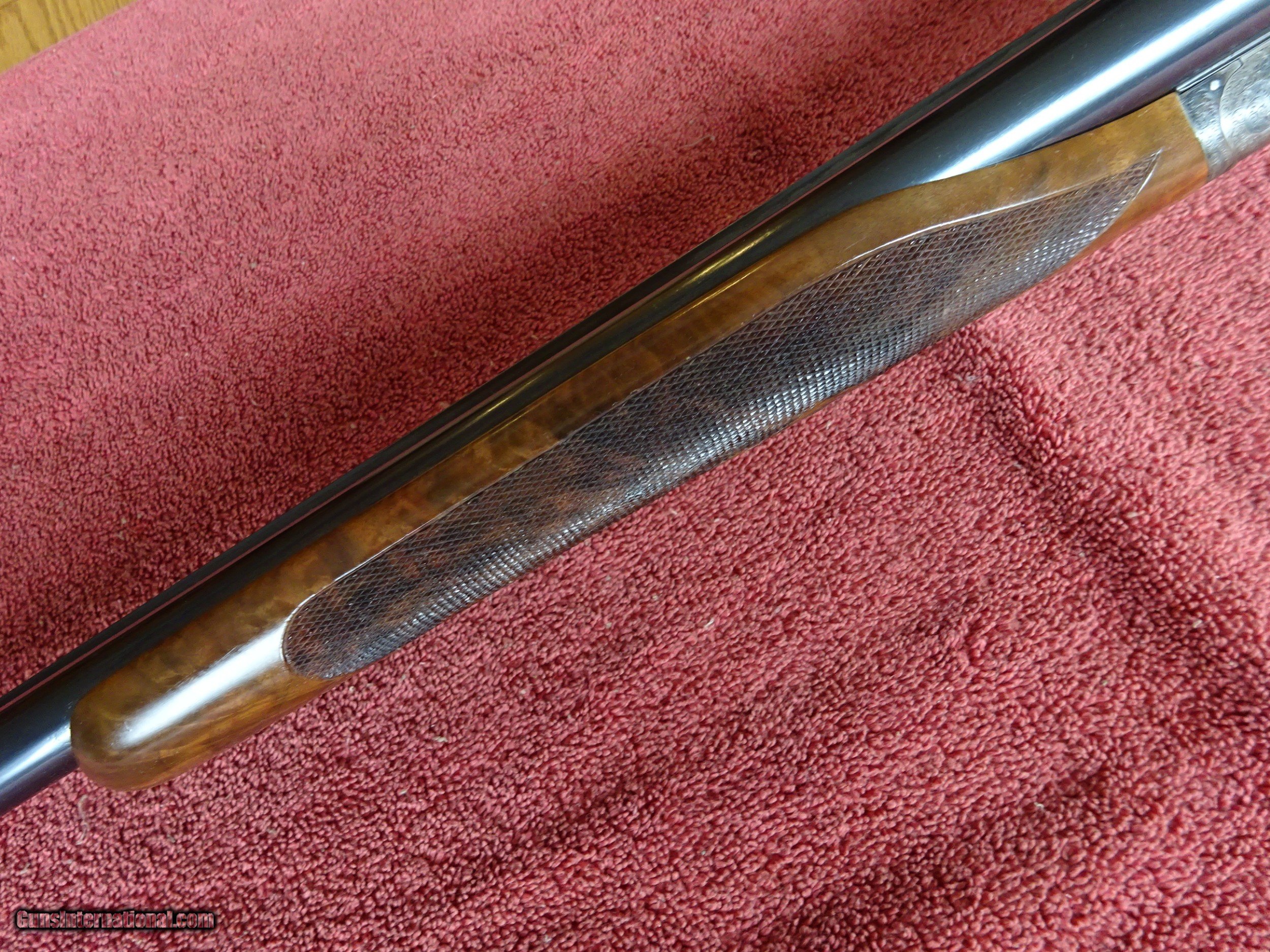 Description: L C SMITH, HUNTER ARMS CO., MONOGRAM GRADE 12 GAUGE. 30" SIR JOSEPH WHITWORTH FLUID COMPRESSED STEEL BARRELS, MODIFIED AND FULL, 2 3/4" CHAMBERS. EXCELLENT BLUE, MIRROR PERFECT BORES, TWIN SIGHTS, ENGRAVED AT BOTH ENDS AND GOLD BAR INLAY ENGRAVED "MONOGRAM" AT RIB EXTENSION, BARRELS RING NICELY. REGULAR FRAME WITH EXCELLENT CASE COLOR, FULLY ENGRAVED, 100% COVERAGE. PAIR OF PIGEONS INFLIGHT ON BOTH LOCKS, DUCK INFLIGHT ON THE FLOOR PLATE, EXTENSIVE FINE SCROLL, GORGEOUS FOLIATE, AND INTRICATE BORDERS. GOLD INLAYED "L. C. SMITH" ON BOTH LOCKS, GOLD INLAYED SAFETY, AUTOMATIC EJECTORS, MILLER SINGLE SELECTIVE TRIGGER. TOP LEVER TO THE RIGHT, TIGHT ON FACE. ROUND KNOB GRIP STOCK, BEAVERTAIL FOREARM, BEAUTIFUL HIGHLY FIGURED WALNUT, FINE CHECKERING. GREAT DIMENSIONS, 1 3/8" X 2 3/8" X 14". JUST OVER 8 POUNDS. MADE IN 1909, ONLY 127 WERE MADE IN THIS CONFIGURATION. PRE-1913 SMITHS ARE HIGHLY SOUGHT AFTER. GORGEOUS GUN, MONOGRAM GRADE PRODUCTION AVERAGED LESS THAN 6 GUNS PER YEAR. $12,500.00 + $70.00 Insured shipping to an FFL address. See all Pats gun listings on this site! We also have hundreds of pieces of ORIGINAL gun company advertising & memorabilia available for sale on our site SPORTINGCOLLECTIBLES. We have no reprints or reproductions. Email for more information. SOLD Curio/Relic: Yes |