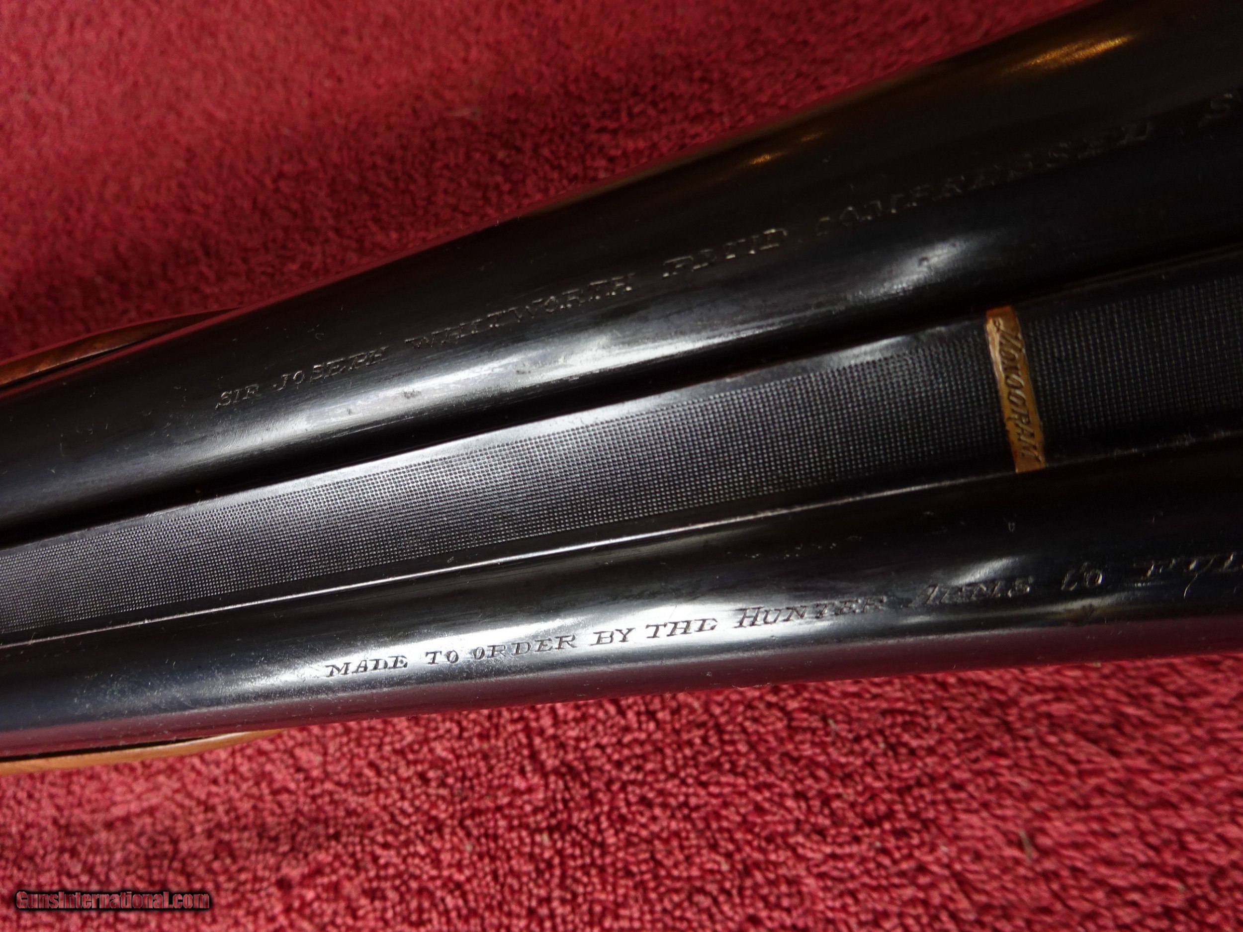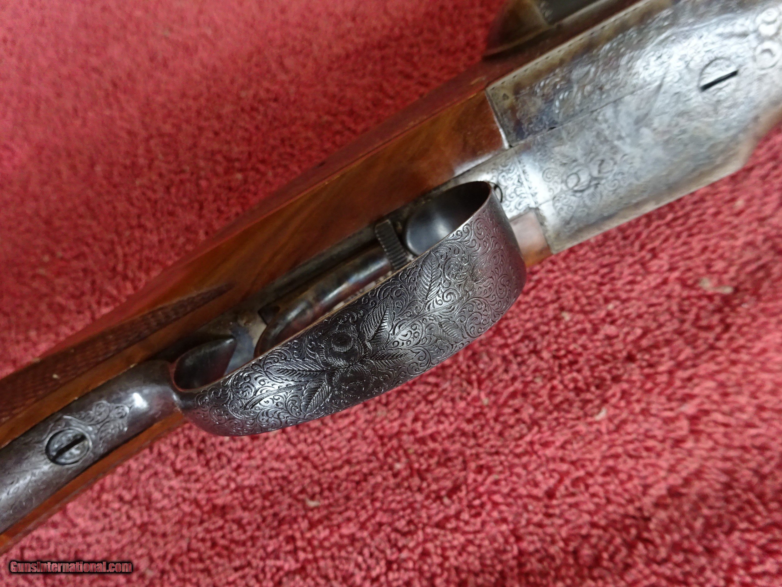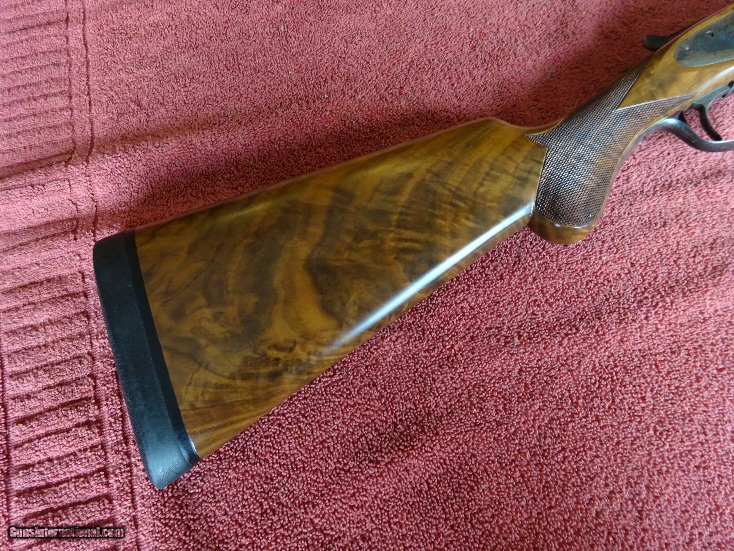 Description: L C SMITH, HUNTER ARMS CO., MONOGRAM GRADE 12 GAUGE. 30" SIR JOSEPH WHITWORTH FLUID COMPRESSED STEEL BARRELS, MODIFIED AND FULL, 2 3/4" CHAMBERS. EXCELLENT BLUE, MIRROR PERFECT BORES, TWIN SIGHTS, ENGRAVED AT BOTH ENDS AND GOLD BAR INLAY ENGRAVED "MONOGRAM" AT RIB EXTENSION, BARRELS RING NICELY. REGULAR FRAME WITH EXCELLENT CASE COLOR, FULLY ENGRAVED, 100% COVERAGE. PAIR OF PIGEONS INFLIGHT ON BOTH LOCKS, DUCK INFLIGHT ON THE FLOOR PLATE, EXTENSIVE FINE SCROLL, GORGEOUS FOLIATE, AND INTRICATE BORDERS. GOLD INLAYED "L. C. SMITH" ON BOTH LOCKS, GOLD INLAYED SAFETY, AUTOMATIC EJECTORS, MILLER SINGLE SELECTIVE TRIGGER. TOP LEVER TO THE RIGHT, TIGHT ON FACE. ROUND KNOB GRIP STOCK, BEAVERTAIL FOREARM, BEAUTIFUL HIGHLY FIGURED WALNUT, FINE CHECKERING. GREAT DIMENSIONS, 1 3/8" X 2 3/8" X 14". JUST OVER 8 POUNDS. MADE IN 1909, ONLY 127 WERE MADE IN THIS CONFIGURATION. PRE-1913 SMITHS ARE HIGHLY SOUGHT AFTER. GORGEOUS GUN, MONOGRAM GRADE PRODUCTION AVERAGED LESS THAN 6 GUNS PER YEAR. $12,500.00 + $70.00 Insured shipping to an FFL address. See all Pats gun listings on this site! We also have hundreds of pieces of ORIGINAL gun company advertising & memorabilia available for sale on our site SPORTINGCOLLECTIBLES. We have no reprints or reproductions. Email for more information. SOLD Curio/Relic: Yes |
