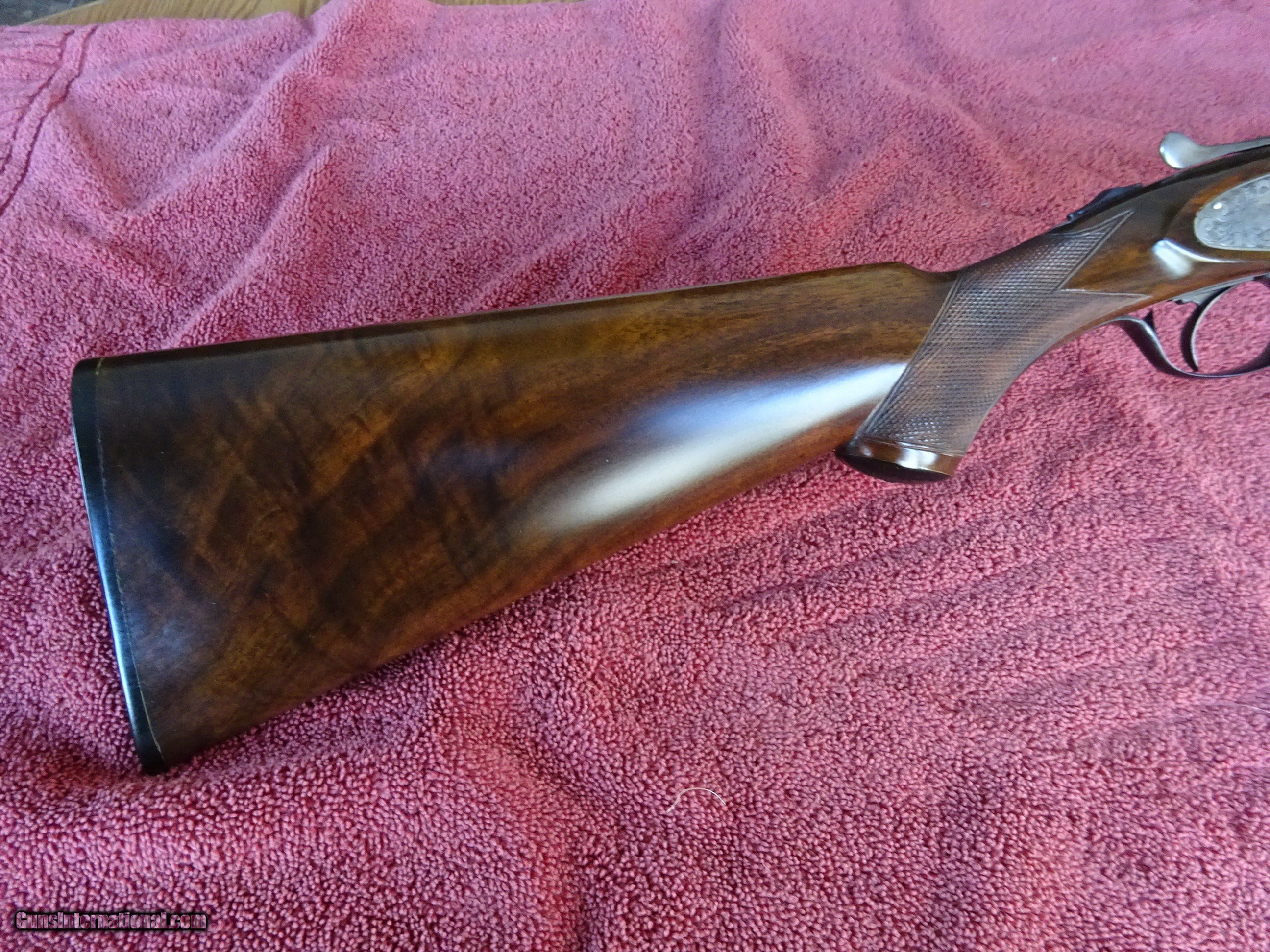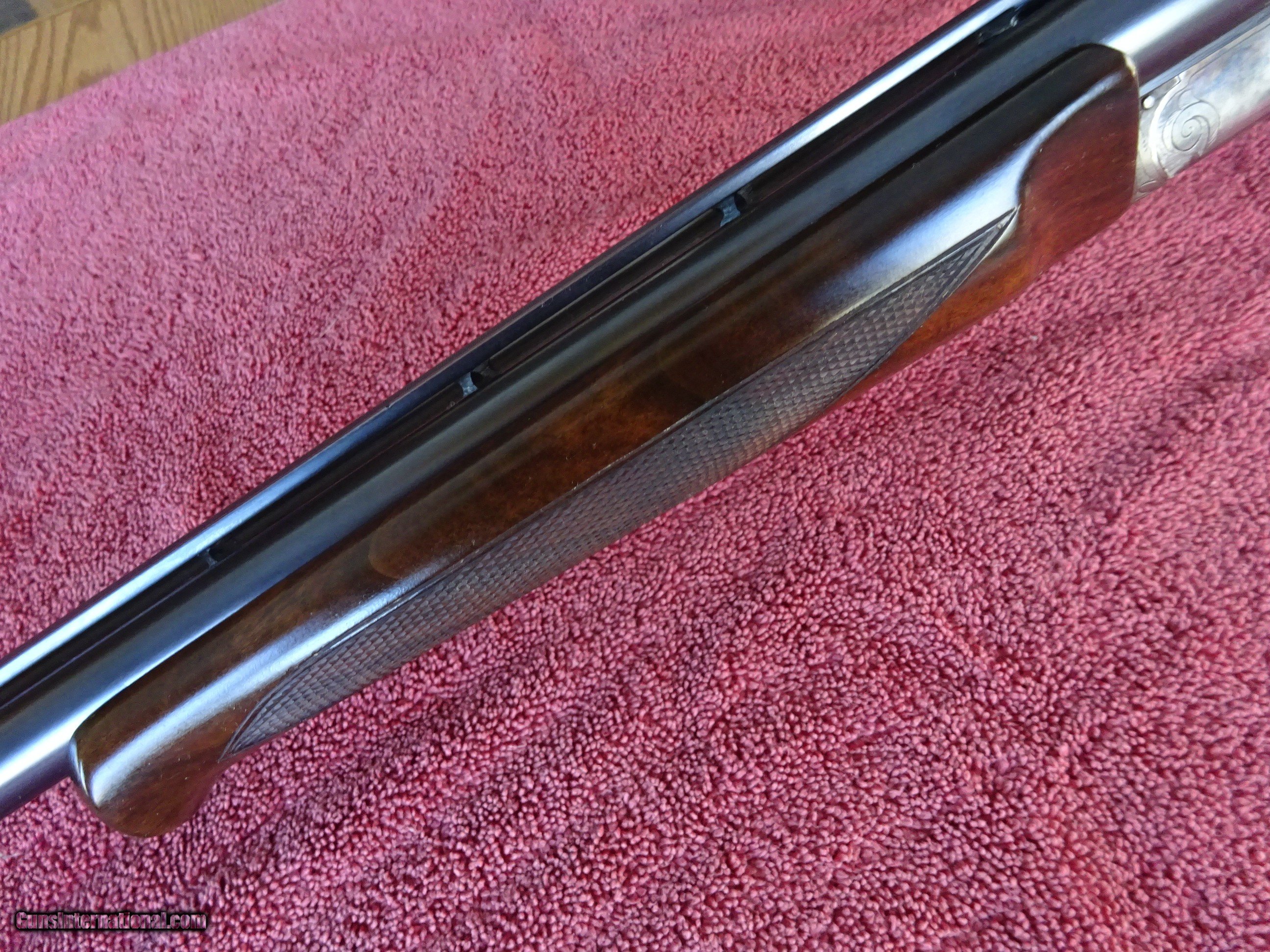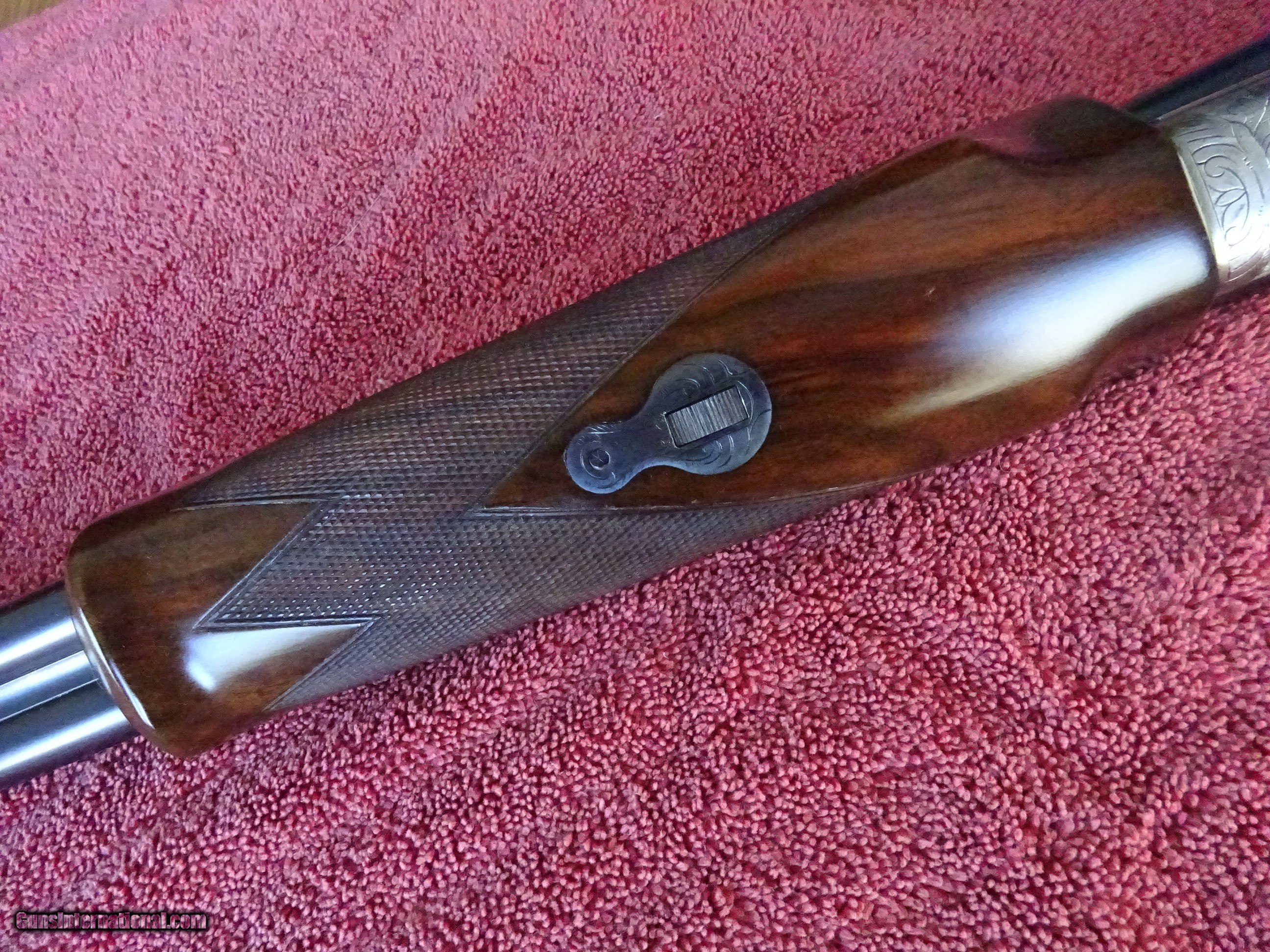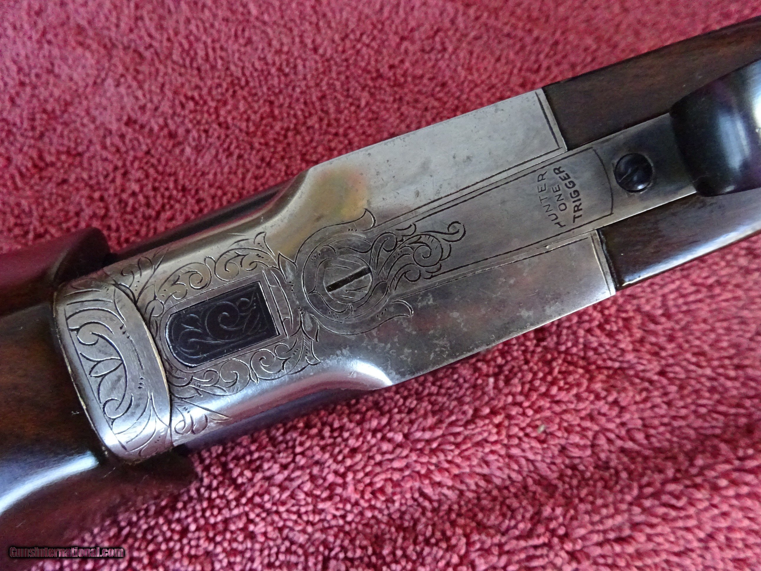 Description: L C SMITH, HUNTER ARMS SPECIALTY GRADE 20 GAUGE. VENT RIB 30" BARRELS, FULL AND FULL CHOKES, 2 3/4" CHAMBERS, EXCELLENT BLUE, MIRROR PERFECT BORES, SINGLE BEAD SIGHT, AUTOMATIC EJECTORS. HUNTER SINGLE SELECTIVE TRIGGER, NON-AUTO SAFETY, FEATHERWEIGHT FRAME, GOOD CASE COLOR IN THE PROTECTED AREAS. STANDARD ENGRAVING PATTERN WITH A DUCK IN FLIGHT ON THE RIGHT LOCK AND A PAIR OF STANDING QUAIL ON THE LEFT LOCK PLUS ACANTHUS SCROLLWORK AND FINE BORDERS. EXCELLENT ENGRAVED SCREWS. PISTOL GRIP STOCK, BEAVERTAIL FOREARM, EXCEPTIONAL HIGHLY FIGURED DARK-GRAINED AMERICAN WALNUT, NEAR-PERFECT FINE CHECKERING AND WOOD FINISH. ORIGINAL GRIP CAP AND BUTTPLATE, 1 1/2" X 2 3/4" X 14 1/8", 7 POUNDS 5 OUNCES. MADE IN 1930. ONLY 116 GUNS WERE MADE IN THIS CONFIGURATION. INCLUDES CODY MUSEUM LETTER. SCARCE GUN IN VERY PLEASING CONDITION. IT IS IN A MODERN CANVAS AND LEATHER TRUNK CASE. $11,500.00 + $70.00 Insured shipping to an FFL address. Layaway is available. See all Pats gun listings on this site! We also have hundreds of ORIGINAL gun company advertising & memorabilia pieces available for sale on our site SPORTINGCOLLECTIBLES. We have no reprints or reproductions. Email for more information. If you need to call, morning or evening is best, and please note the Seller's Inventory number. SOLD Curio/Relic: Yes |