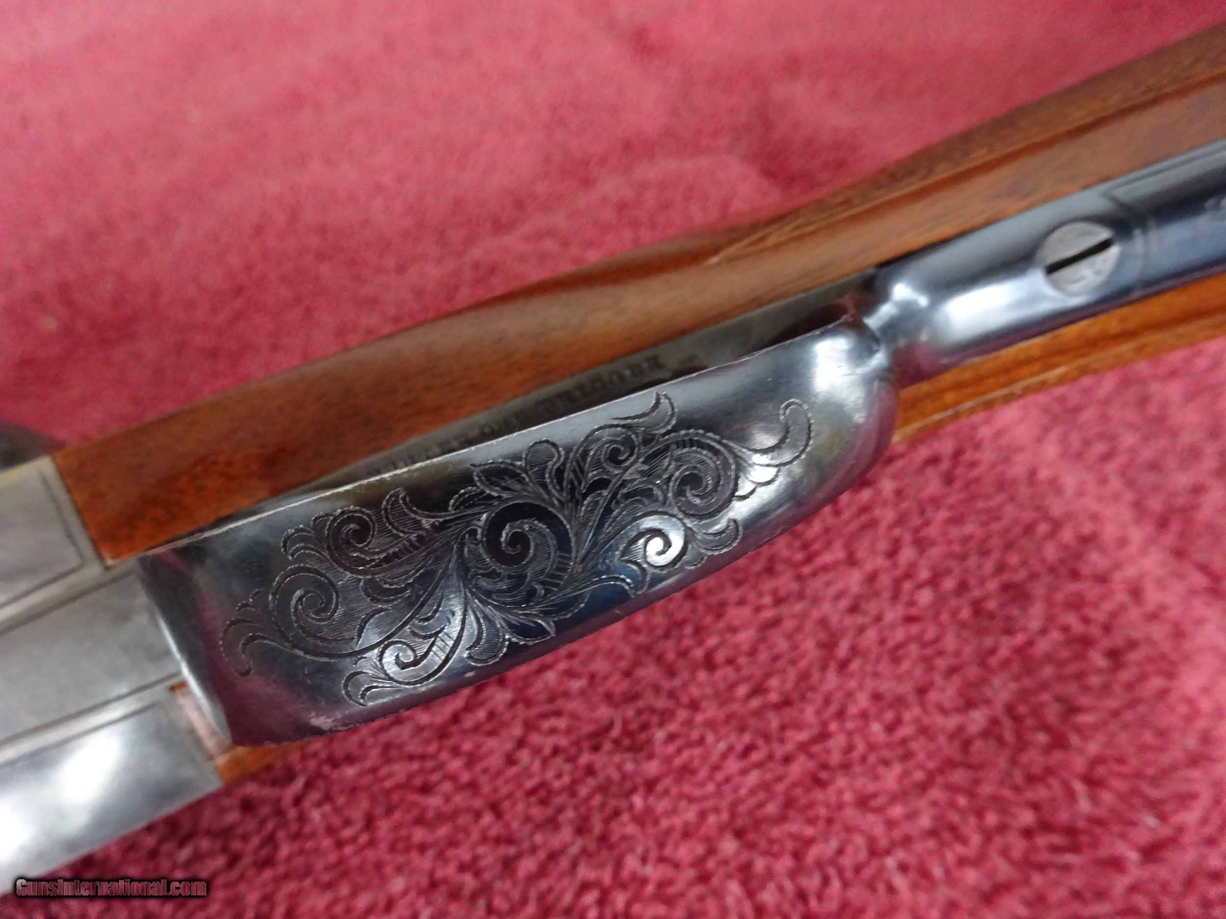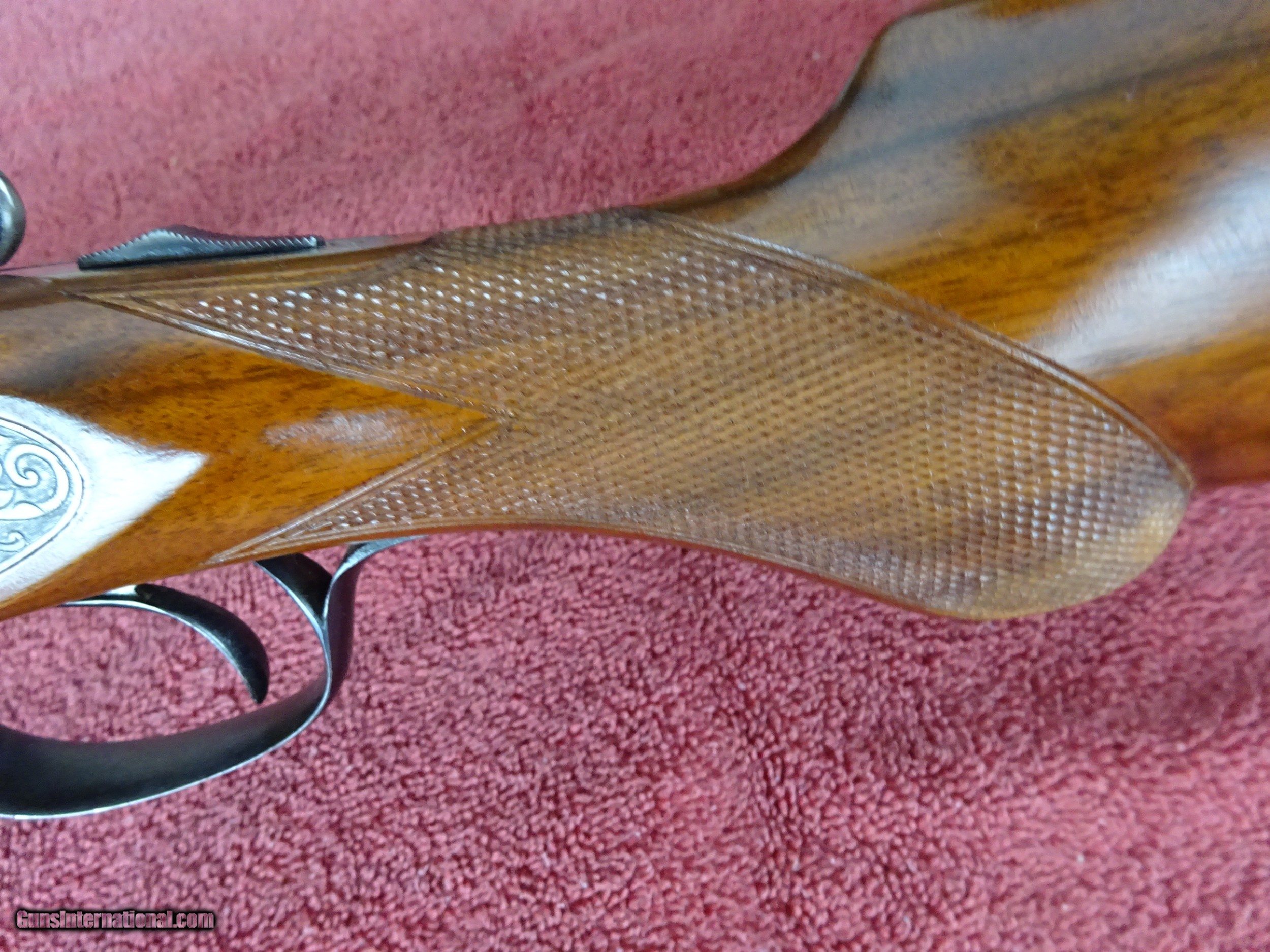 Description: L C SMITH, HUNTER ARMS, SPECIALTY GRADE 12 GAUGE. 30" NITRO STEEL BARRELS, IMCYL. AND MODIFIED, EXCELLENT BLUE, MIRROR PERFECT BORES, TWIN IVORY SIGHTS, 2 3/4" CHAMBERS, AUTOMATIC EJECTORS, BARRELS RING NICELY. TOP LEVER TO THE FAR RIGHT, TIGHT ON FACE, EXCELLENT ENGRAVED SCREWS, MOST ALL THE ORIGINAL TRIGGERGUARD BLUE, REGULAR FRAME WITH BOLD DEEP CUT ENGRAVING, MALLARD IN FLIGHT ON RIGHT SIDE, PAIR OF STANDING QUAIL ON LEFT SIDE, PLUS ACANTHUS SCROLL AND FINE BORDERS, NO WEAR ON ANY OF THE ENGRAVING, LIGHT CASE COLOR WITH GOOD OVERALL COVERAGE. ROUND KNOB PISTOL GRIP STOCK WITH OVAL INLAY ENGRAVED "H R", SPLINTER FOREARM WITH BANJO LATCH AND EBONY TIP. EXCELLENT WOOD AND CHECKERINGM GREAT DIMENSIONS, 1 1/2" X 2 1/4" X 13 3/4" FROM HUNTER SINGLE SELECTIVE TRIGGER, 7 3/4" POUNDS. NICE SPECIALTY GRADE MADE IN 1920, LESS THAN 2000 MADE IN THIS CONFIGURATION. BUTTSTOCK IS A POSSIBLE REPLACEMENT. $1775.00 + $50.00 Insured shipping to an FFL address. See all Pats gun listings on this site! We also have hundreds of pieces of ORIGINAL gun company advertising & memorabilia available for sale on our site SPORTINGCOLLECTIBLES. We have no reprints or reproductions. Email for more information. SOLD Curio/Relic: Yes |