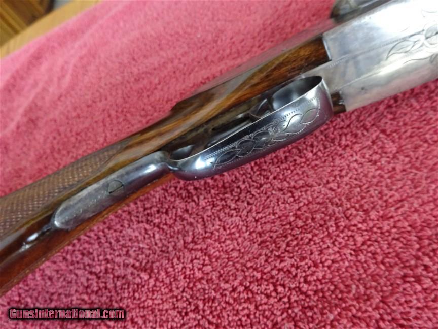 Description: L C SMITH, HUNTER ARMS, IDEAL GRADE 20 GAUGE, 28" BARRELS, IMCYL AND MODIFIED. EXCELLENT BLUE, MIRROR BRIGHT BORES, AUTOMATIC EJECTORS. FEATHERWEIGHT FRAME, LIGHT CASE COLOR, TYPICAL LEAF, SCROLL AND BORDER ENGRAVING PATTERN. PISTOL GRIP STOCK, SPLINTER FOREARM, ORIGINAL GRIP CAP AND BUTTPLATE. TOP LEVER TO THE FAR RIGHT, TIGHT ON FACE, NICE TRIGGERGUARD BLUE. ALL ORIGINAL EXCEPT WOOD PROFESSIONALLY REFINISHED. 1 3/4" X 2 3/4" X 13 3/4", 6 POUNDS EVEN. MADE IN 1921, L C SMITH COLLECTORS LETTER CONFIRMS SPECS. $2575.00 + $45.00 Insured shipping to an FFL address. See all Pats listings We also have hundreds of pieces of ORIGINAL gun company advertising & memorabilia available for sale. We have no reprints or reproductions. Email for more information. SOLD Curio/Relic: Yes Serial Number: 42xxx |