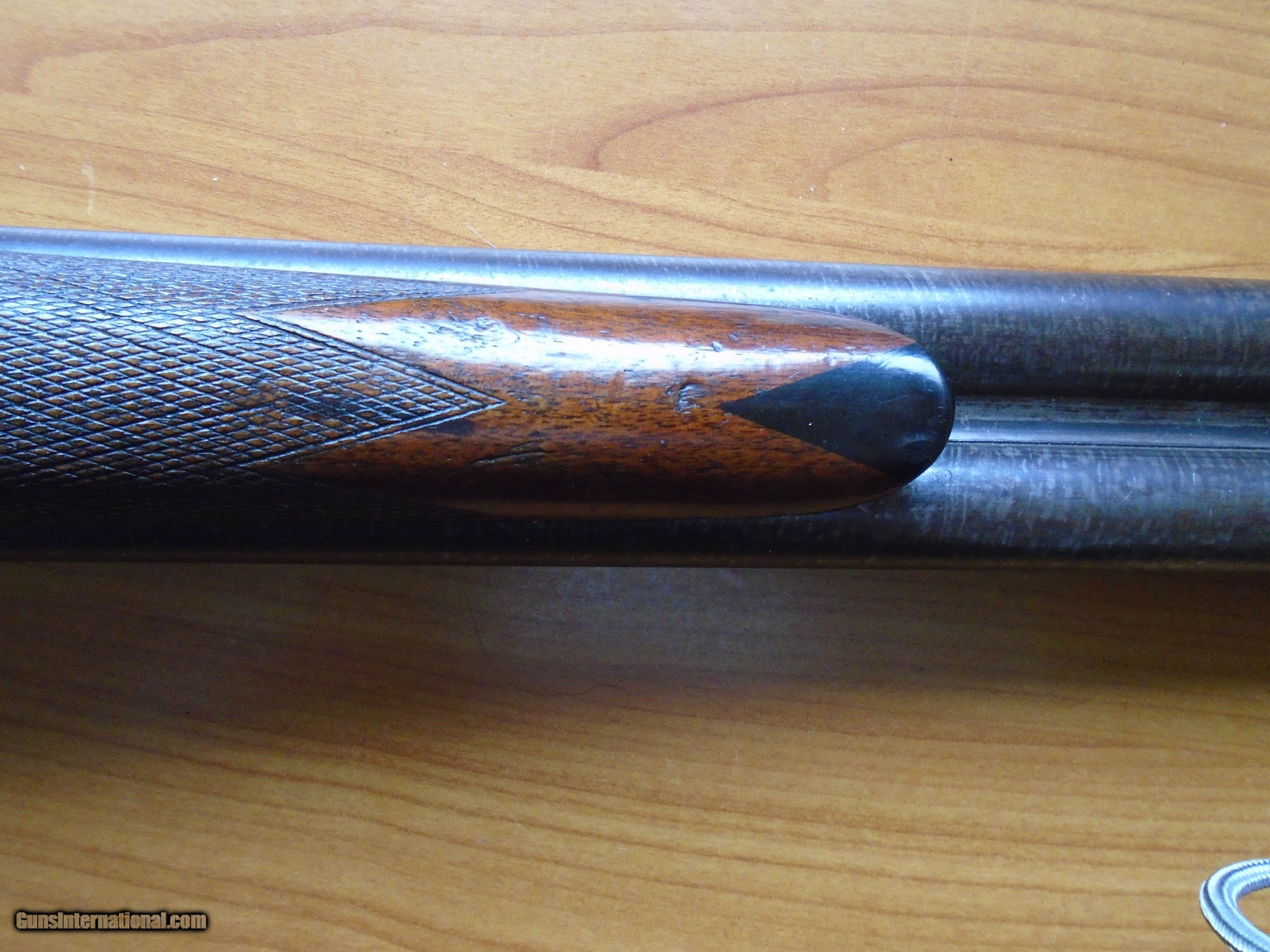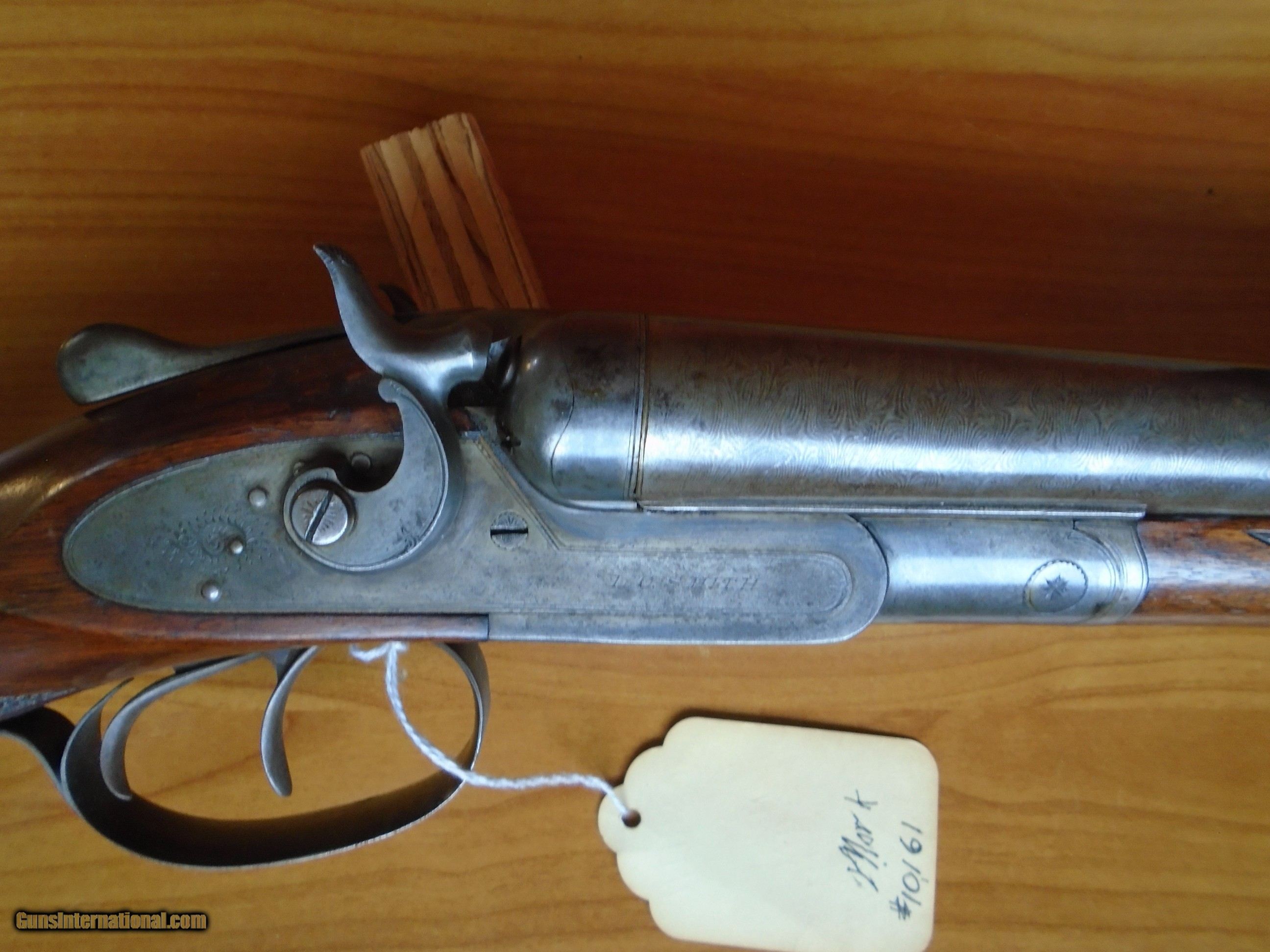 Description: LC Smith, Maker, Syracuse, NY #10161 (ca. 1886) This L C Smith Maker E Grade hammer gun Is in excellent condition and was one of about 5000 hammer guns made on Brown’s rotary bolt patent during Smith’s ownership (1884-1887). This is one grade above field grade and has a burst of scroll engraving on each side-plate and on the trigger bow like the D grade made after Hunter Bros bought the company in 1887. It has survived in great condition - ca. 95%. The 30” Damascus barrels have perfect bores. The original finish is about 80% case colors, 98% varnish, and 90% Damascus pattern on the fine Damascus barrels which are bored IC and modified. Unfortunately, someone added a 1” thick rubber pad about 1955. LOP is 14 ½”, DC is 2”, and DH is 3”. SOLD Antique: Yes Shotgun Gauge: 12 Gauge Manufacturer: L C Smith Maker, Syracuse, NY Model: E" Grade Hammer Gun Serial Number: 10161 Barrel Length: 30 Chambers: 2 3/4 Condition: Excellent Metal Condition: Excellent Wood Condition: Excellent Bore Condition: perfect Action: sidelock Triggers: double Stock: walnut Stock Comb: 2 Stock Heel: 3 Stock Cast: neutral Fore End: Splinter Butt Pad: 1" Pachmyr LOP: 14 1/2 Manufacture Date: ca. 1886 Choke Left: Modified Choke Right: Improved Cylinder Engraving: Burst of scroll Item Location: CA Minimum Wall Thickness Left: Original Minimum Wall Thickness Right: Original |