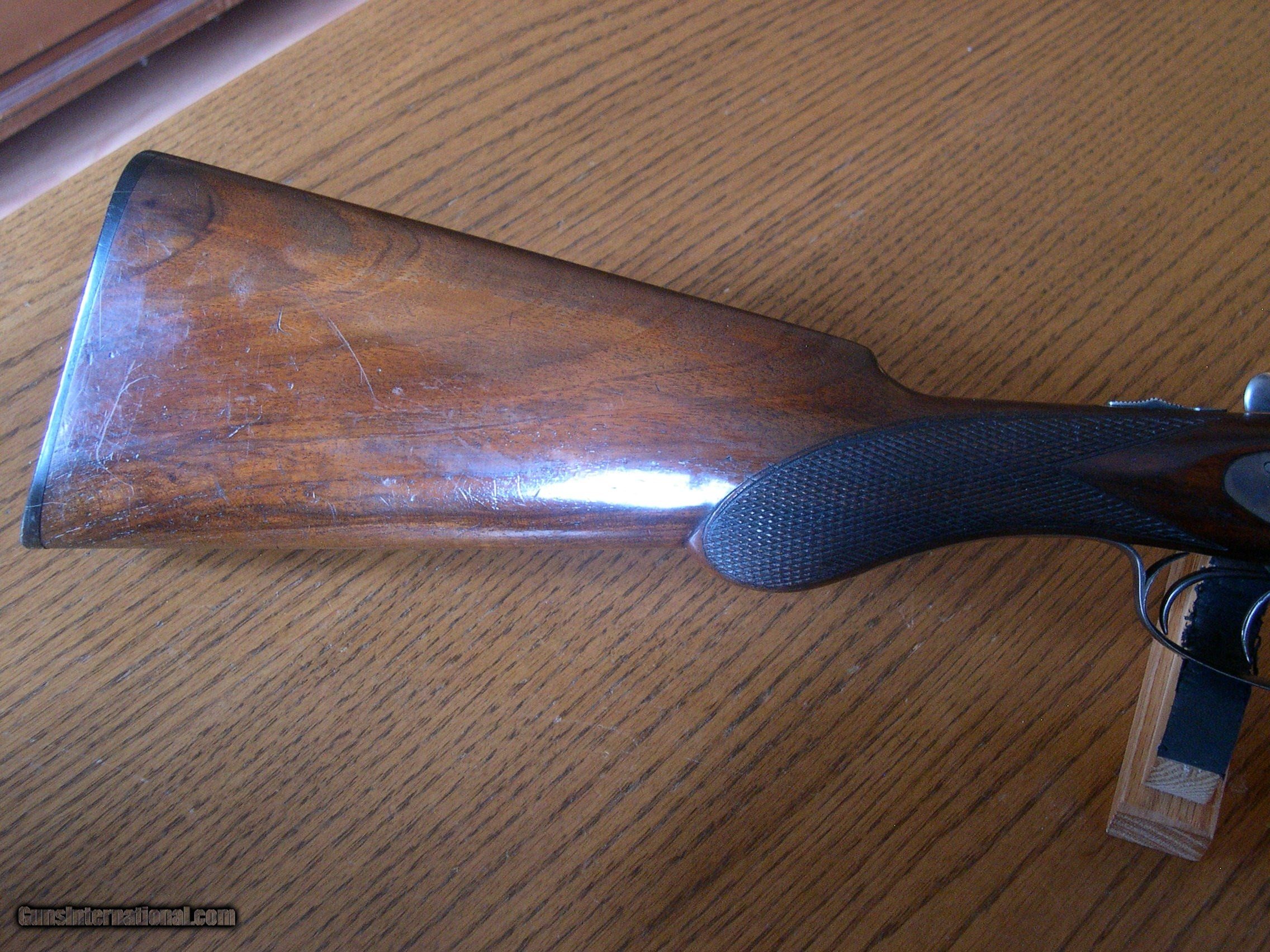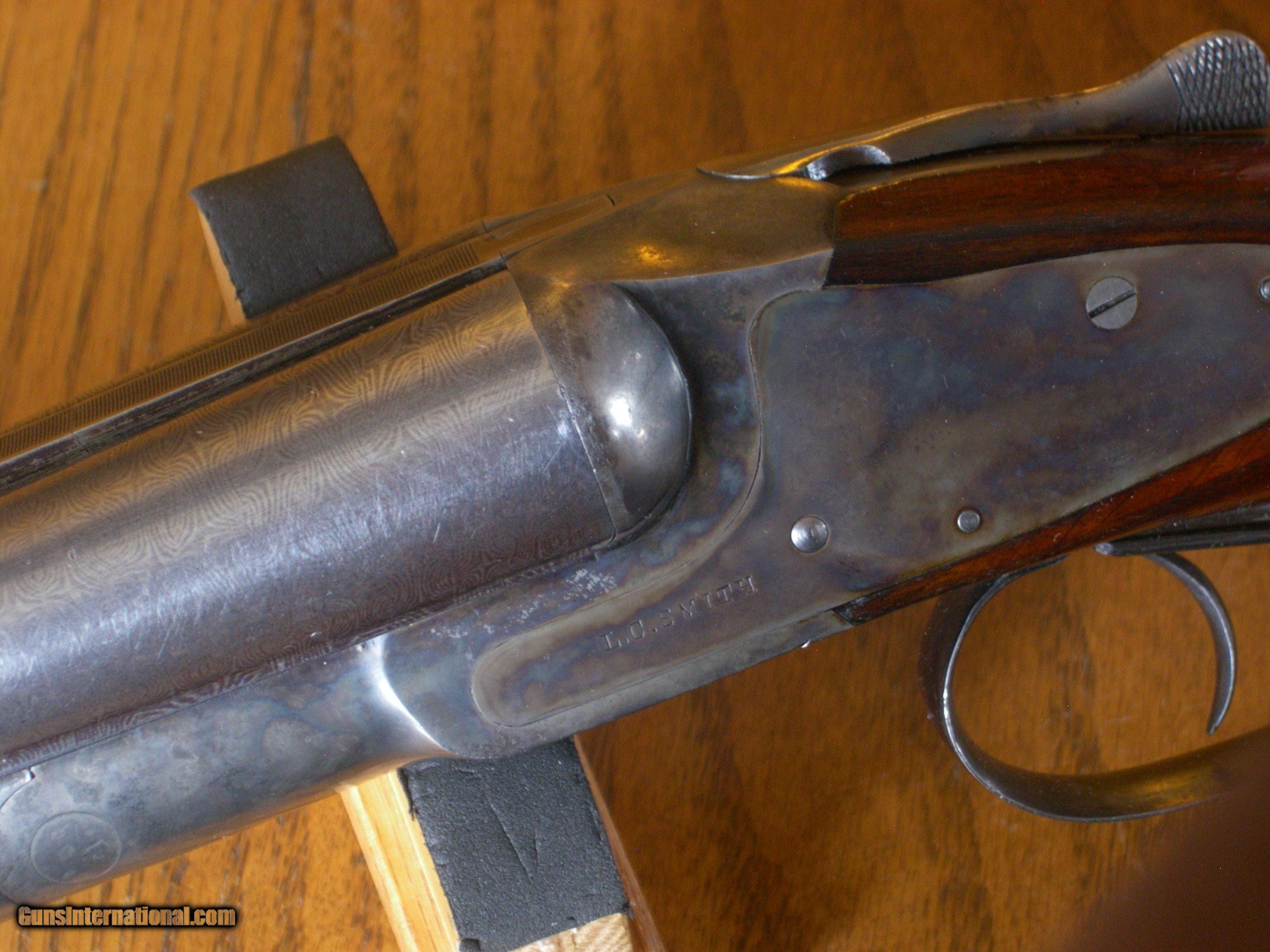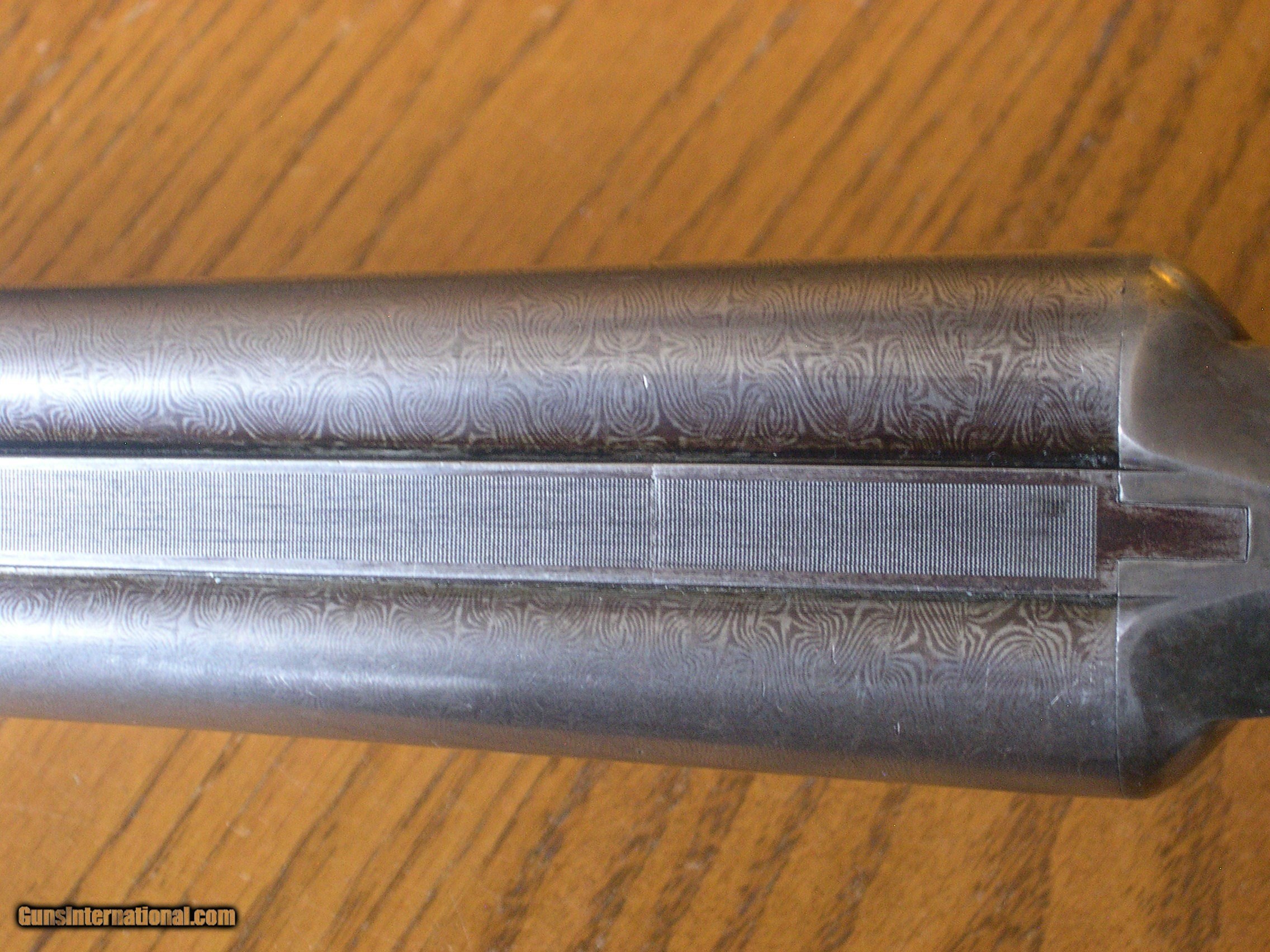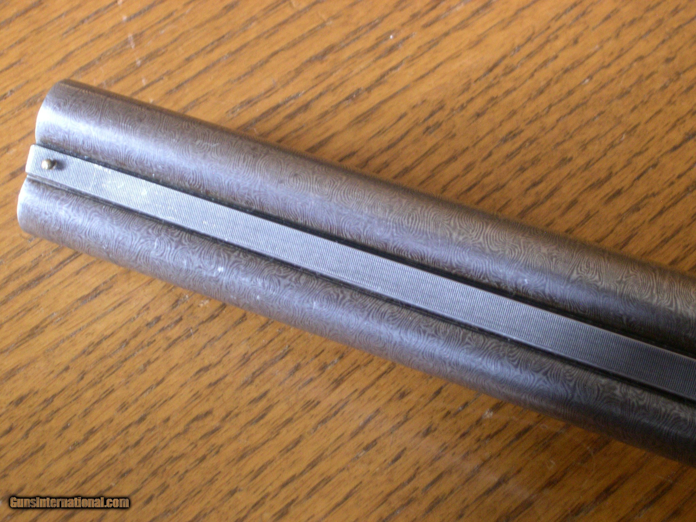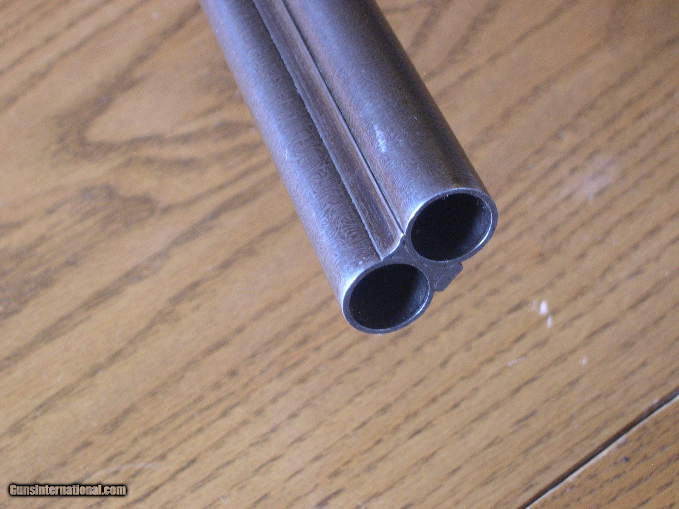 Description: This one, ser# 92XXX is in Exc Plus condition, This is O grade with 30" Damascus barrels that have 97% damascus pattern at least, with shiny perfect bores,not a tiny dent even, in the full length of Bbls! This beauty has 85% case color on sides and top, and 30% on bottom, As you can see in pics, the wood is near perfect with a couple of handling marks, no cracks or dents, and never revarnished since the factory made it! Screws are all great and look original also, full matted rib, and tight as knew to the face of frame, no dissapointments on thei gun, 30" F & F, dac 1 /78" DAH 2 3/4" 14 1/4" LOP to original hard rubber buttplate, certainly not used much for 100 yr old double!! SOLD |