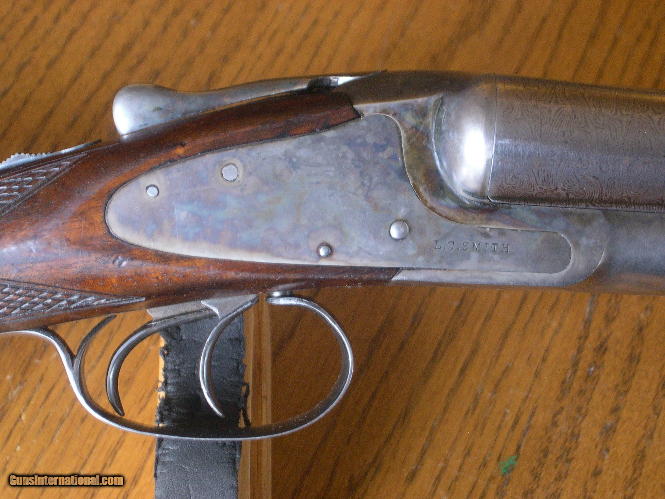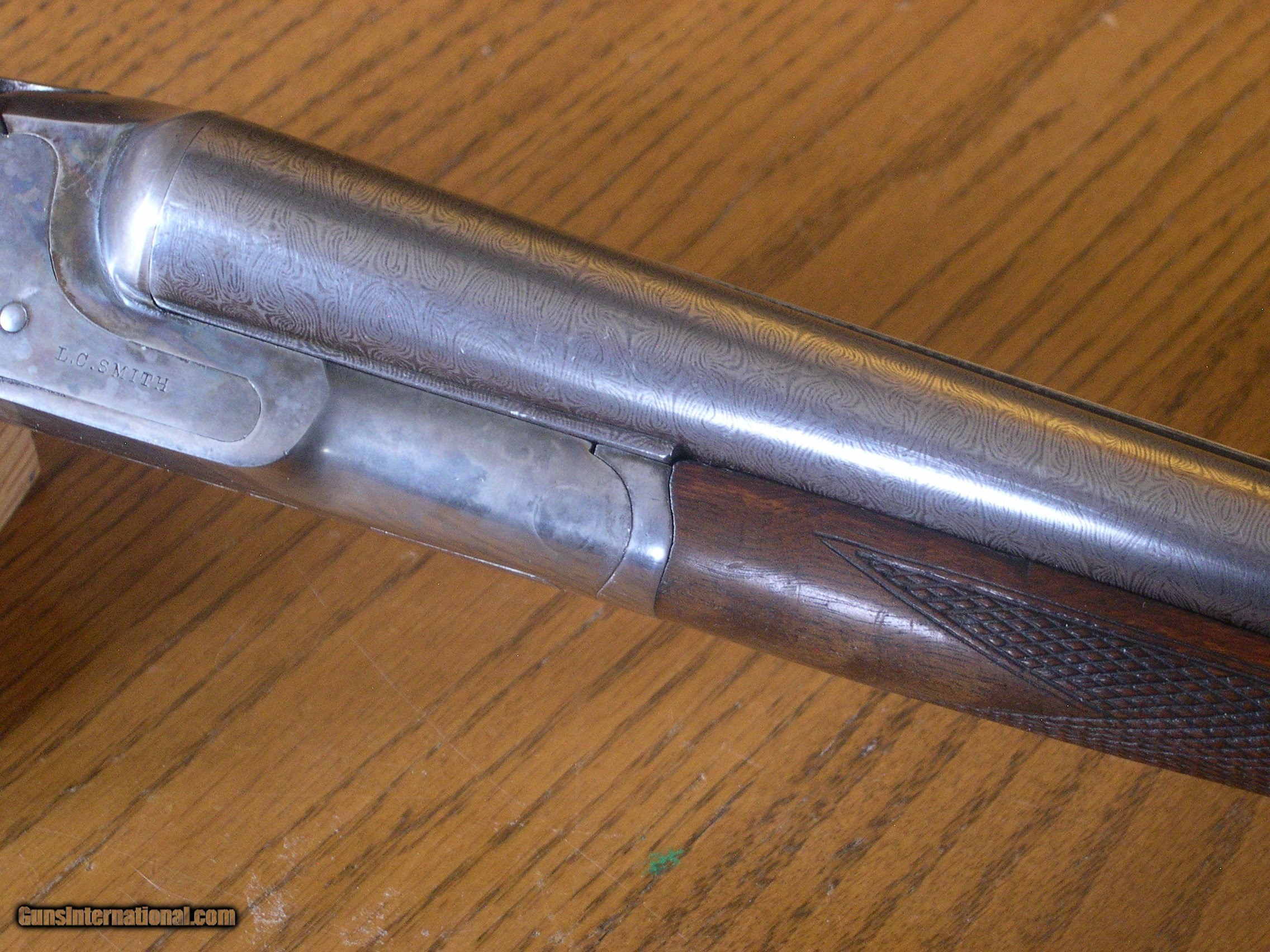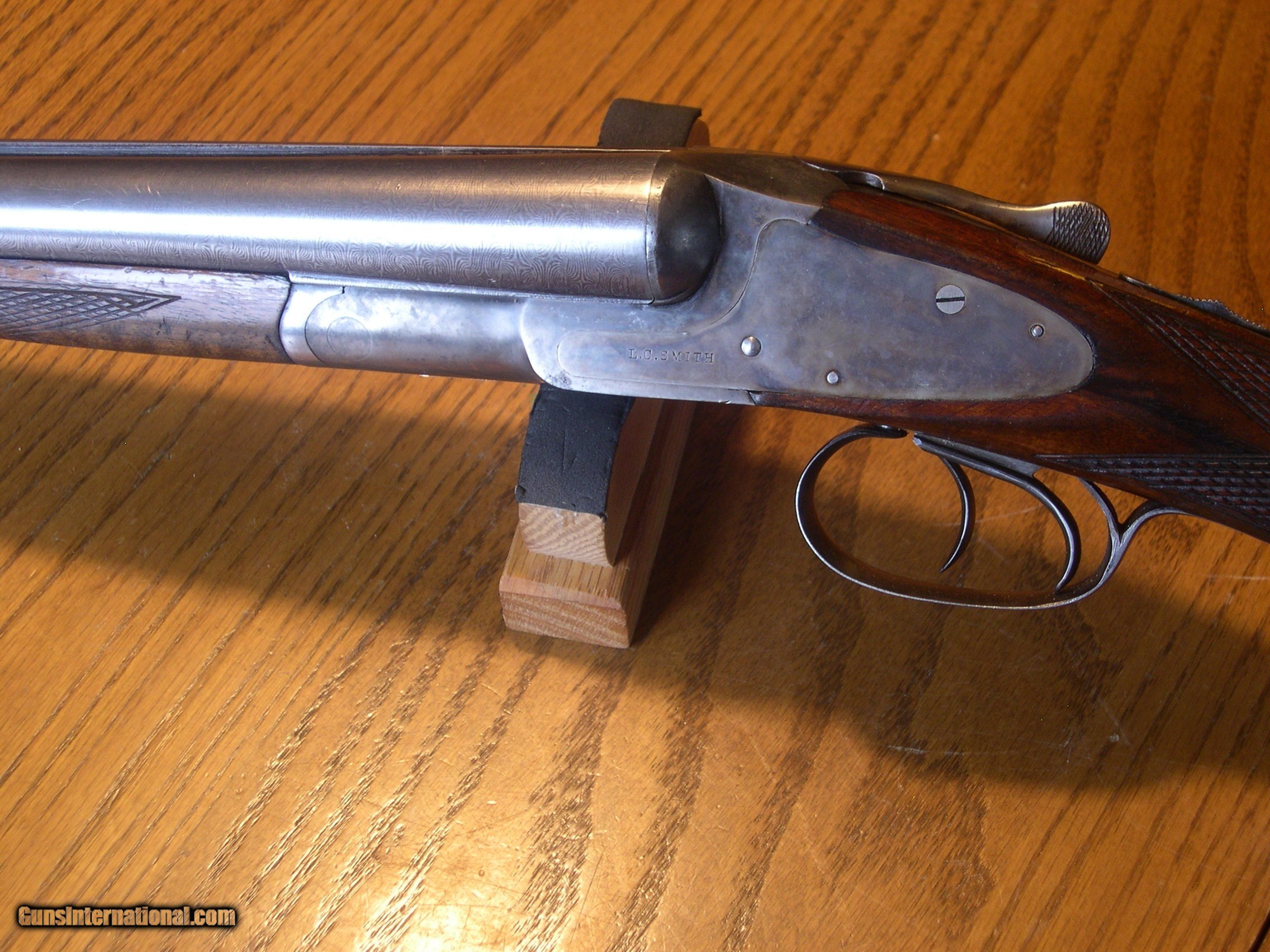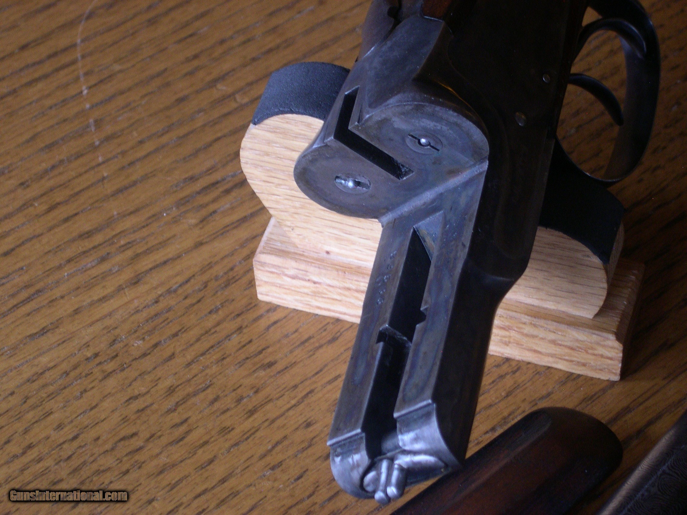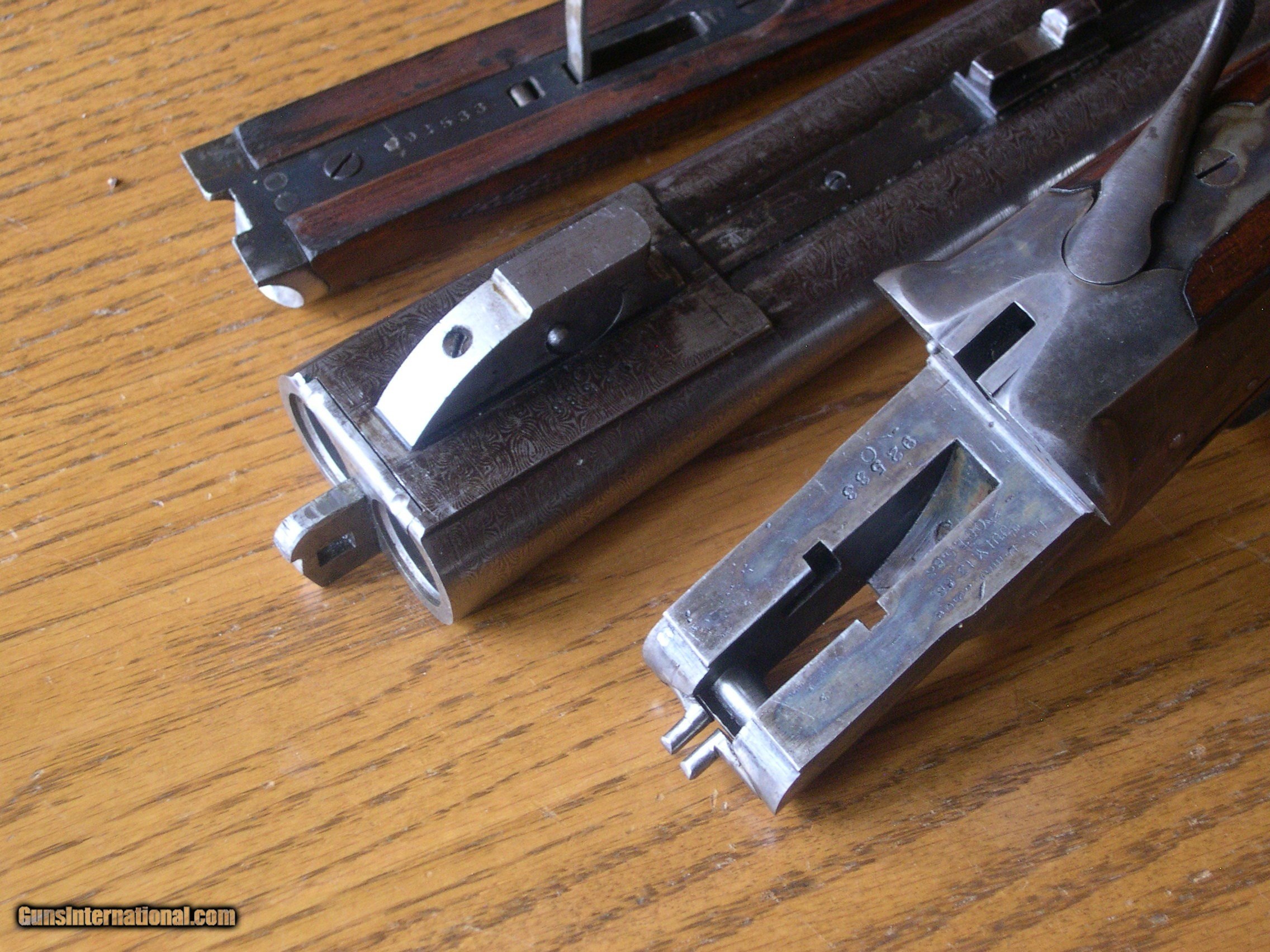 Description: This one, ser# 92XXX is in Exc Plus condition, This is O grade with 30" Damascus barrels that have 97% damascus pattern at least, with shiny perfect bores,not a tiny dent even, in the full length of Bbls! This beauty has 85% case color on sides and top, and 30% on bottom, As you can see in pics, the wood is near perfect with a couple of handling marks, no cracks or dents, and never revarnished since the factory made it! Screws are all great and look original also, full matted rib, and tight as knew to the face of frame, no dissapointments on thei gun, 30" F & F, dac 1 /78" DAH 2 3/4" 14 1/4" LOP to original hard rubber buttplate, certainly not used much for 100 yr old double!! SOLD |