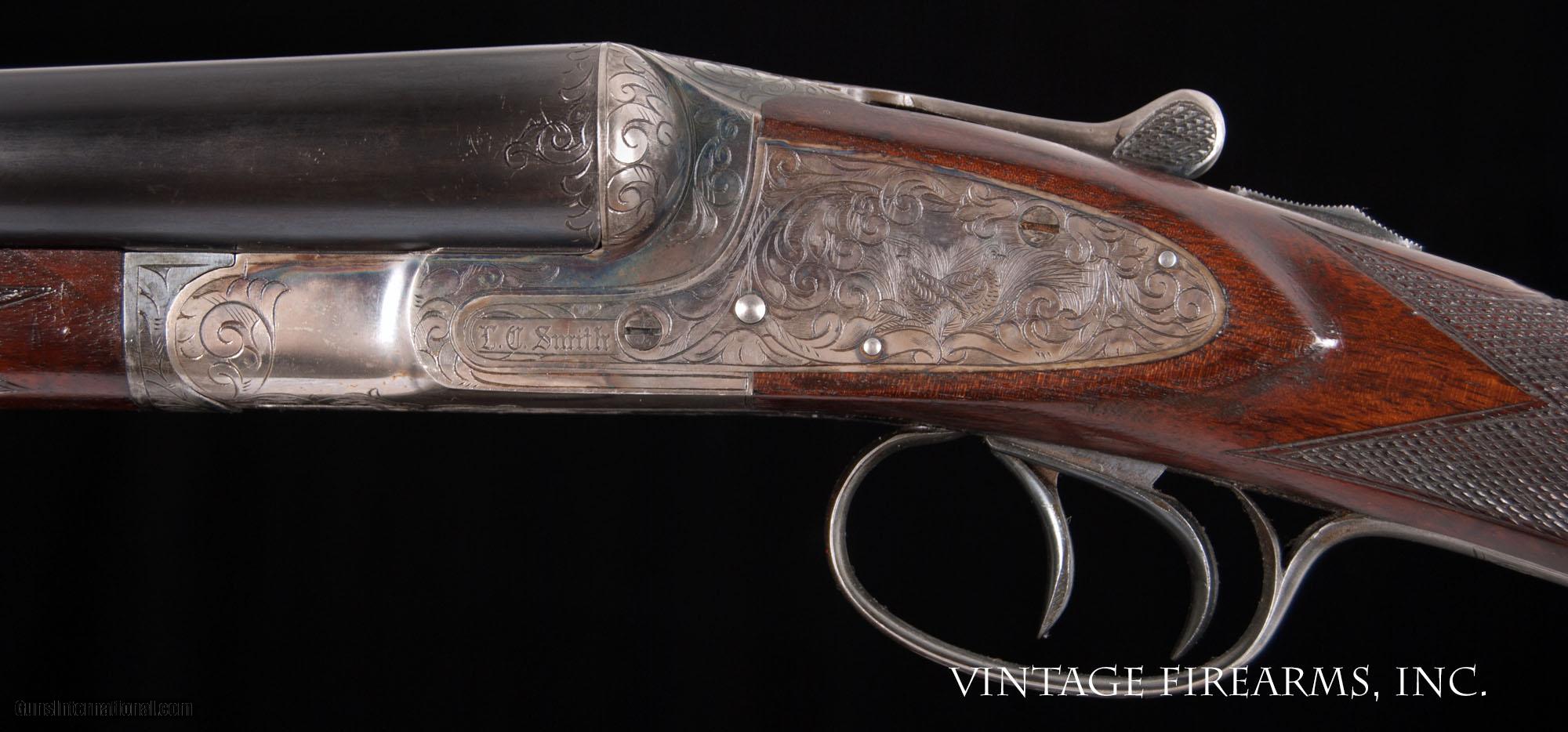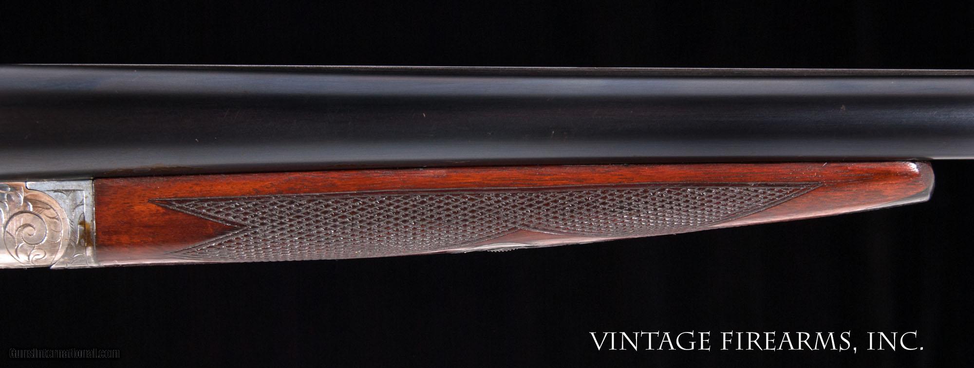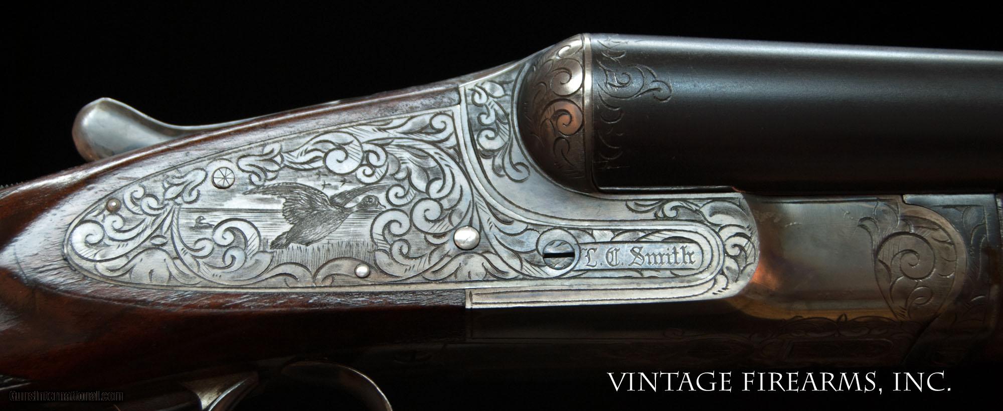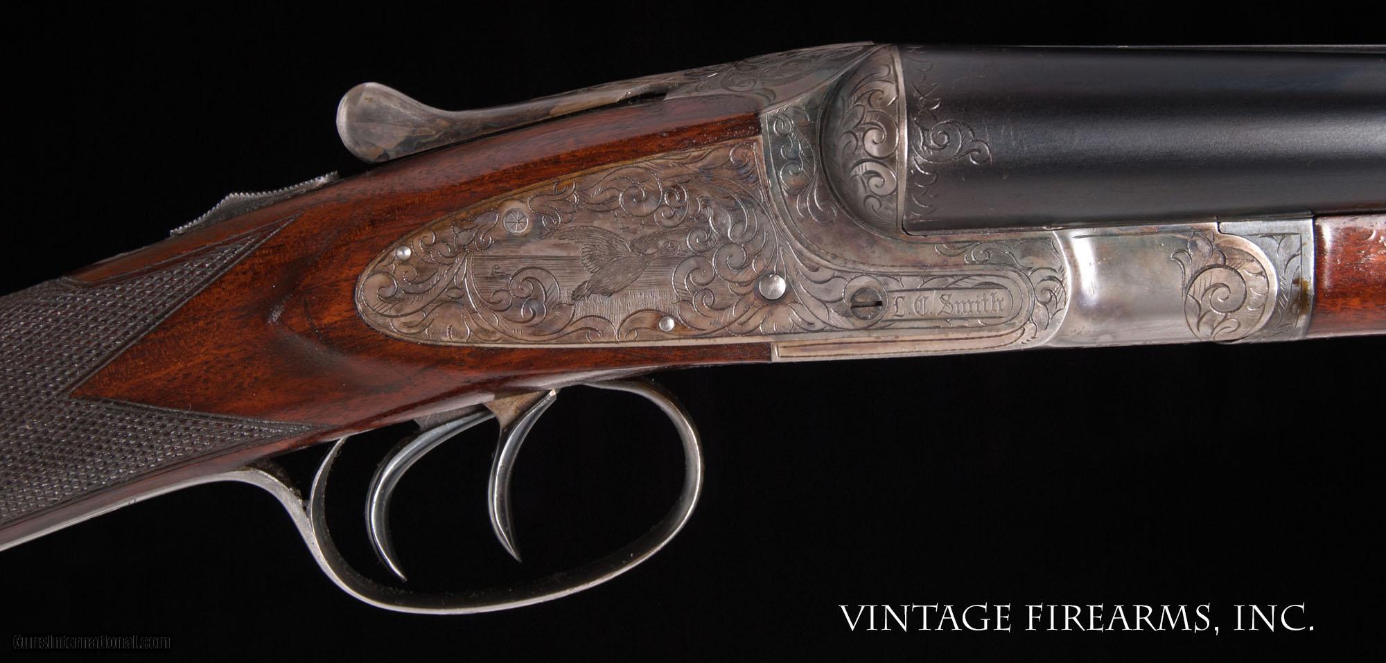 Description: L.C. Smith Specialty 12 Gauge Side-by-Side HIGH FIGURED ENGLISH STOCK, 95% CC General Specs: LC Smith, Year 1918, 12 Gauge, 6lbs 14oz, SxS Serial Number: FW30600 Why are some guns more expensive, more desirable than others that are labeled the same? I get that question often. Take this gun for example. They made 5000 L.C. Smith Specialty Grade guns in 12ga., 2000 of them with 30" barrels like this one. But when I acquired this gun I was super excited. Again, you ask why? Several very important things make this gun special amongst its Specialty Grade brethren. It has the best factory wood you will find on a Specialty Grade...full flame and feather crotch. The English style stock, a feature only found on 10% or so of the 5000 Specialty 12's made. Condition, with 95% factory case color and barrel blue, 98% factory wood finish, perfect screws, checkering, and bores...even the jewelling on the barrel breech face is still fully evident. Most older guns had lots of drop at heel and comb. Not this gun, with its 2 1/8" DAH, 1 1/2" DAC, 1/8" cast off, it has very modern dimensions. Now look at the engraving. Knowledgeable vintage double gunners often consider the engraving on a Specialty grade a bit crude and rough. This engraving is noticeably superior to all but a few. And last, this gun has amazing handling characteristics, weighing just 6lbs. 14oz. with its 30" barrels and balanced perfectly in hand. Made in 1918, snFW30600 is a special Elsie, and once you have her in hand you will agree with my analysis. This one is stunning. With the 30" Full choke barrels it would be a fine waterfowler, pheasant gun, or turkey killer. With a pocket full of RST spreader loads you can choose to have a more open pattern, or have us open the chokes to your preference within a week of purchase. We have full time gunsmiths so we can change dimensions, chokes, chambers etc. at your request without a wait. This gun has it all...only 200 with English stock and 30" barrels... so rare, high factory condition, very desirable features, and knock out wood. It will be a gun for you to enjoy as it gains in value. All who see it will want it. Thanks for looking! Barrels Barrel Length: 30" Chokes: F/F .035/.031 Bores: mirrors Bore Diameter: .728/.725 Wall Thickness: .019/.022 % Blue: 93% factory Chambers: 2 3/4" Ribs: tight Sights: single Action Action: tight - way right of center Ejectors or Extractors: extractor Case Color: 95% factory Screws: excellent Engraving: superior for Specialty by far! Trigger Type: double, crisp Trigger Guard Color: grey Stock Type: english stock/splinter forend/ xxx figure LOP: 13 7/8" LOP To End Of Wood: 13 5/8" DAH: 2 1/8" DAC: 1 1/2" Cast: 1/8" off Checkering Condition: excellent Butt Treatment: factory plate There are more photos upon request. We offer a 30 day mechanical warranty on this fine shotgun. Call us for full details. PLEASE SEE MY OTHER FINE VINTAGE FIREARMS. Just open one of my ads and click on the line that says “see all items from this seller” and a very nice list of fine sporting and collectible arms will appear. I have many more fine sxs shotguns not yet listed. Thanks for looking! We employ a full time gunsmith on premises and can perform alterations to suit your needs within a few weeks of purchase. Payment Methods: Money Order, Certified Check, Personal Check, Wire Transfer Inspection Period / Return Policy: Three Days from the date the item was received. Sales Tax: 6% Michigan Only Shipping & Insurance: Ground $55.00 We ship internationally! Item Condition: Used Requires FFL?: Yes If you have any questions about this item or payment, please email or call us directly, at #616-292-6240. Thanks! Jay Shachter, Vintage Firearms, Inc We employ a full time gunsmith on premises and can perform alterations to suit your needs within a few weeks of purchase. Common requests are: -stock bending to suit your particular requirements -addition of any specified butt pad to increase length of pull -alteration of chokes to suit your shooting preferences -lengthening of chambers and forcing cones -darkening stock color with penetrating stains -restoring any part of the gun including rust blue, charcoal blue, bone and charcoal case color, wood restoration and checkering recuts. If you like one our guns but it needs "tweaked", let us know and we can quote you a time and price. Some enthusiasts like the guns "as found" and others want them "just so". We often list guns as found and let the particular buyer choose how they want their gun to fit or look. SOLD Curio/Relic: Yes |