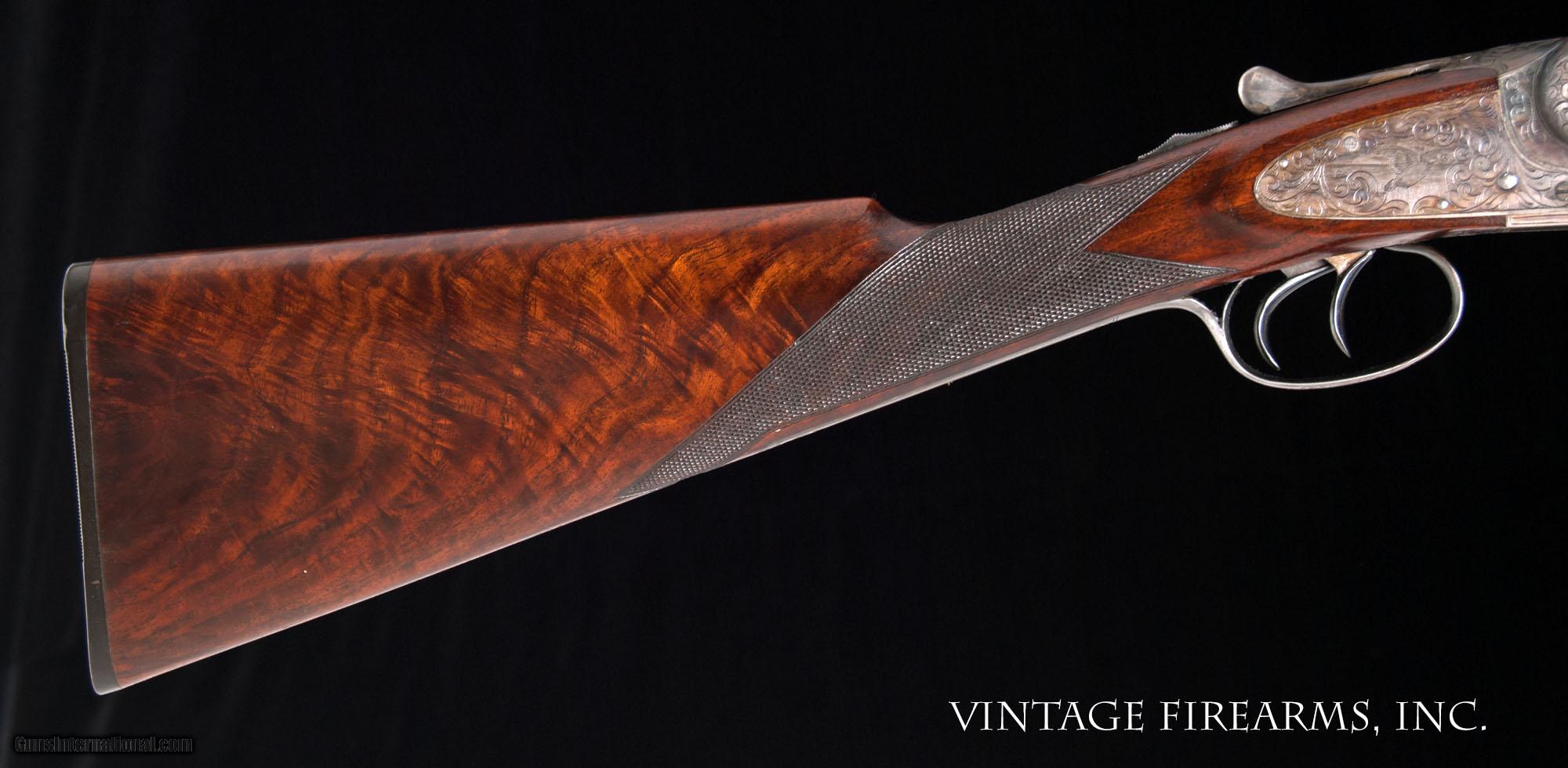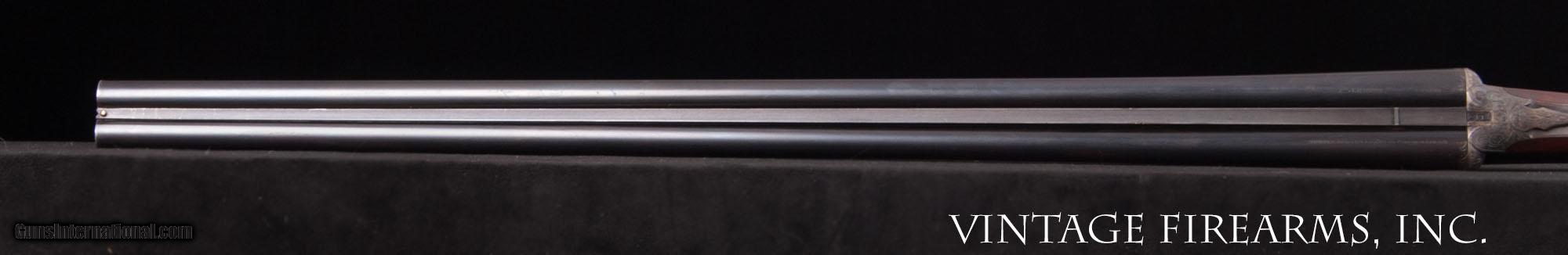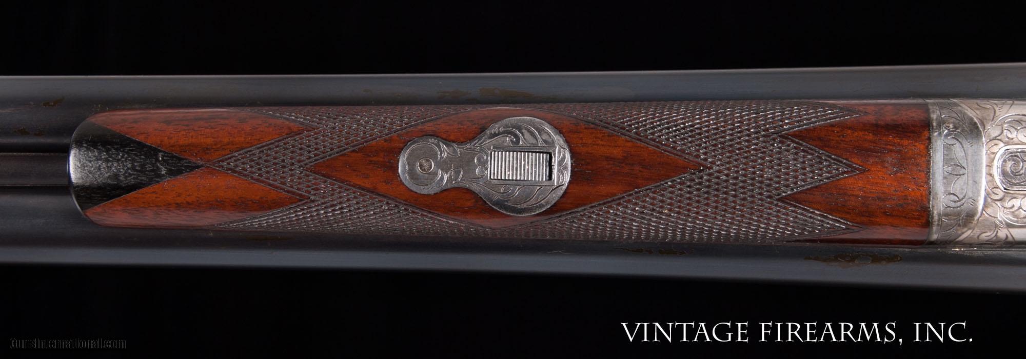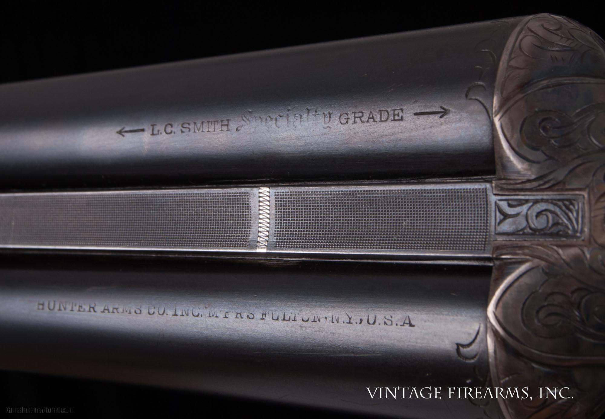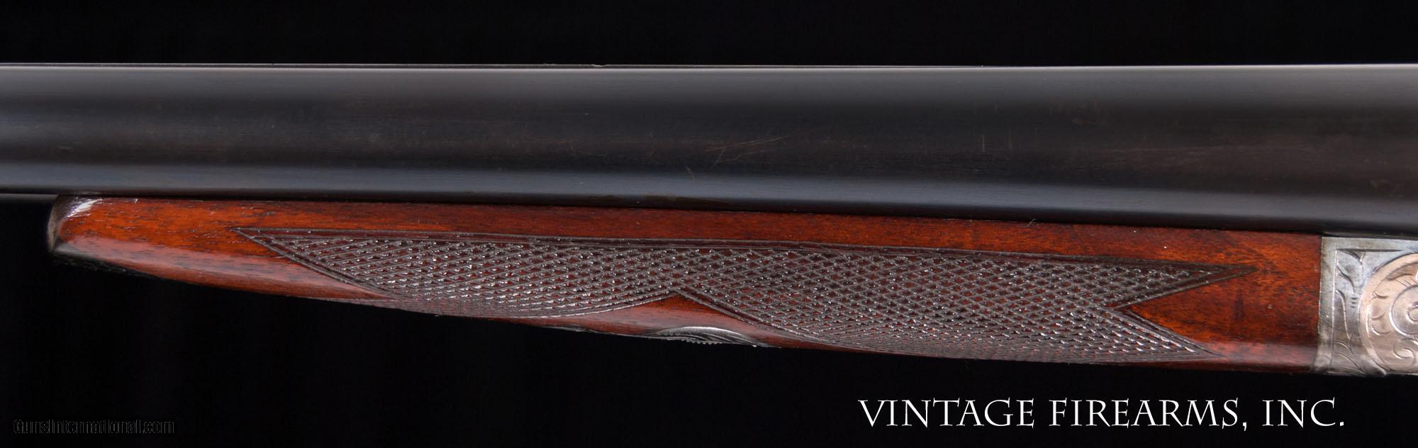 Description: L.C. Smith Specialty 12 Gauge Side-by-Side HIGH FIGURED ENGLISH STOCK, 95% CC General Specs: LC Smith, Year 1918, 12 Gauge, 6lbs 14oz, SxS Serial Number: FW30600 Why are some guns more expensive, more desirable than others that are labeled the same? I get that question often. Take this gun for example. They made 5000 L.C. Smith Specialty Grade guns in 12ga., 2000 of them with 30" barrels like this one. But when I acquired this gun I was super excited. Again, you ask why? Several very important things make this gun special amongst its Specialty Grade brethren. It has the best factory wood you will find on a Specialty Grade...full flame and feather crotch. The English style stock, a feature only found on 10% or so of the 5000 Specialty 12's made. Condition, with 95% factory case color and barrel blue, 98% factory wood finish, perfect screws, checkering, and bores...even the jewelling on the barrel breech face is still fully evident. Most older guns had lots of drop at heel and comb. Not this gun, with its 2 1/8" DAH, 1 1/2" DAC, 1/8" cast off, it has very modern dimensions. Now look at the engraving. Knowledgeable vintage double gunners often consider the engraving on a Specialty grade a bit crude and rough. This engraving is noticeably superior to all but a few. And last, this gun has amazing handling characteristics, weighing just 6lbs. 14oz. with its 30" barrels and balanced perfectly in hand. Made in 1918, snFW30600 is a special Elsie, and once you have her in hand you will agree with my analysis. This one is stunning. With the 30" Full choke barrels it would be a fine waterfowler, pheasant gun, or turkey killer. With a pocket full of RST spreader loads you can choose to have a more open pattern, or have us open the chokes to your preference within a week of purchase. We have full time gunsmiths so we can change dimensions, chokes, chambers etc. at your request without a wait. This gun has it all...only 200 with English stock and 30" barrels... so rare, high factory condition, very desirable features, and knock out wood. It will be a gun for you to enjoy as it gains in value. All who see it will want it. Thanks for looking! Barrels Barrel Length: 30" Chokes: F/F .035/.031 Bores: mirrors Bore Diameter: .728/.725 Wall Thickness: .019/.022 % Blue: 93% factory Chambers: 2 3/4" Ribs: tight Sights: single Action Action: tight - way right of center Ejectors or Extractors: extractor Case Color: 95% factory Screws: excellent Engraving: superior for Specialty by far! Trigger Type: double, crisp Trigger Guard Color: grey Stock Type: english stock/splinter forend/ xxx figure LOP: 13 7/8" LOP To End Of Wood: 13 5/8" DAH: 2 1/8" DAC: 1 1/2" Cast: 1/8" off Checkering Condition: excellent Butt Treatment: factory plate There are more photos upon request. We offer a 30 day mechanical warranty on this fine shotgun. Call us for full details. PLEASE SEE MY OTHER FINE VINTAGE FIREARMS. Just open one of my ads and click on the line that says “see all items from this seller” and a very nice list of fine sporting and collectible arms will appear. I have many more fine sxs shotguns not yet listed. Thanks for looking! We employ a full time gunsmith on premises and can perform alterations to suit your needs within a few weeks of purchase. Payment Methods: Money Order, Certified Check, Personal Check, Wire Transfer Inspection Period / Return Policy: Three Days from the date the item was received. Sales Tax: 6% Michigan Only Shipping & Insurance: Ground $55.00 We ship internationally! Item Condition: Used Requires FFL?: Yes If you have any questions about this item or payment, please email or call us directly, at #616-292-6240. Thanks! Jay Shachter, Vintage Firearms, Inc We employ a full time gunsmith on premises and can perform alterations to suit your needs within a few weeks of purchase. Common requests are: -stock bending to suit your particular requirements -addition of any specified butt pad to increase length of pull -alteration of chokes to suit your shooting preferences -lengthening of chambers and forcing cones -darkening stock color with penetrating stains -restoring any part of the gun including rust blue, charcoal blue, bone and charcoal case color, wood restoration and checkering recuts. If you like one our guns but it needs "tweaked", let us know and we can quote you a time and price. Some enthusiasts like the guns "as found" and others want them "just so". We often list guns as found and let the particular buyer choose how they want their gun to fit or look. SOLD Curio/Relic: Yes |
