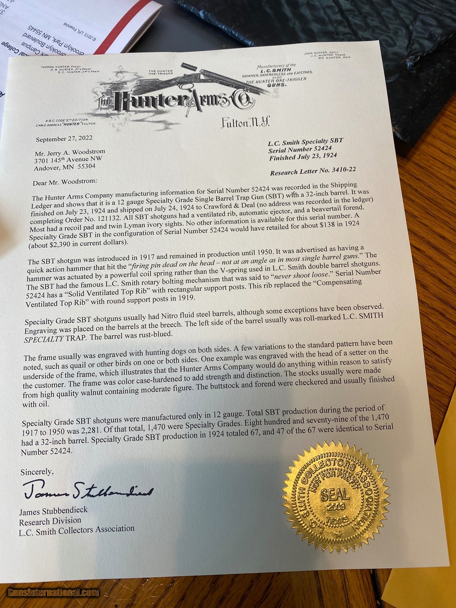 Description: L.C. Smith – Specialty-5 BT (Trap) – 12ga. Mfg. 1921. Single Barrel Trap Shotgun – w/32” Full Choke, High Vent-Rib Dual Ivory Bead Barrel – Blued Finish w/a Large Amount of Case Color Remaining – w/Fine Checkered Capped Pistol Grip Wood Butt Stock w/Period Leather Covered Pad, Butt Stock Also Has a Gold Oval in it w/Engraved “JUM” Initials & Matching Quality Checkered Wood Forend w/Ebony Forend Cap – w/Pull Trigger – Very Honest Tight Gun w/Great Bore – Only 1470 Mfg. Between 1917-1948 – Serial #S52424 Excellent Overall Condition, Beautiful craftsmanship and wood. Engraved panels feature a retriever on left panel and a Quail on Right panel. Comes with very interesting Gold embossed factory letter specific to this shotgun. Rare vintage trap gun in top condition with factory provenance. Add 3% if paying with credit card. Free shipping for US veterans and retired LEO. God Bless America from a proud American, and a Viet Nam Vet , thankful for our freedoms.. paid for by the Blood ,Sweat and Tears of our brave men and women in uniform. Ten Below Firearms is a Veteran owned and operated business. We specialize in out of production models of high quality firearms. We love to ship! We ship to all states where legal, just give us a call! Handguns normally ship for $35 and Long guns for $45 up to $75 for extra length long guns. That's 2-3 day USPS Priority shipping, Delivery conformation and with tracking number. Optional Postal insurance is additional $1.70 per $100 and highly recommended. We are OPEN BY APPOINTMENT ONLY FOR IN PERSON VISITS, We trade, sometimes. Layaway:If needed we offer a 60 day layaway program. Terms, 1/3 of purchase price down, 1/3 due in 30 days, and the final third to include card fees and shipping due at 60 days. Funds are non transferable and non refundable .Layaway is not available on negotiated prices. SOLD Curio/Relic: Yes Shotgun Gauge: 12 Gauge Manufacturer: L.C. Smith Model: Specialty -5 BT Trap Serial Number: S52424 Barrel Length: 32 inch Ejectors: Yes Condition: Excellent Metal Condition: Excellent Wood Condition: Excellent Bore Condition: Excellent Action: Break LOP: 14.5 inch Rib: High vented rib Finish: Blued/ case colored Sights: Ivory beads Engraving: Hand panel engraved Item Location: Mn |