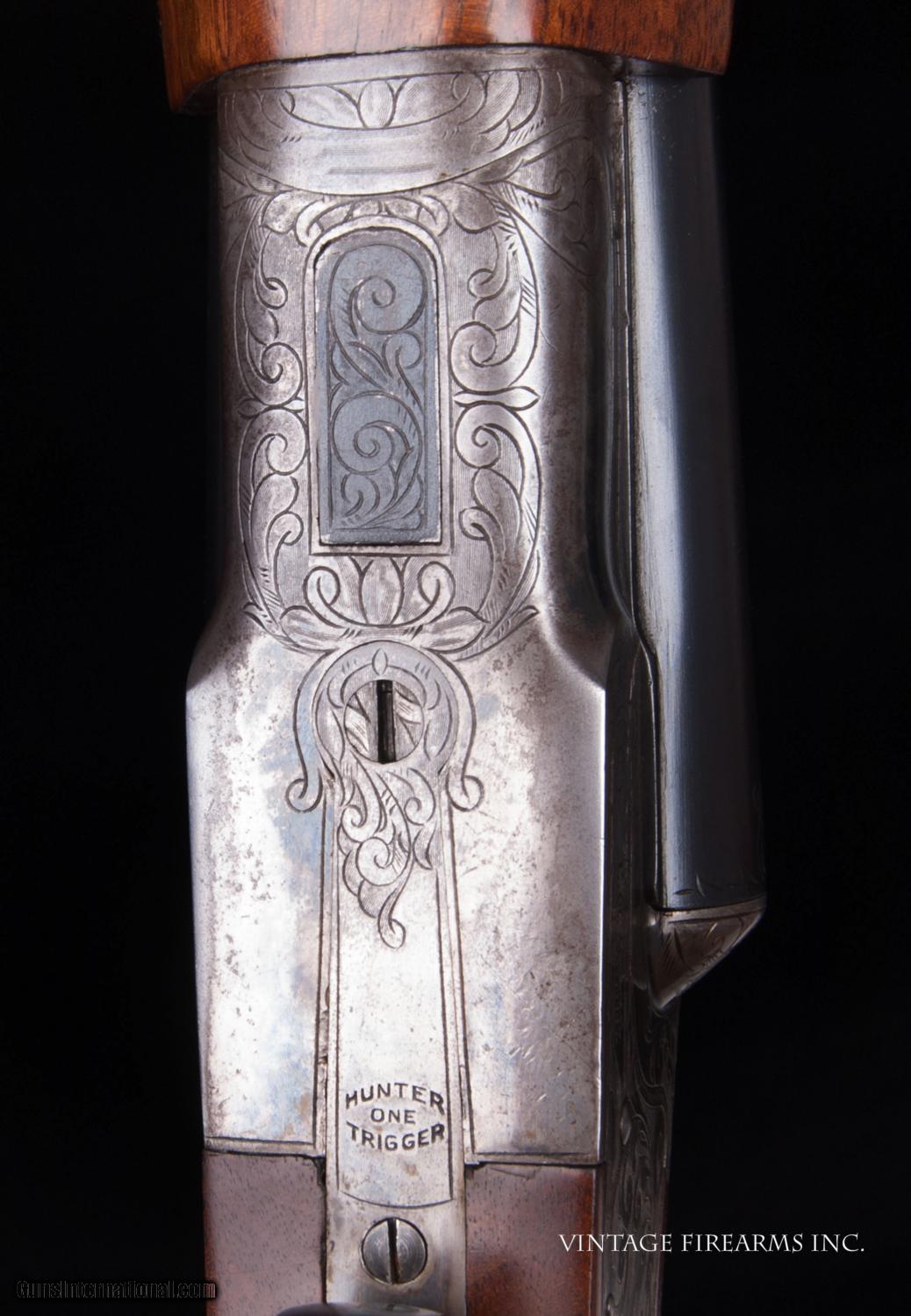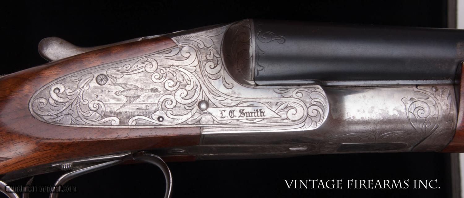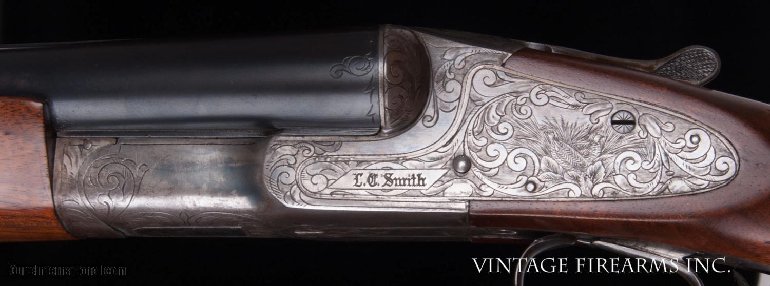 Description: L.C. Smith Specialty Grade 12 Gauge SxS Shotgun TRAP CONFIGURED, VENT RIB General Specs: LC Smith, Year 1929, 12 Gauge, 7lbs 15oz, Side by Side Serial Number: 123299 In the world of L.C. Smith shotguns built after 1912, the Specialty is a well appointed gun, with generous engraving, nicely figured wood, finely checkered, and equal to a Grade 3 gun of other makers, ie DH Parker, C Grade Fox, etc. They made over 4800 guns in Specialty Grade 12ga., so they are not rare, but not profuse either. But this gun, serial number 123299 built in 1929, is special. First, it has every factory option including ejectors, Trap style beavertail forend, double ivory beads, single selective trigger, ventilated rib, and factory pad. AND IT HAS FANTASTIC WOOD with full feather crotch exhibition quality walnut. Without a crack or split anywhere, great screws, excellent wood to metal fit, this gun is a gorgeous heavy duty 12ga. for clays or game. This is a lot of gun for the money in the world of fine shotguns. Where else can you find such a beautiful, functional doublegun with a ventilated rib and stunning wood for under $5K? Vintage American double guns fully optioned like this fine Elsie are a treasure, and a solid investment that will grow in value as fewer and fewer such examples survive use and abuse. Barrels Barrel Length: 30" Chokes: .044/.036 XF/F Bores: very good Bore Diameter: .731/.728 Wall Thickness: .028/.022 % Blue: 97% Chambers: 2 3/4" Ribs: vent rib, tight Sights: double ivory Action Action: tight Ejectors or Extractors: ejectors, strong, timed Case Color: 30% Screws: excellent Engraving: clear sharp Trigger Type: single selective trigger, crisp Trigger Guard Color: 30% Stock Type: capped pistol grip/trap beavertail replacement LOP: 14 7/8" LOP To End Of Wood: 13 7/8" DAH: 2 1/4" DAC: 1 5/16" Cast: 3/16" off Checkering Condition: perfect Butt Treatment: hawkins pad There are more photos upon request. We offer a 30 day mechanical warranty on this fine shotgun. Call us for full details. PLEASE SEE MY OTHER FINE VINTAGE FIREARMS. Just open one of my ads and click on the line that says “see all items from this seller” and a very nice list of fine sporting and collectible arms will appear. I have many more fine sxs shotguns not yet listed. Thanks for looking! JOIN US at the LAS VEGAS ANTIQUE/SPORTING ARMS & CUSTOM KNIVES SHOW on January 22 - 24, 2016. It will be held at a new venue, the Westgate Resort & Casino in Las Vegas, NV! We employ a full time gunsmith on premises and can perform alterations to suit your needs within a few weeks of purchase. Payment Methods: Money Order, Certified Check, Personal Check, Wire Transfer Inspection Period / Return Policy: Three Days from the date the item was received. Sales Tax: 6% Michigan Only Shipping & Insurance: Ground $55.00 We ship internationally! Item Condition: Used Requires FFL?: Yes If you have any questions about this item or payment, please email or call us directly, at #616-292- 6240. Thanks! Jay Shachter, Vintage Firearms, Inc SOLD Curio/Relic: Yes |