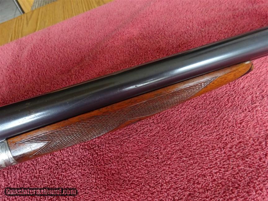 Description: L C SMITH, HUNTER ARMS, SPECIALTY GRADE 12 GAUGE, 30" BARRELS, FULL & FULL, 2 3/4" CHAMBERS, VERY GOOD BLUE, MIRROR BORES, AUTOMATIC EJECTORS. HUNTER SINGLE SELECTIVE TRIGGER, REGULAR FRAME, BOLD VIVID CASE COLOR, TYPICAL ENGRAVING PATTERN WITH WATERFOWL ON RIGHT AND QUAIL ON LEFT PLUS SCROLLWORK AND BORDERS. HALF PISTOL GRIP STOCK, SPLINTER FOREARM, HIGHLY FIGURED WOOD, NEAR PERFECT CHECKING, 1 1/2" X 2 1/2" X 13 1/2", SILVERS PAD. 7 POUNDS 10 OUNCES. PROFESSIONAL REPAIR BEHIND LOCK. VERY ATTRACTIVE SMITH, PLEASING CONDITION, 100% ORIGINAL TRIGGERGUARD AND FOREARM LATCH BLUE, UNTURNED SCREWS, TOP LEVER TO FAR RIGHT. MADE IN 1923. $3500.00 + $50.00 Insured shipping to an FFL address. See all Pats listings We also have hundreds of pieces of ORIGINAL gun company advertising & memorabilia available for sale. We have no reprints or reproductions. Email for more information. SOLD Curio/Relic: Yes |