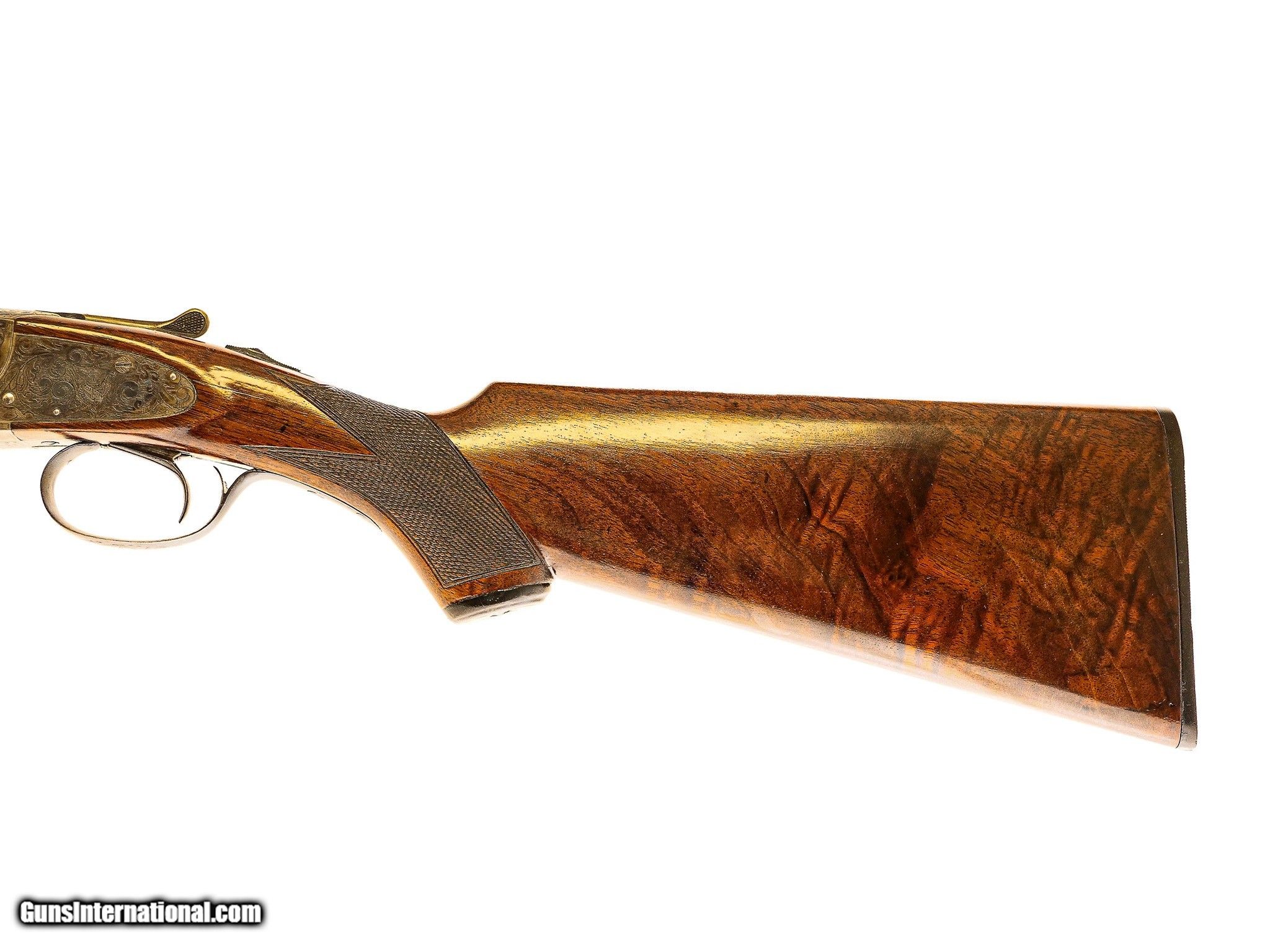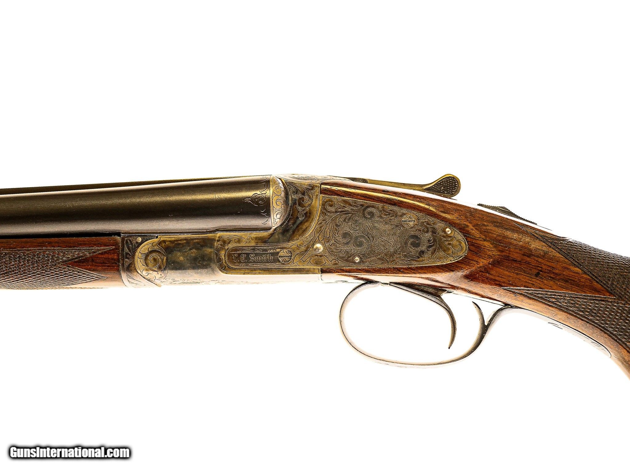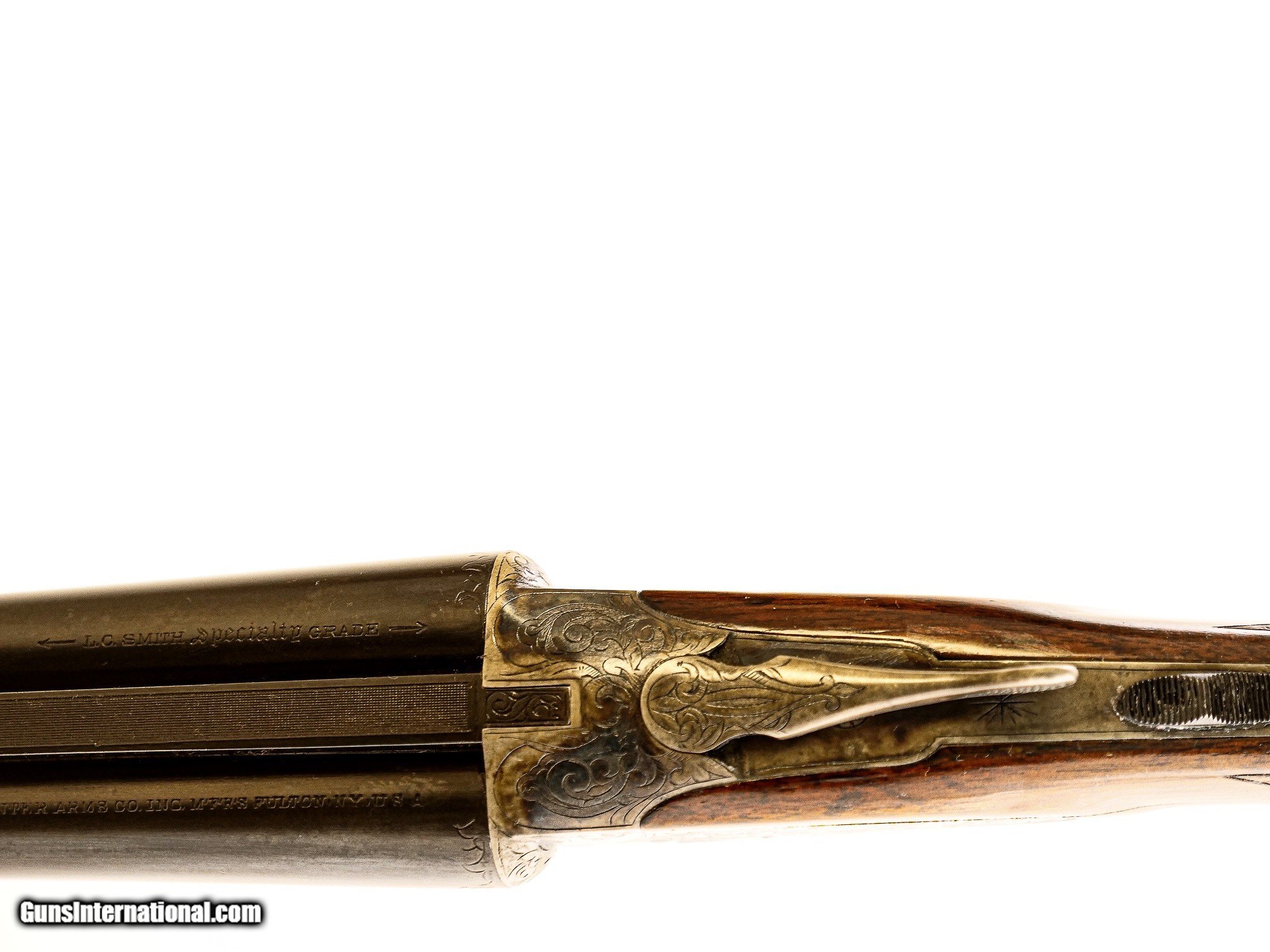 Description: L.C. Smith - Specialty Grade, SxS, 99% Condition, 20ga. 28" Barrels Choked IM/F. Hunter 1 trigger, capped pistol grip, butt plate, splinter forend, auto ejector, 99% case color, blue, and wood finish. The gun is possibly unfired, perfect screws, small handling marks on wood. Hunter Arms Co. gun. Case color is shiny, perfect engraving, outstanding collector grade gun, all the trigger guard blue. A near perfect gun. Inv: 63763 6 lbs. 1 oz. 14 3/8" x 1 3/8" x 2 1/2" $10,995.00 SOLD |