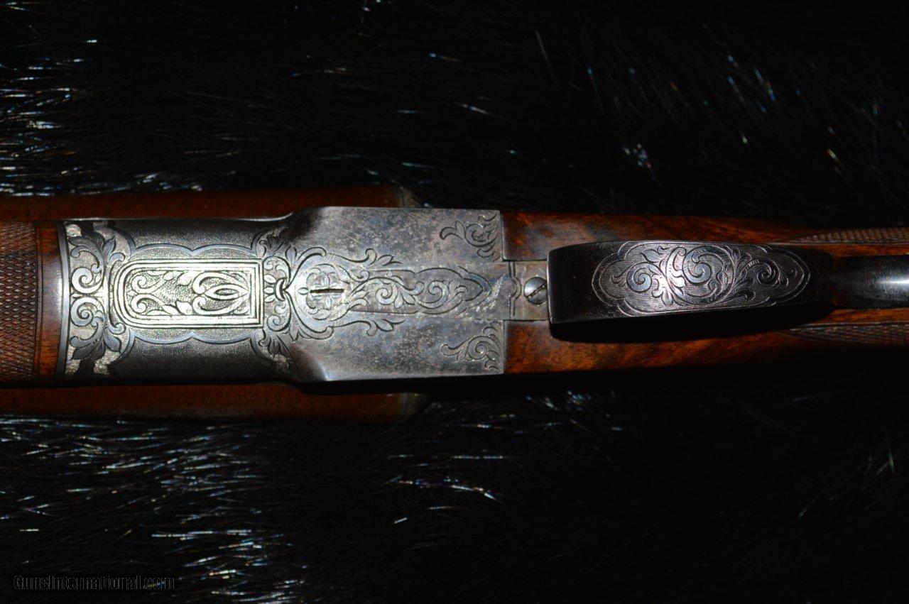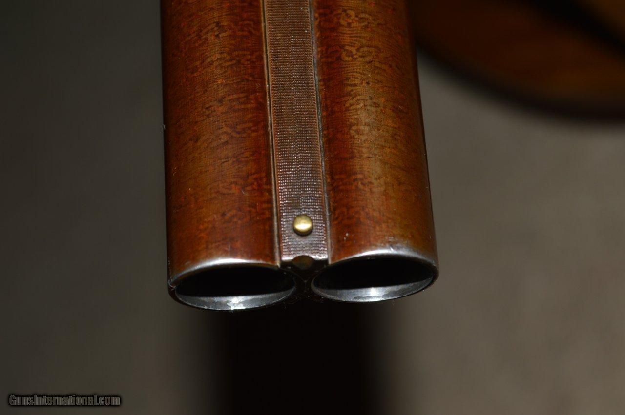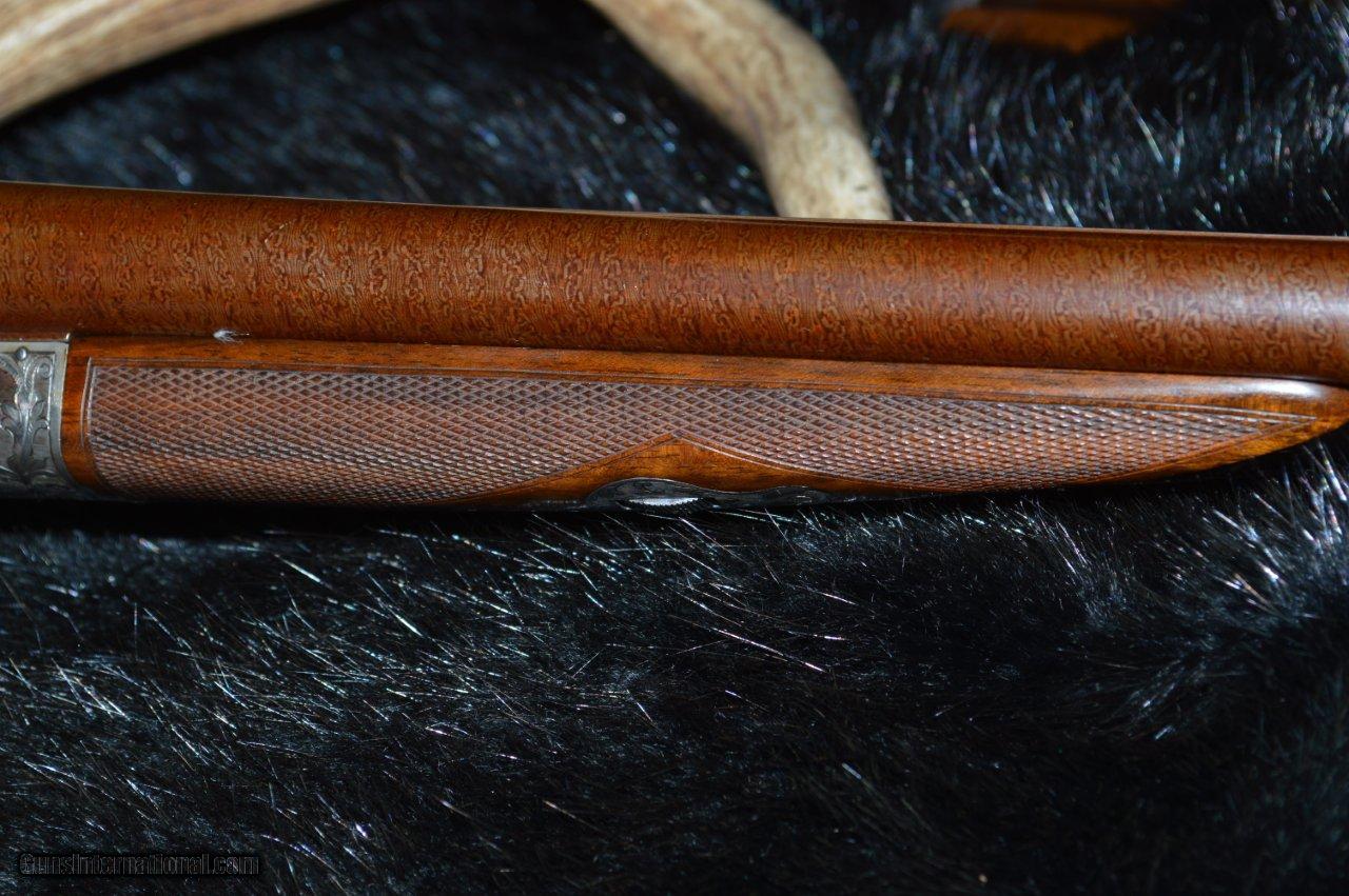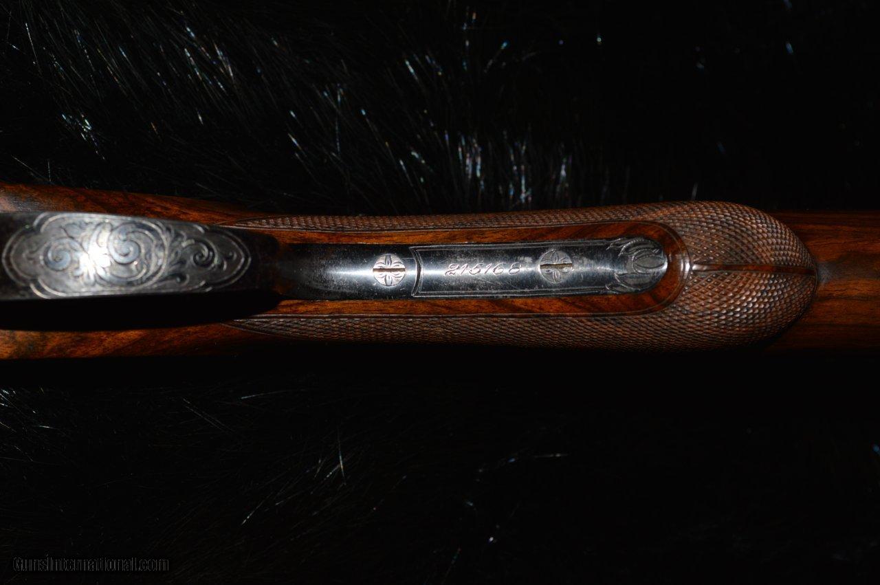 Description: This is an Eagle grade made in 1912, right at the transition between the numbered and named models. It has 30" Damascus barrels that have one hundred years of patina on them and they are choked L = full and R = IM with 2-3/4" chambers. The stock is some of the most gorgeous English walnut that the Hunter Bros ever put on a gun. The stock has a 15-1/8" LOP to the first trigger with a 1-3/4" drop at the comb and a 3" drop at the heal. The long length of pull negates the 3" drop and the gun mounts wonderfully. It has a 3 position safety, although one wonders why. The ejectors are strong and timed correctly. This gun is in very good condition because it appears that it has not been shot much. The bores are clean and shiny and the checkering is beautiful. Own a piece of history. SOLD |