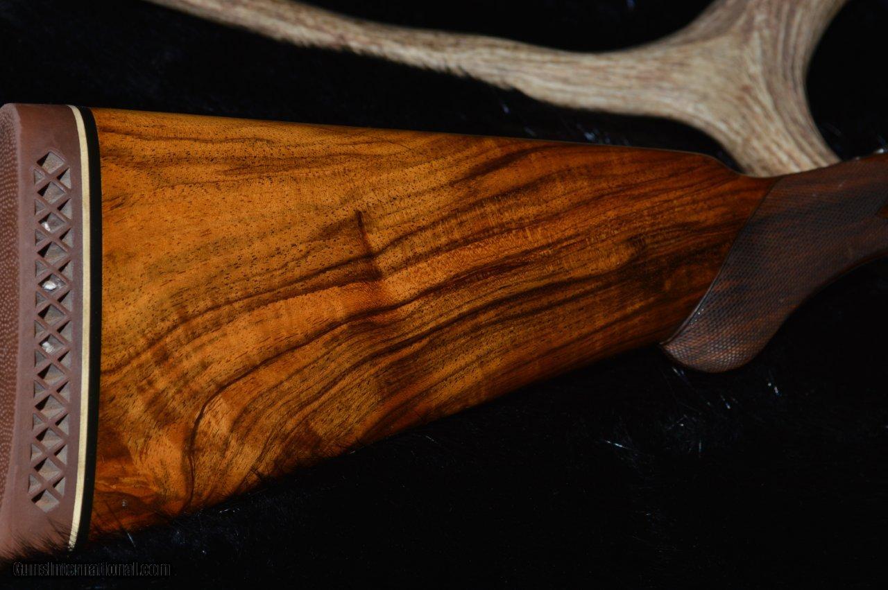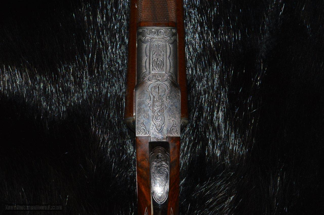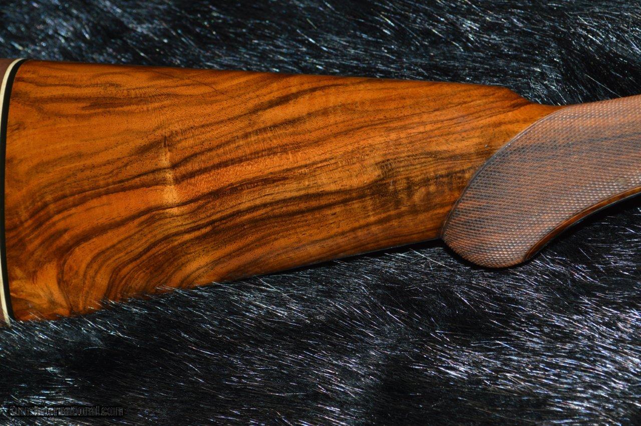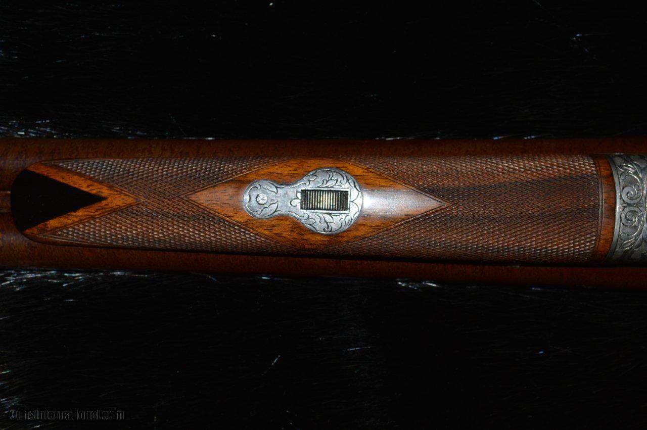 Description: This is an Eagle grade made in 1912, right at the transition between the numbered and named models. It has 30" Damascus barrels that have one hundred years of patina on them and they are choked L = full and R = IM with 2-3/4" chambers. The stock is some of the most gorgeous English walnut that the Hunter Bros ever put on a gun. The stock has a 15-1/8" LOP to the first trigger with a 1-3/4" drop at the comb and a 3" drop at the heal. The long length of pull negates the 3" drop and the gun mounts wonderfully. It has a 3 position safety, although one wonders why. The ejectors are strong and timed correctly. This gun is in very good condition because it appears that it has not been shot much. The bores are clean and shiny and the checkering is beautiful. Own a piece of history. SOLD |