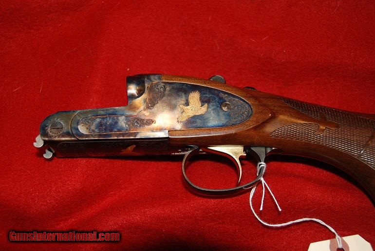 Description: SALE PENDING. We have here an almost new condition Marlin L.C. Smith Field Grade Double Barrel Shotgun in 28 Gauge. This gun was made in Spain for Marlin. 26 inch barrels, 2 3/4 inch chambers, selective ejectors, with 3 screw-in choke tubes (modified/modified installed, full choke tube in box). Wrench is missing. Casehardened frame and side plates with rest of gun a deep blue. Light engraving on frame, side plates, trigger guard,and break lever. Gold highlighted game birds on sides and bottom of frame. Gold washed single trigger with selector. Checkered walnut stock and forearm. Checkered wood buttplate. (Note: The box lists this gun as having a recoil pad but it does not...a printing error I believe). Length of Pull 14 inches, Drop at Heel 2 3/8 inches, Drop at Comb 1 3/8 inches. Weighs about 6 1/4 pounds. Comes with original box numbered to gun, cable lock, extra choke tube, and papers. Box is in excellent condition. This gun is in 99% condition and looks to have not been used at all. Virtually no handling marks. Shipping and insurance $75. 3% charge for credit cards. SOLD |