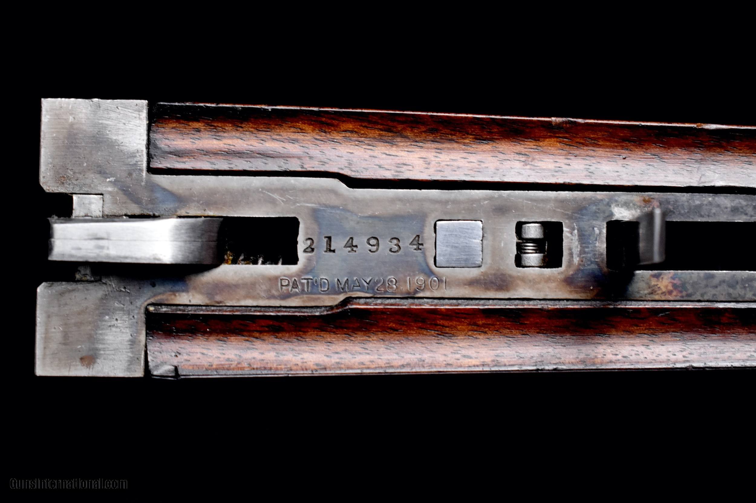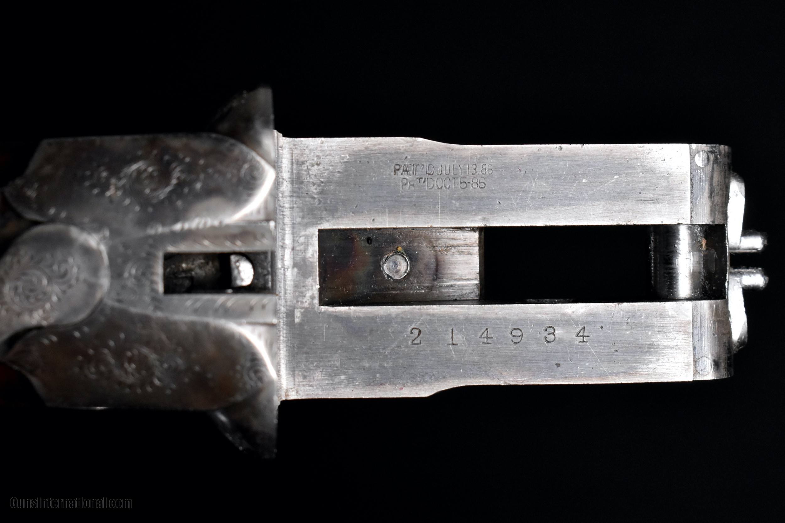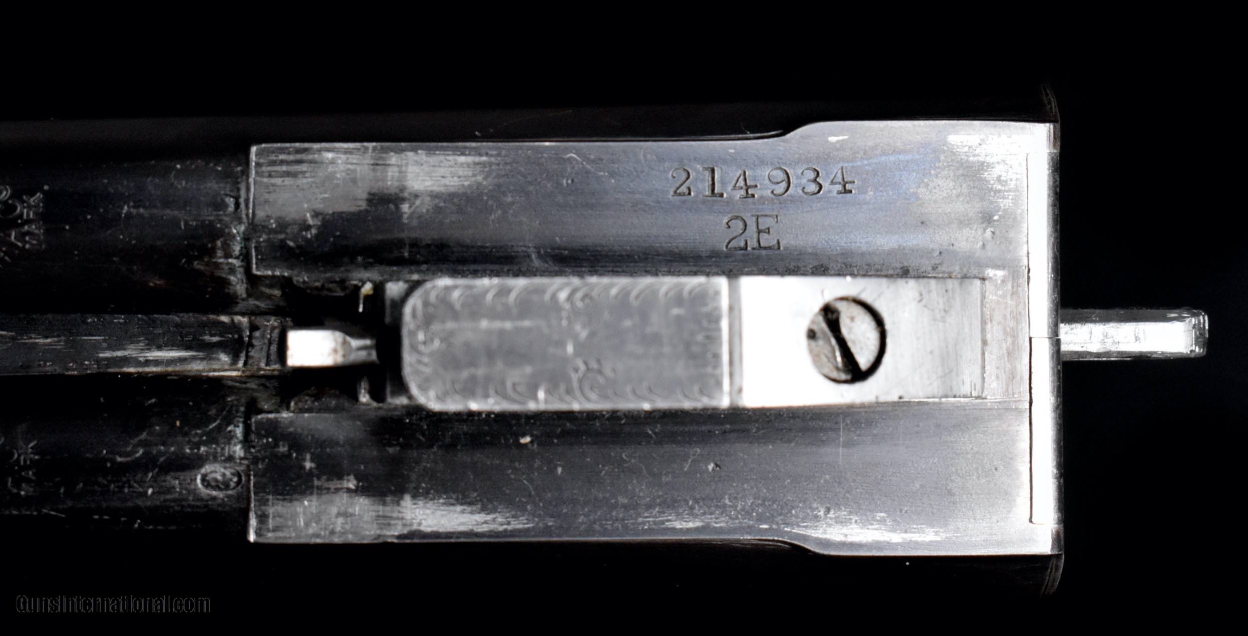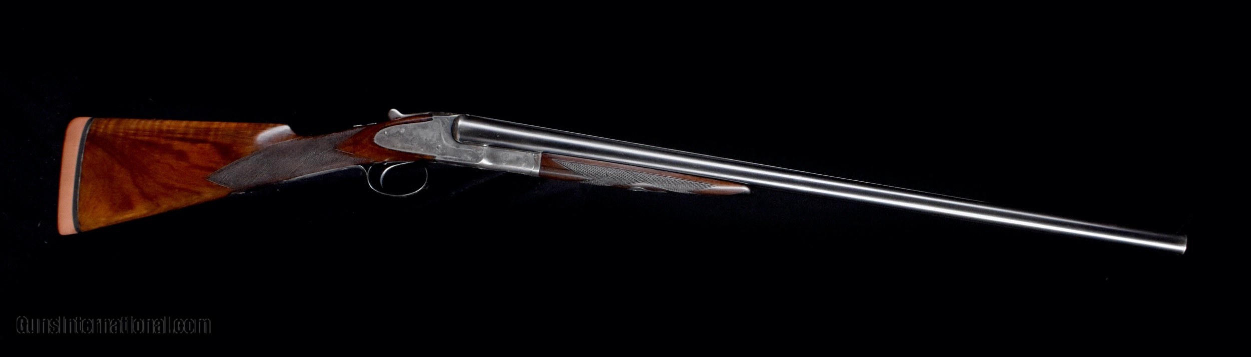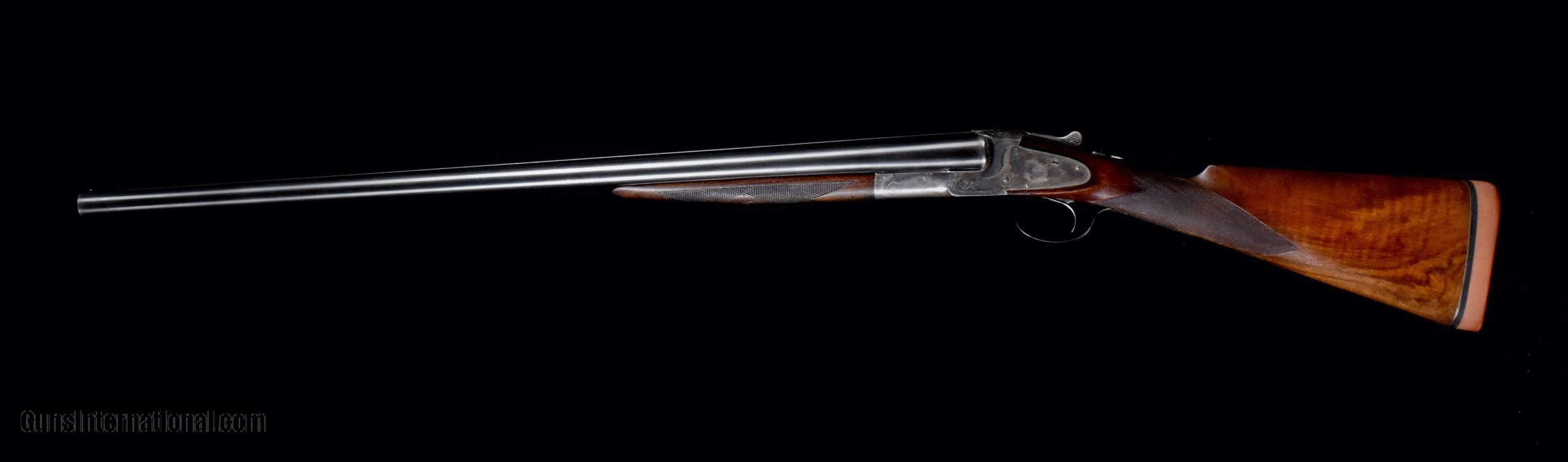 Description: Very rare factory original L.C. Smith 2 barrel set in Grade 2E and this one in 16ga. Barrel sets measure 26" and 30" (both original length). This gun made with two splinter forends, both with banjo roll type releases. Gun made with Hunter One Single Selective Trigger, Auto ejectors, and straighthand English Grip. Gun is nicely engraved in typical Grade 2 pattern with birds on sides surrounded by light scroll. The stock terminates with an aging Silver's type pad. Overall, the gun remains in very nice original condition. Both barrel sets retain about 95% original blue. Stocks are sound and retain about 95% original finish with some minor handling marks. The action retains about 1/2 of its original toning case color. Mechanics are crisp and the bores are all bright and shiny. This is a very rare and desireable gun with the straight stock, Hunter One SST, and factory original two barrel set. It is priced at $7500 plus shipping to your FFL. Please dont hesitate to contact me at (704) 280-2382 or via PM on this site with any questions or reasonable offers. SOLD Curio/Relic: Yes Shotgun Gauge: 16 Gauge Manufacturer: L.C. Smith Model: 2E Serial Number: 214934 Barrel Length: 26" and 30 Chambers: 2-5/8 Ejectors: Yes Condition: Excellent Metal Condition: Excellent Wood Condition: Excellent Bore Condition: Bright and shiny Triggers: Hunter one SST Stock Comb: 1-1/2 Stock Heel: 2-1/2 Fore End: 2 splinter forends Butt Pad: Silver's type LOP: 13-7/8 Weight: 6lbs 10oz with 30" barrels Chokes: 26" Set - .026 (Imp. Modified) both barrels Choke Left: #2 .030 (Full) Choke Right: #2 .030 (Full) Minimum Wall Thickness Left: Over .025 Minimum Wall Thickness Right: Over .025 |