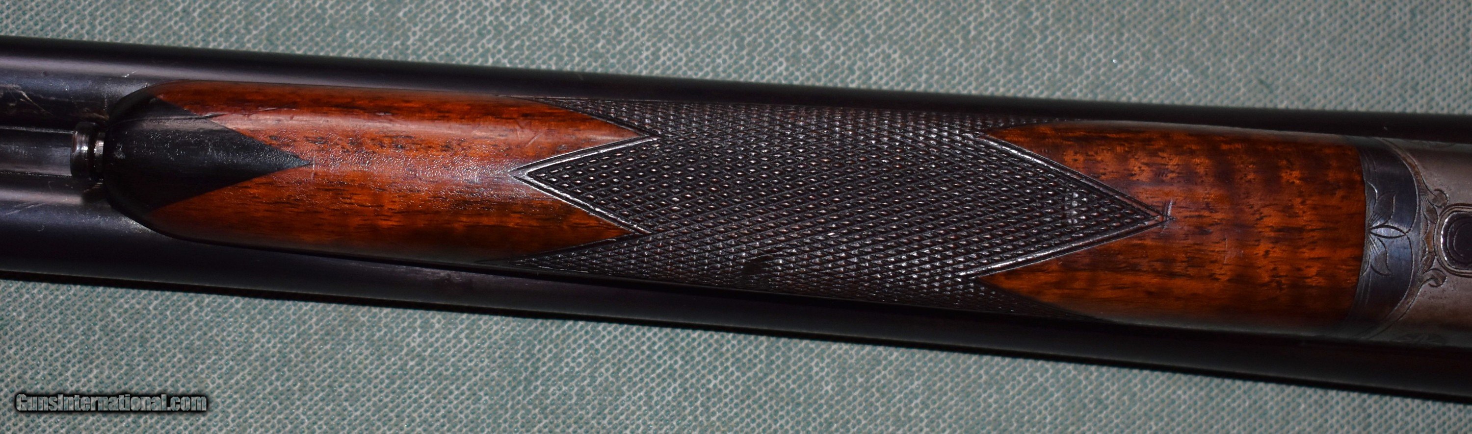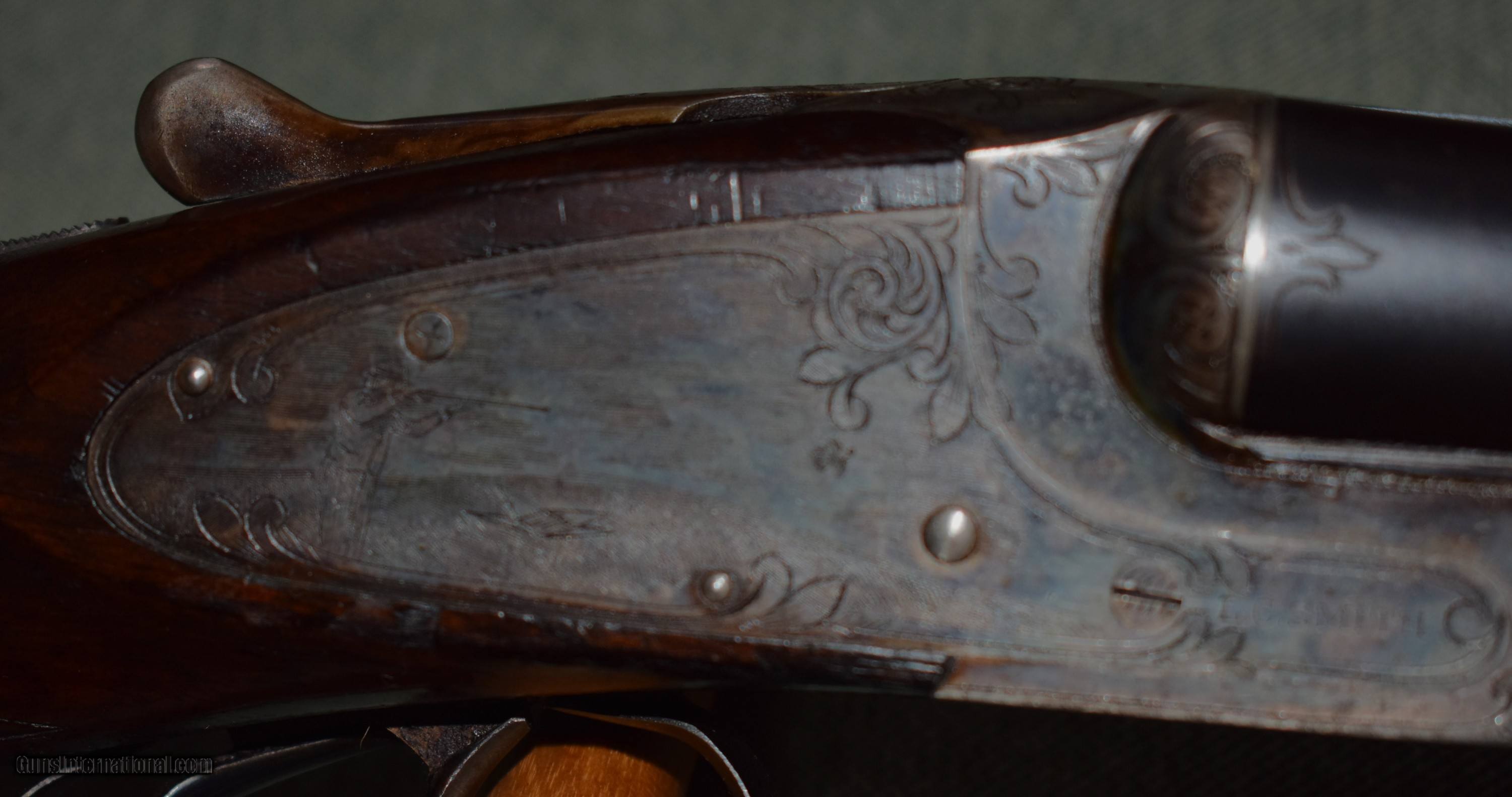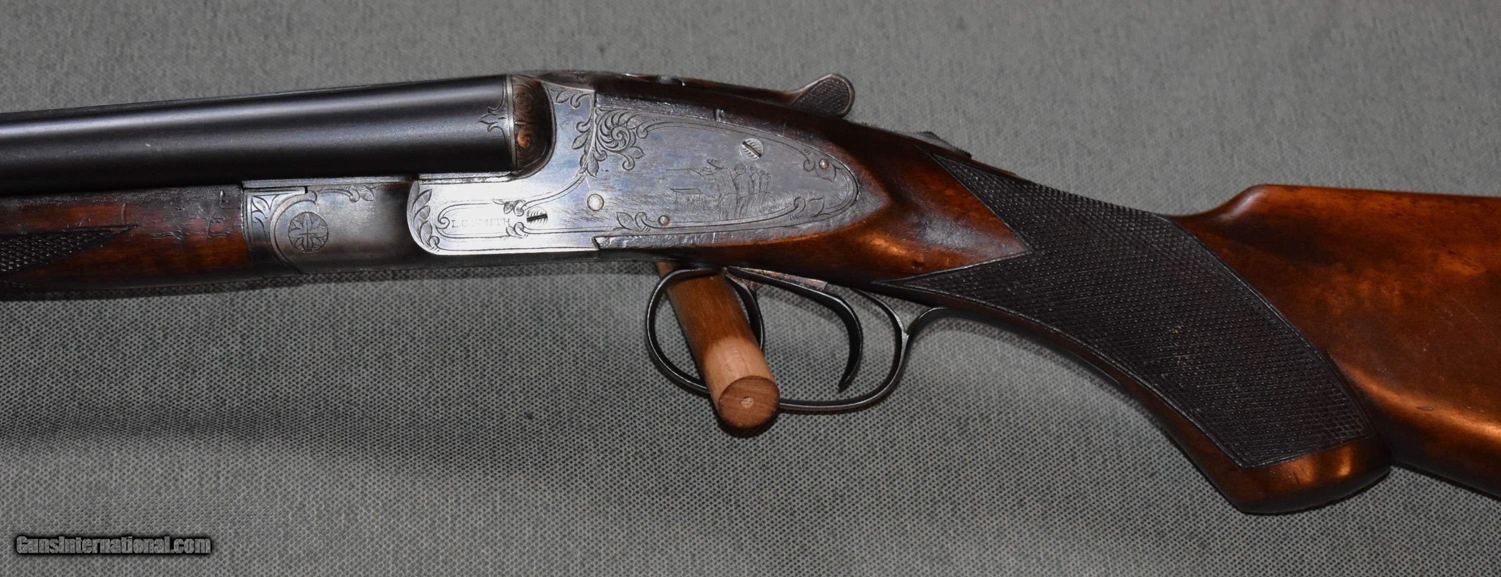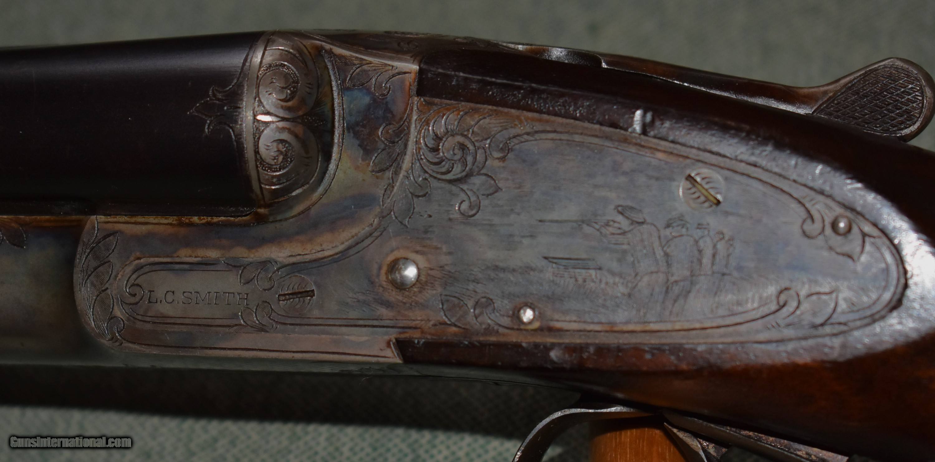 Description: L.C.Smith 20 gauge trap grade built in 1919. This gun is in excellent original condition retaining 80% of the original case colors,and 95% of the original barrel blue and wood finish. The barrels are 26"Armor steel with mint bores and are choked perfectly for upland shooting, skeet and modified. The gun is built on a featherweight frame and weighs just 5-12. The barrels are on face and lock up tightly with the top lever to the right. The engraving of trap shooters on the firing line is sharp and crisp.The screws are all clean and unmarred. This is a very unusual Smith in fine condition and a scarce configuration. A great gun for quail,grouse,or woodcock. C&R eligible. SOLD Curio/Relic: Yes Shotgun Gauge: 20 Gauge Manufacturer: L.C.Smith Hunter Arms Model: Trap Grade Serial Number: FW7152 Barrel Length: 26 Chambers: 23/4 Ejectors: extractors Condition: excellent Metal Condition: excellent Wood Condition: excellent Bore Condition: mint Barrel Type: Armor Steel Action: Double Barrel Triggers: Double Butt Pad: Factory Buttplate Weight: 5=12 Manufacture Date: 1919 Choke Left: Modified (.023") Choke Right: Skeet (.003") Engraving: Standard Trap Grade |