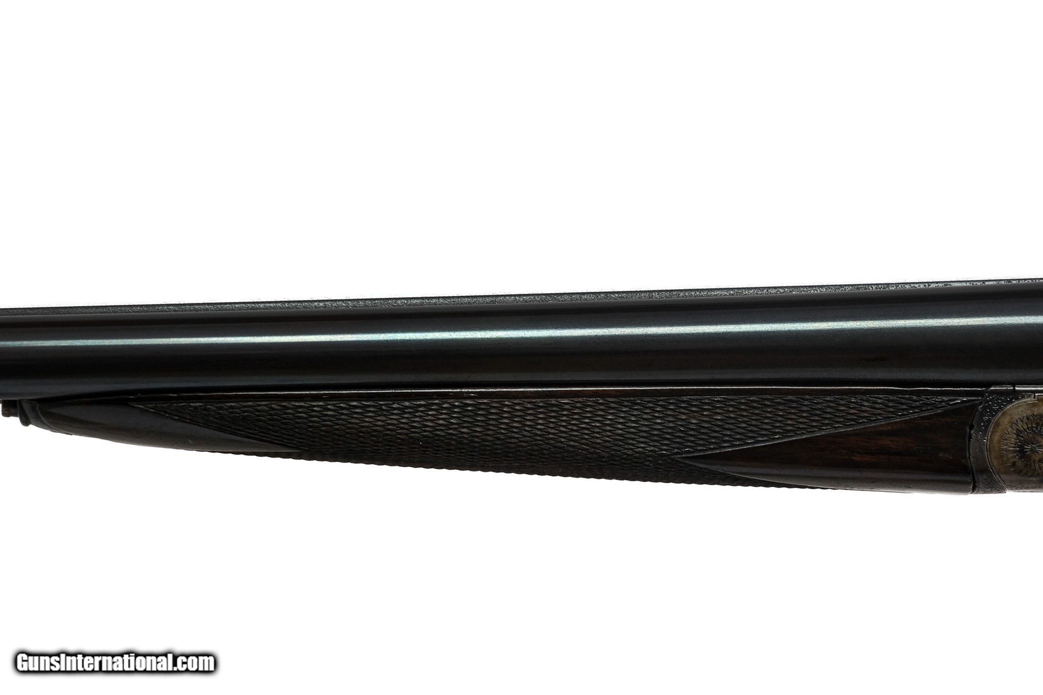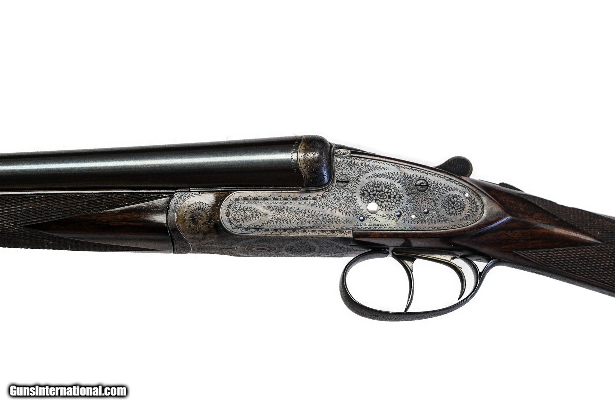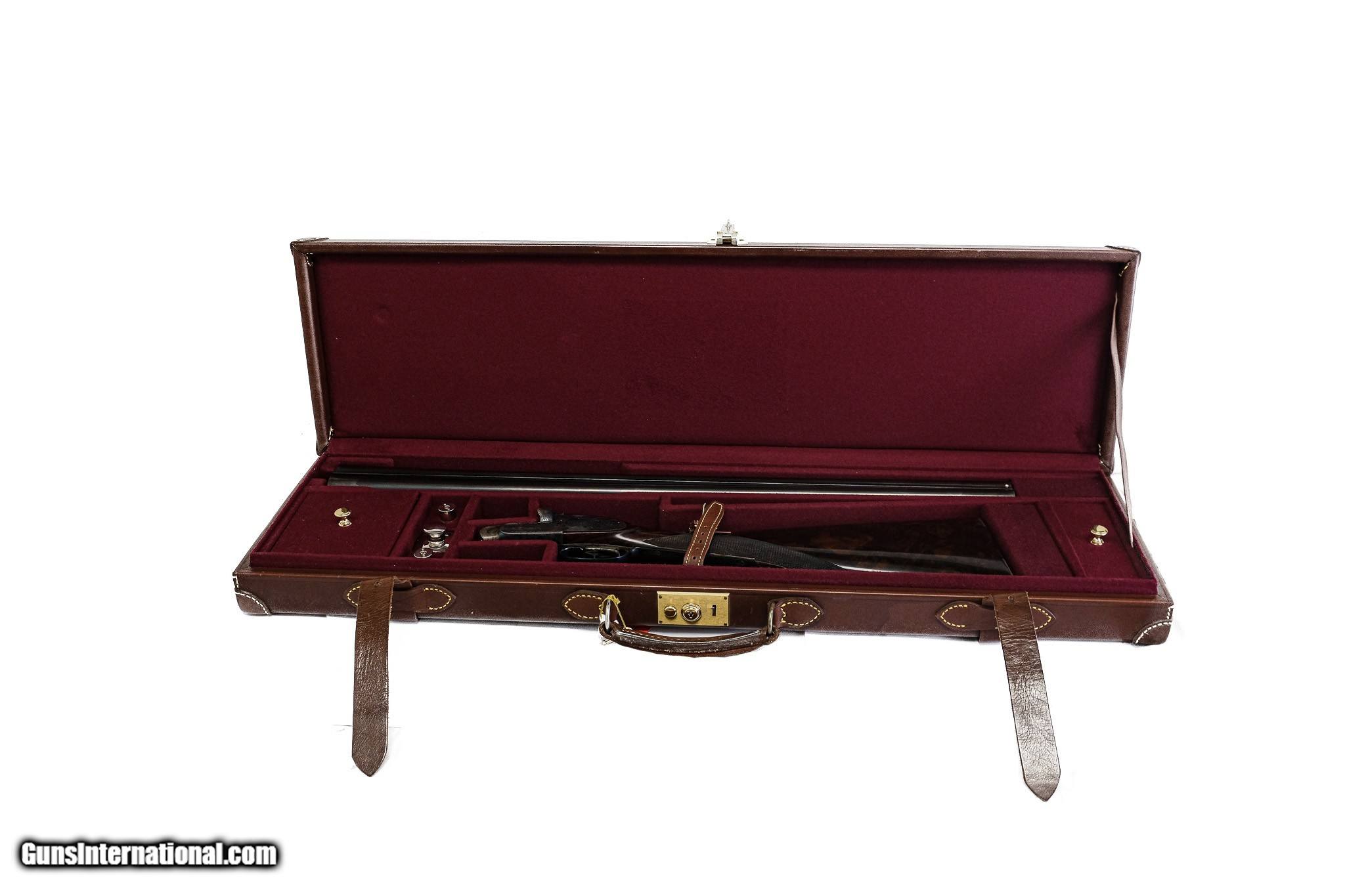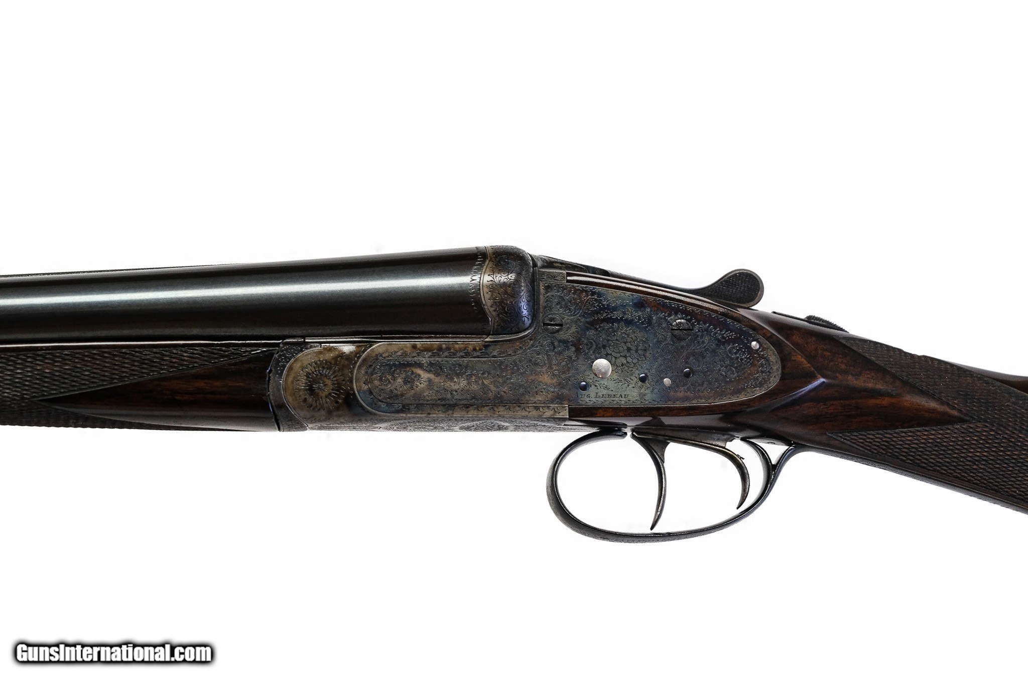 Description: August Lebeau - SxS, 20ga. 28" Chopper Lump Barrels Choked IC/IC. Best quality chopper lump barrels, splinter forend, double trigger, automatic ejector, hidden third fastener, side clips, checkered butt, the very highest quality English rose and Scroll engraved, the highest quality marble cake Turkish walnut, with heel and toe plates, this magnificent highest quality gun made by the company retains 98% Case color and wood finish, shows no wear! Even the triggers have all the case color on them , perfect screws, all the internal parts of this gun are gold plated. A 20ga Lebeau is very seldom found and the cost of this gun new exceeds $100,000, in a very high-quality English leather case. Inv: 76690 6 lbs. 2 oz. 14 5/8" x 1 ½" x 2 ¼" $29,995.00 SOLD |