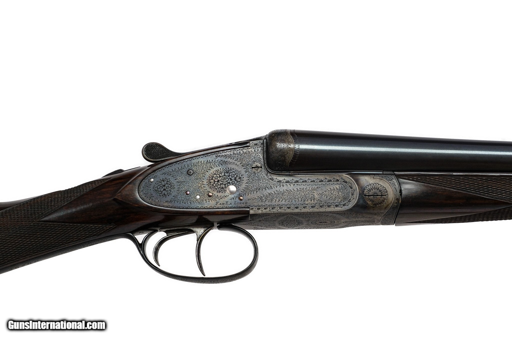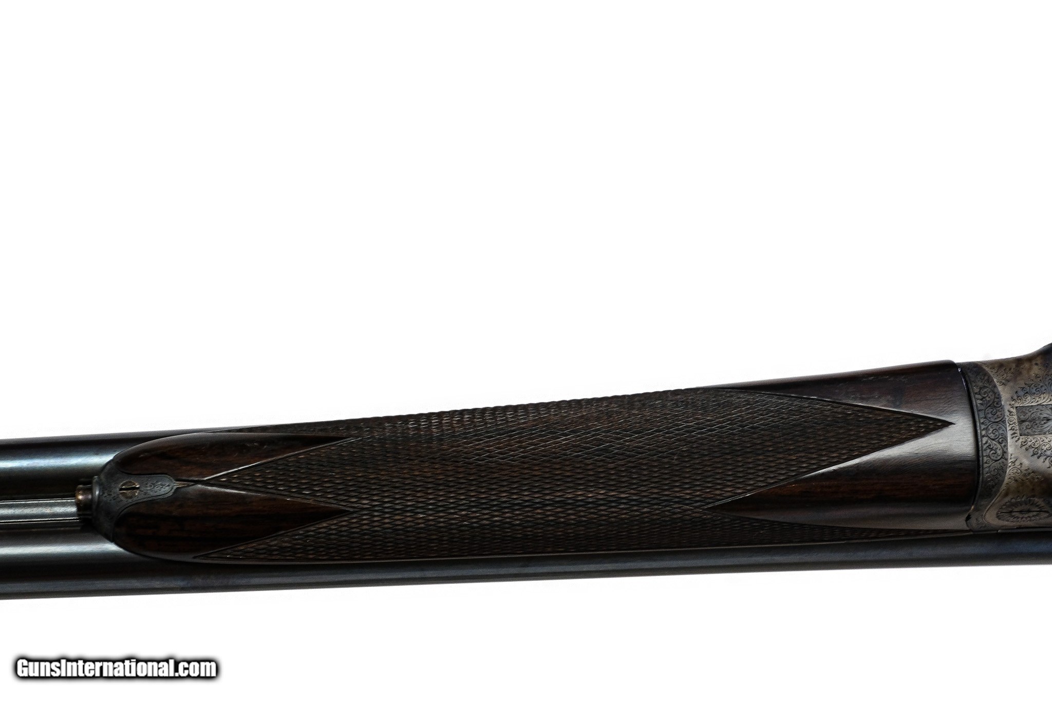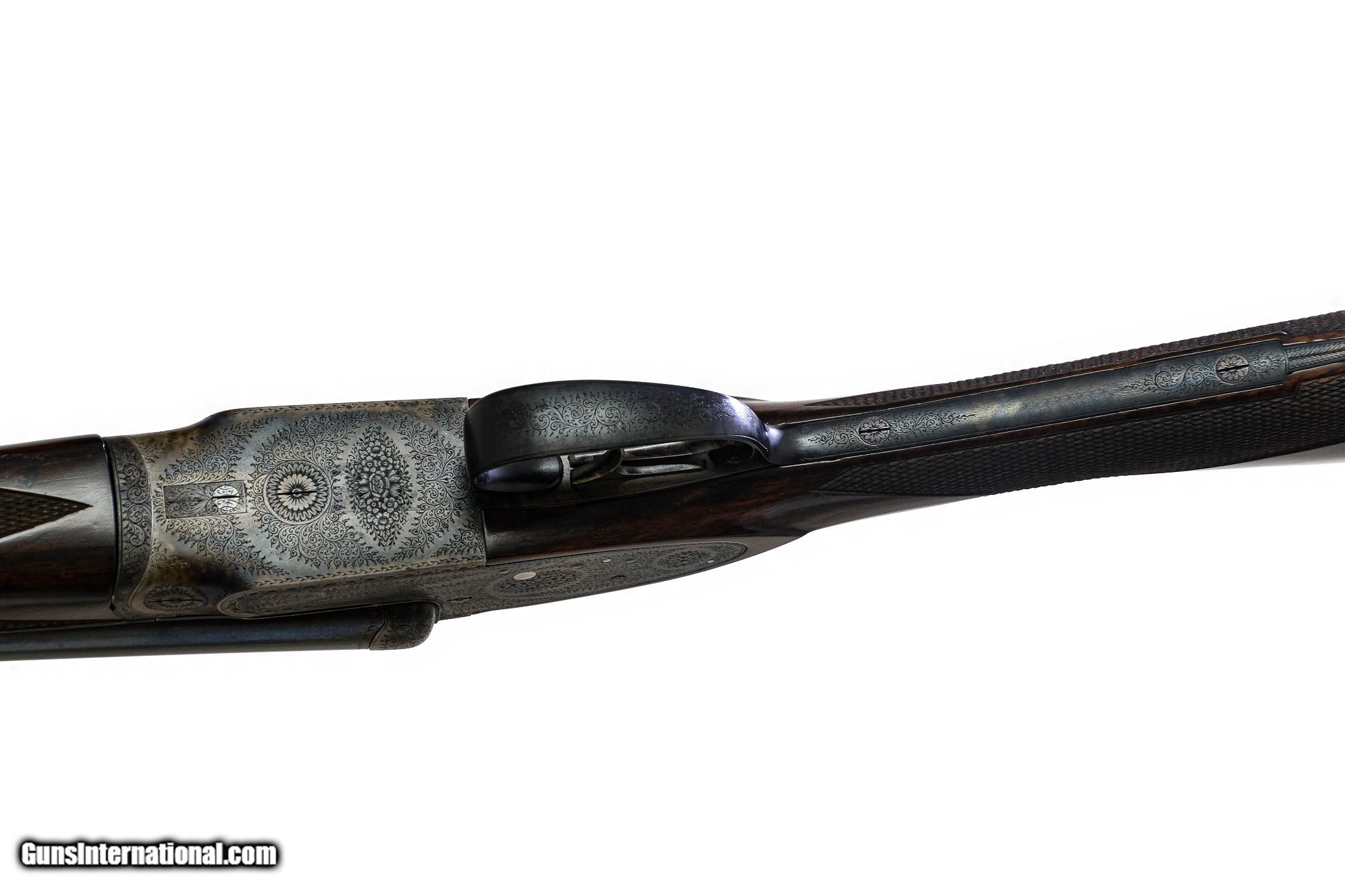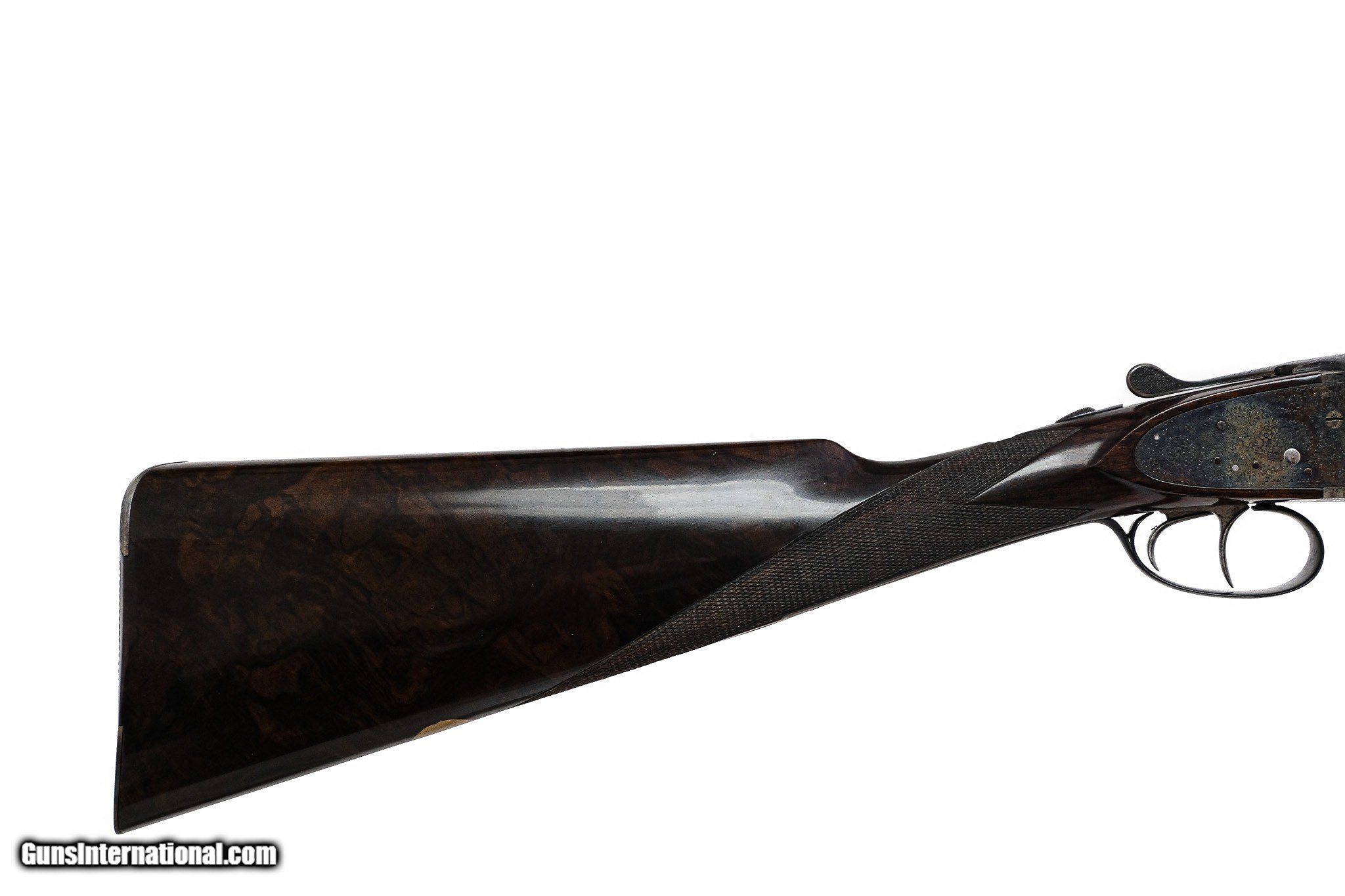 Description: August Lebeau - SxS, 20ga. 28" Chopper Lump Barrels Choked IC/IC. Best quality chopper lump barrels, splinter forend, double trigger, automatic ejector, hidden third fastener, side clips, checkered butt, the very highest quality English rose and Scroll engraved, the highest quality marble cake Turkish walnut, with heel and toe plates, this magnificent highest quality gun made by the company retains 98% Case color and wood finish, shows no wear! Even the triggers have all the case color on them , perfect screws, all the internal parts of this gun are gold plated. A 20ga Lebeau is very seldom found and the cost of this gun new exceeds $100,000, in a very high-quality English leather case. Inv: 76690 6 lbs. 2 oz. 14 5/8" x 1 ½" x 2 ¼" $29,995.00 SOLD |