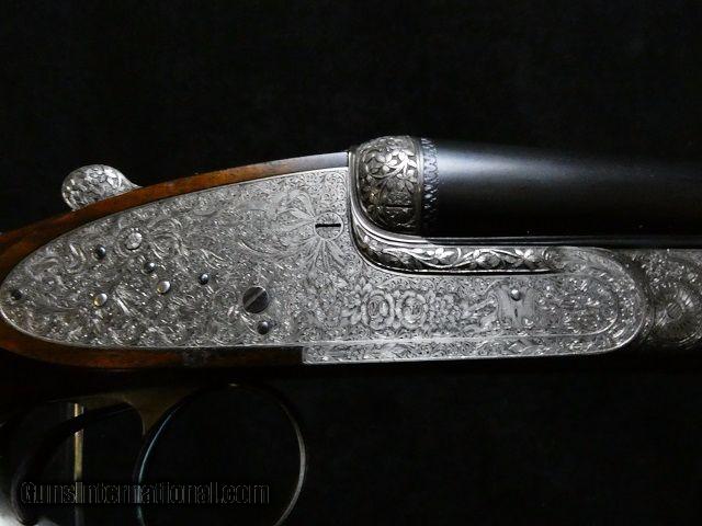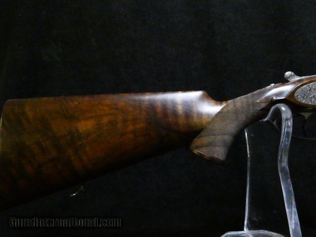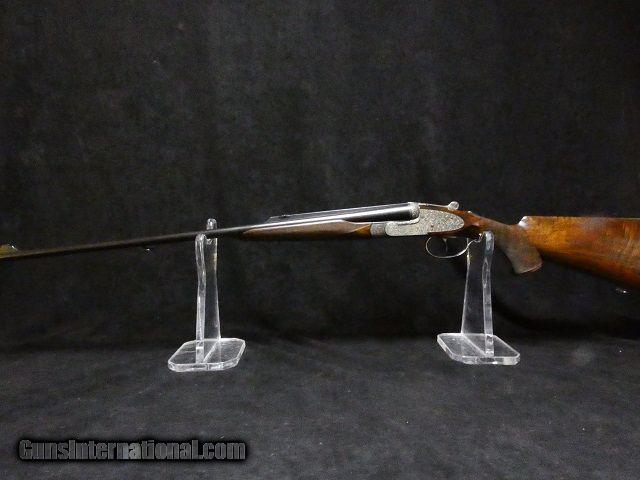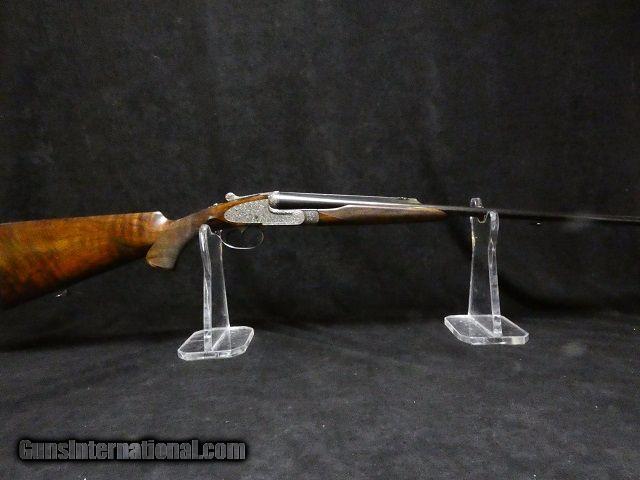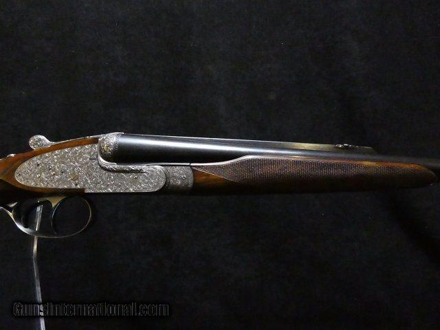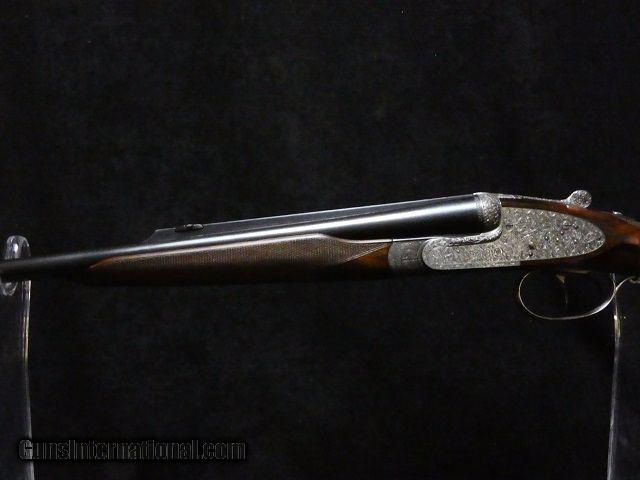 Description: This is a really cool little rifle in mint condition with all the extras. 7 pin sidelock with beautiful rose & bouquet engraving with ribbons. It has a quater rib, a bolstered frame,, extended bottom tang, teardrops, delicate beavertail forend, 14 1/2 LOP articulating trigger, checkered butt and ejectors. Coin finish with a 24" bbl. SxS action. 9.3x72R cal. SOLD Manufacturer: Lebeau Courally Model: Dauphin Caliber Info: 9.3x72R Condition: As new LOP: 14 1/2 Finish: Coin |