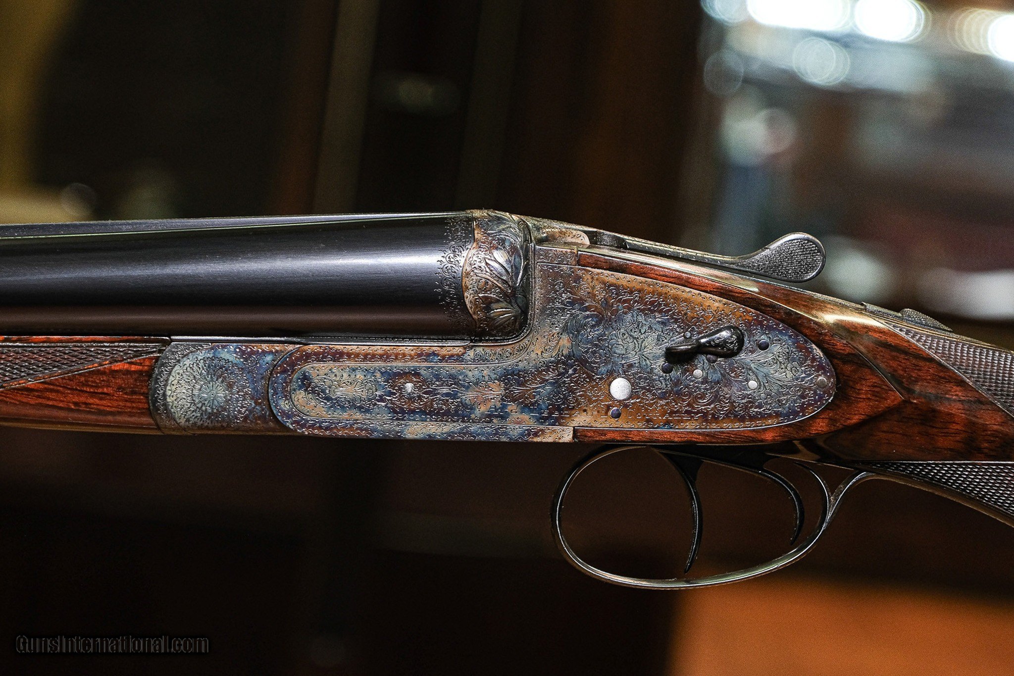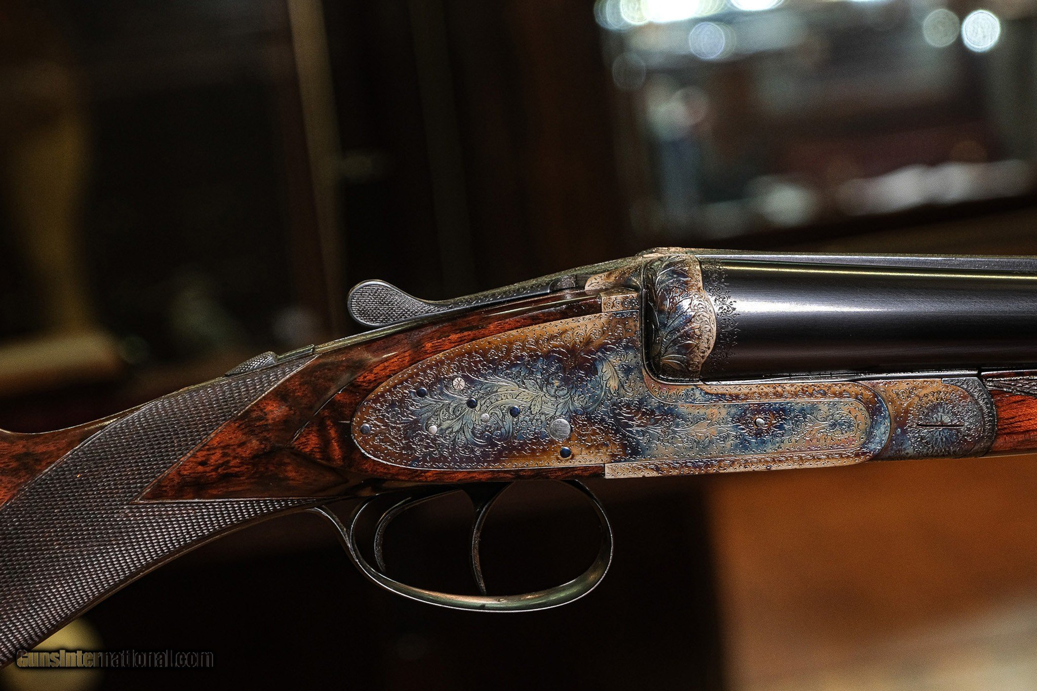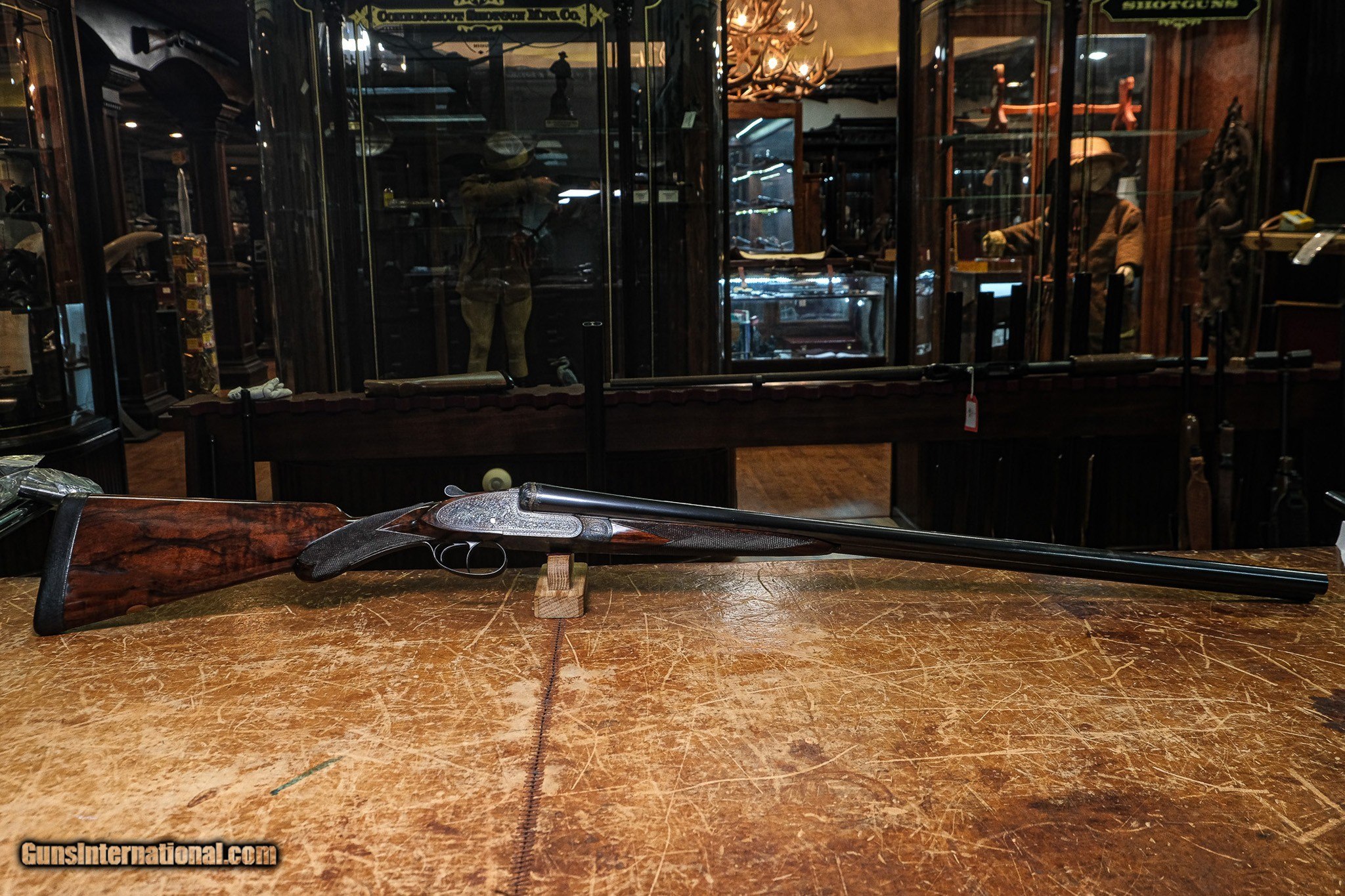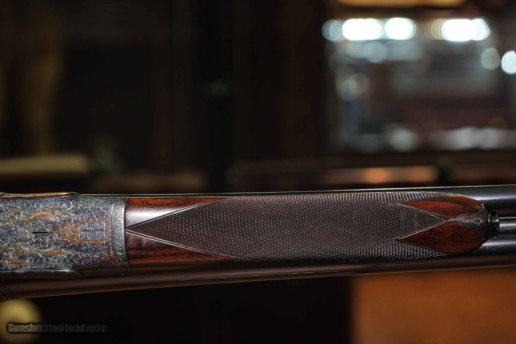 Description: Lebeau-Courally - Imperial Deluxe Pigeon, SxS, 12ga. 28" Barrels Choked IM/F. With sculptured trigger guard, French walnut, splinter forend , this is a heavy proof pigeon guns, side clips, dolls head, third fastener, Busch firing pin, hand detachable side lock.. this is the highest grade they make! Imperial Deluxe Pigeon, the receiver is 100% engraved with magnificent scroll , floral , and deep chiseled breaches , a marvelous piece of true French walnut, with a leather covered pad, matte rib, beautiful barrel engraving. It remains new and unfired as a pre war gun, with 100% case color, barrel blue, and wood finish.. with a new/newer Purdey full leather covered pad that’s executed to the highest level.. perfect screws! One of the finest guns ever made by the world’s finest makers. Cased in Huey French fitted oak and leather case with the Lebeau label which calls this gun a grand deluxe ! This type of gun very seldom comes to market, there’s only a few made.. If you want one of the best guns that have ever been handmade. Inv: 74205 7 lbs. 8 oz. 14 5/8" x 1" x 2" $21,995.00 SOLD |