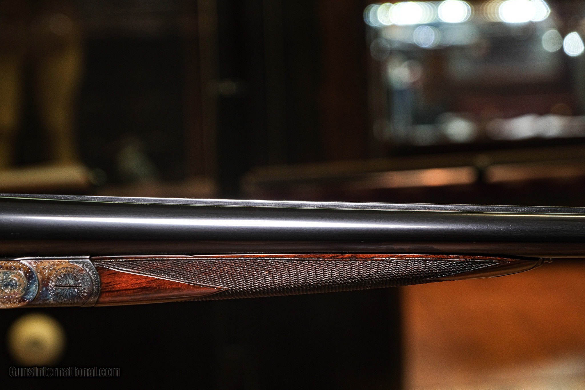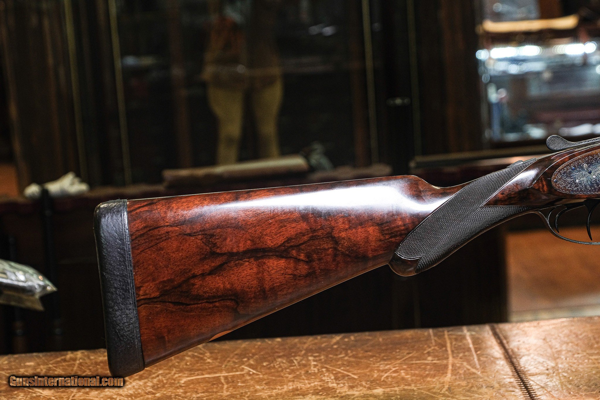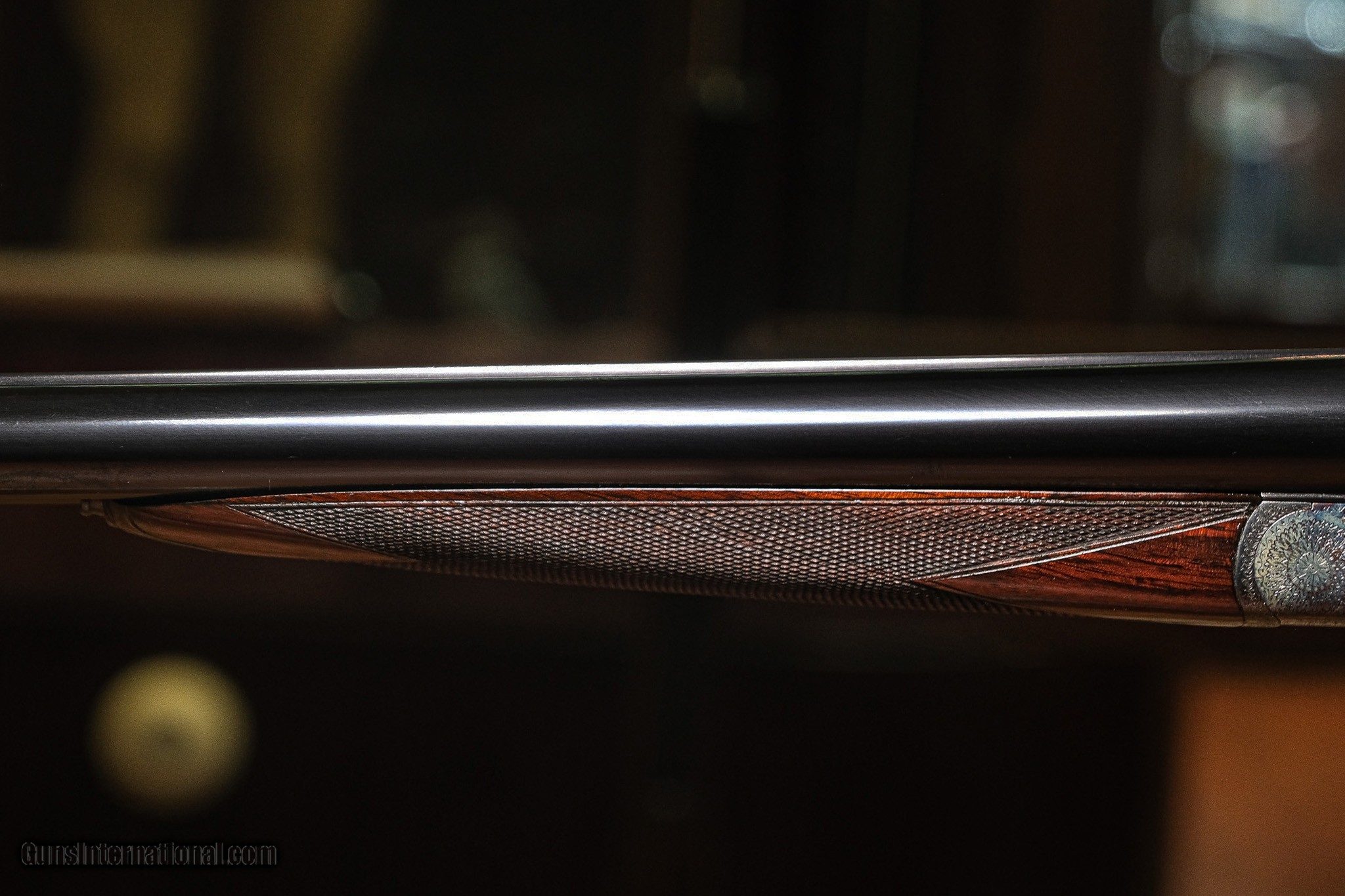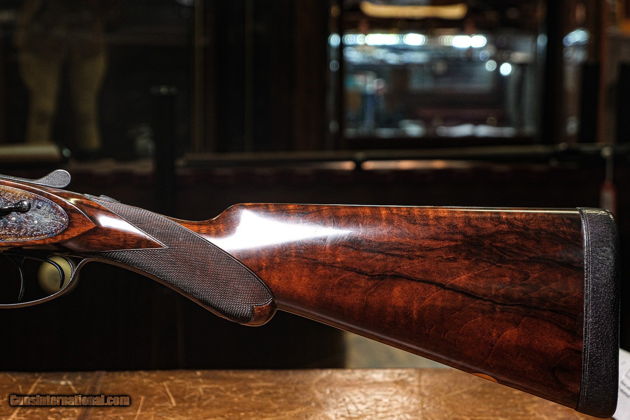 Description: Lebeau-Courally - Imperial Deluxe Pigeon, SxS, 12ga. 28" Barrels Choked IM/F. With sculptured trigger guard, French walnut, splinter forend , this is a heavy proof pigeon guns, side clips, dolls head, third fastener, Busch firing pin, hand detachable side lock.. this is the highest grade they make! Imperial Deluxe Pigeon, the receiver is 100% engraved with magnificent scroll , floral , and deep chiseled breaches , a marvelous piece of true French walnut, with a leather covered pad, matte rib, beautiful barrel engraving. It remains new and unfired as a pre war gun, with 100% case color, barrel blue, and wood finish.. with a new/newer Purdey full leather covered pad that’s executed to the highest level.. perfect screws! One of the finest guns ever made by the world’s finest makers. Cased in Huey French fitted oak and leather case with the Lebeau label which calls this gun a grand deluxe ! This type of gun very seldom comes to market, there’s only a few made.. If you want one of the best guns that have ever been handmade. Inv: 74205 7 lbs. 8 oz. 14 5/8" x 1" x 2" $21,995.00 SOLD |
