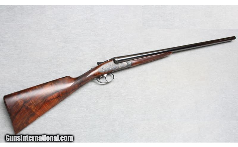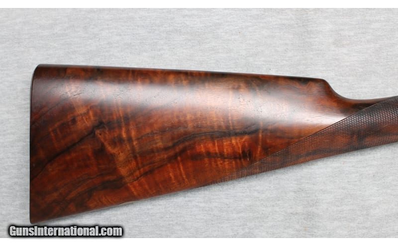 Description: Lebeau Courelly SxS in 12 Gauge. Lebeau-Courally of Liege, Belgium is a maker of finest quality bespoke guns. This is a rounded body sidelock action with case colored finish. It has 2 3/4 inch chambers. The serial number is 44463. The barrels are 27 3/4 inches with hand matted concave solid rib. Markings are "Aug. Lebeau-Courally/Arms de Grand Luxe a Liege.". Bottom of the barrels are marked "ACIER COMPRIME/DE WAHLREYNE". The action has generous coverage of scroll engraving that extends to forearm iron with borders at breech end of the barrels. The engraver's signature "R.Smeets Gra." is found on the trigger plate. The hammers and ejector hammers are gold washed. Features include double under lug and third bite locking, bushed firing pins, selective ejectors & double triggers, and the front trigger is hinged. The Splinter forearm with Anson release and straight hand stock are exhibition quality European walnut that has a burl figure with contrasting dark and orange tones. The stock and forearm have generous coverage of point pattern hand checkering. The toeline of stock has a brass nameplate. The weight is 6 lb. 13 oz. The action is tight and on face with the top lever sitting nicely right of center. 12 Gauge SOLD Chambers: 2 3/4 Inches Metal Condition: Excellent Wood Condition: Excellent Bore Condition: Bright Triggers: Double triggers with hinged front trigger Stock Dimensions: LOP: 14 5/16" to checkered butt. DAC: 1 1/2". DAH: 2 1/4". Neutral cast. Fore End: "Splinter forearm with Anson release, Fine walnut with point pattern hand checkering Butt Pad: Checkered walnut Chokes: "Full/Modified (Choke constriction: RT .015, LT .032) Item Location: La Vista, NE |