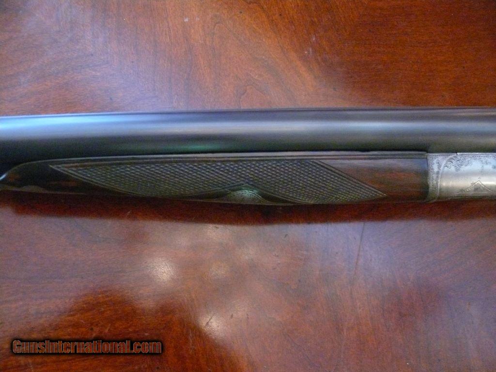 Description: Photos are accurate and yes this is a very pretty small gauge Lefever EE grade with modern dimensions. The original stock had been cut down to somewhere around 12" and when Keith Kearcher, of Oregon, did the restoration of this gun, he spliced a new Buttstock onto the gun. You cannot see the splice mark as its hidden in the checkering of the straight grip.The bores on the 28" barrels are shiny and bright and the ejectors work beautifully. Its choked IC/M. It has great dimensions with a 14 75" LOP to the orignal thick Lefever monogrammed butt plate. DAC is 1.5" and DAH is 2.25". This is an early gun to as the serial number is 49037. The engraving is perfect and the case colors have faded. This is a very nice light weight desireable gun from one of America's greatest gunmakers and it has MODERN dimentions too. Will ship in a hard plastic case and must ship to an FFL. Shipping will be 150$ via Fedex. CCs add 3% .Thanks for looking. additional info... ?Yes its tight on face and it weighs about six pounds according to my Tanita scale. The right tube has a small bit of scaling halfway down the tube. MINOR blemish...not a major problem. Thank you. Strength and Honor! SOLD |