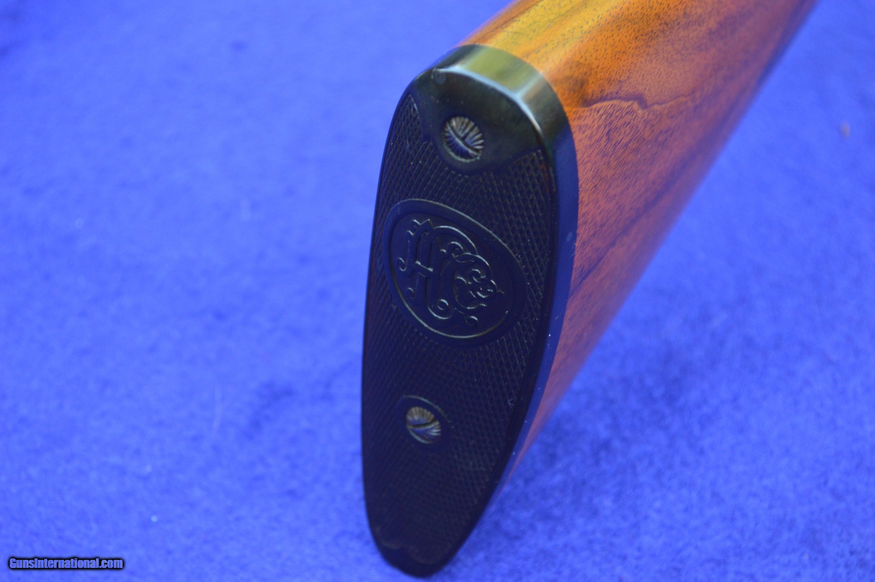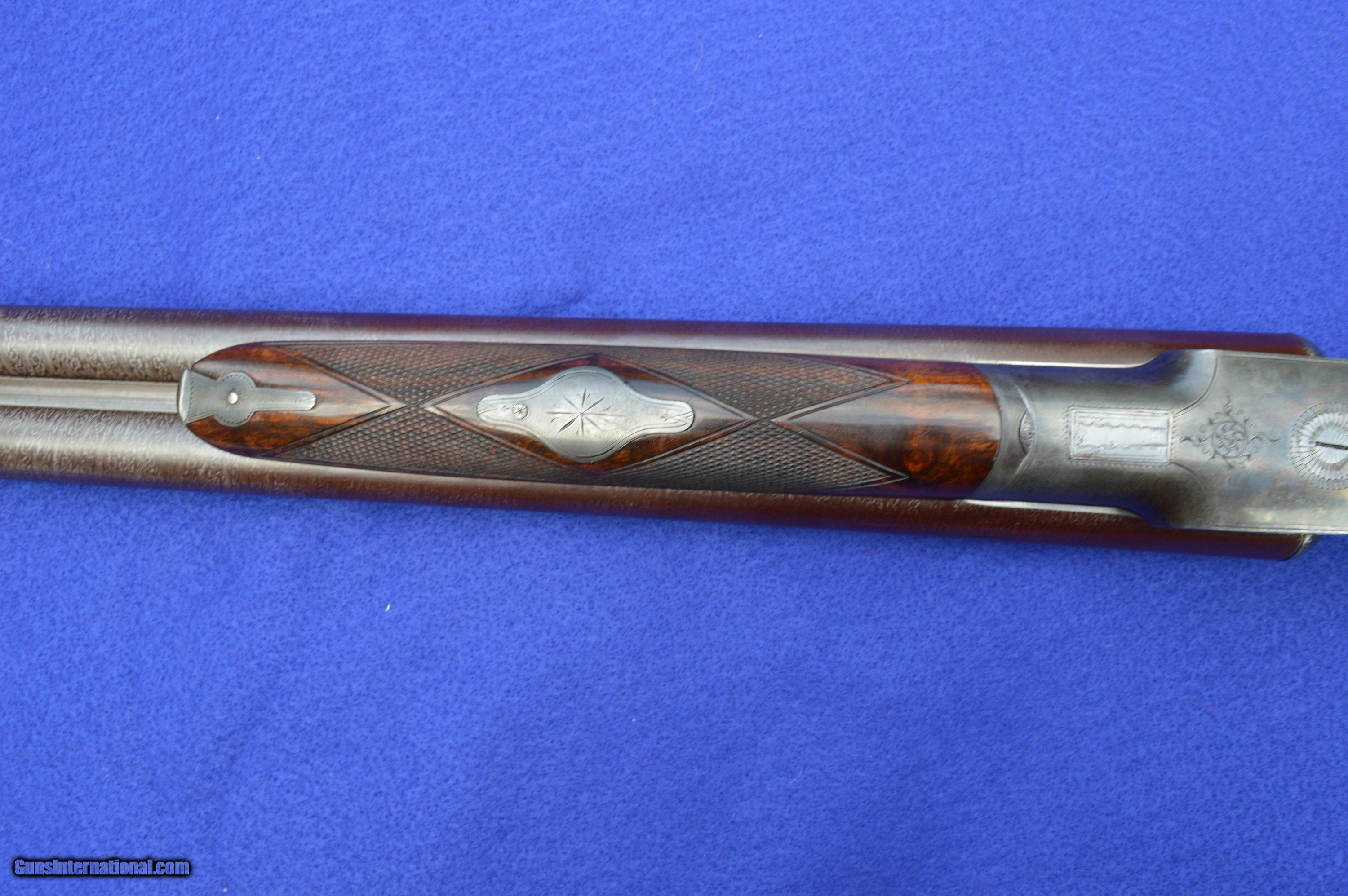 Description: What makes this Lefever Grade-F 12-gauge shotgun special is its high original condition. The 30” fine Damascus-steel barrels are in the chain-link pattern, which is rarely found in the original brown. Approximately 80% of the receiver and side-plates show original case color. The engraving is generally crisp, although it has softened on the left side-plate. The barrels have 2-3/4” chambers and are choked modified (.020) and full (.030). The minimum wall thickness of the right barrel is .046 and the left .050. Both bores, which are bright and free of any pitting, have a diameter of .740. The wood has only light handling marks, and the checking is crisp. Drop at the comb is 1-7/8” and at the heel 3”. The gun weighs 8 pound 3 ounces. Length of pull is 14” to the original buttplate. Triggers both pull at 6 pounds. All serial numbers, 38046, match. The gun locks up tight. Manufactured circa 1911, this Lefever shows little use and exceptional care. The price does not include shipping costs paid by buyer. The inspection period is 7 days from receipt. This shotgun has been fired on the range on a number of occasions using shells manufactured by RST Corporation designed for use in Damascus-barreled shotguns. However, as for any antique or vintage shotgun, it is recommended that the new owner have it inspected by his or her own gunsmith before firing, and then only use shells that produce pressures for which the gun was designed. The gun carries a 30-day warranty, during which Doublegun Preservation, LLC will have any mechanical problems documented by a professional gunsmith repaired or accept the return of the gun and refund the price of the gun and all shipping costs. Please do not hesitate to call with questions Stephen Wesbrook at 703-625-4830. SOLD Curio/Relic: Yes |