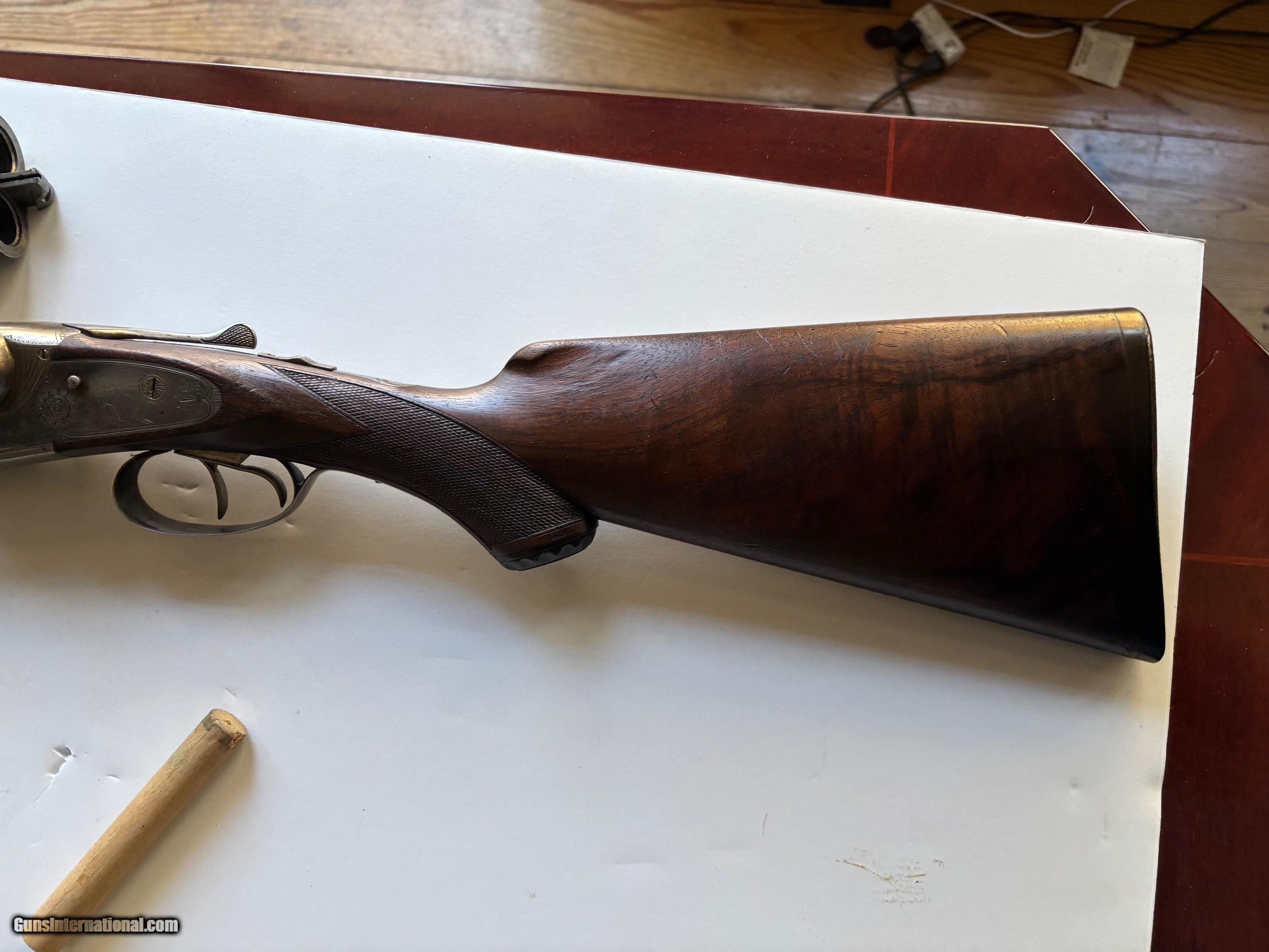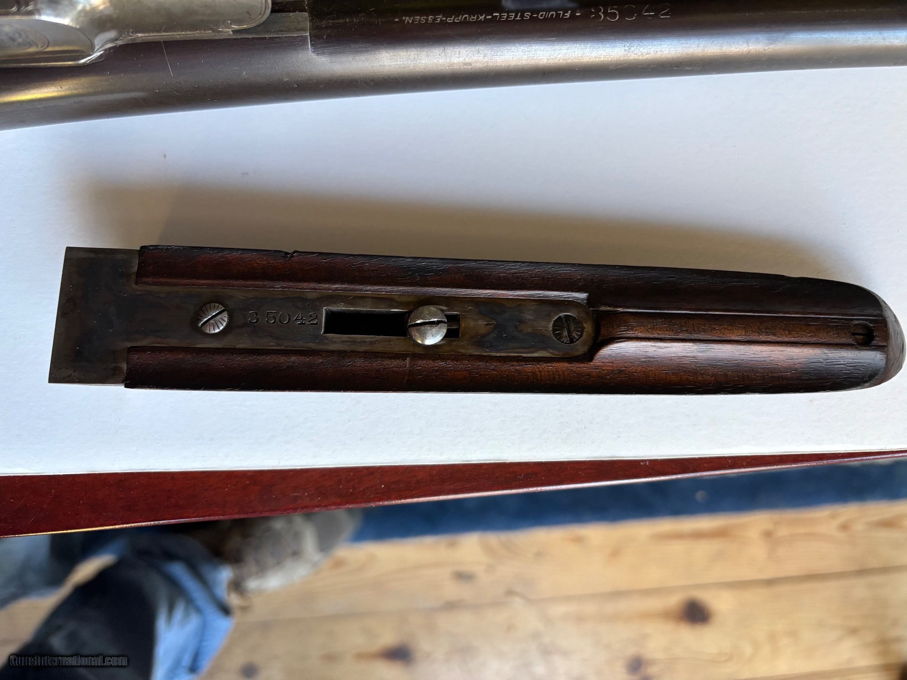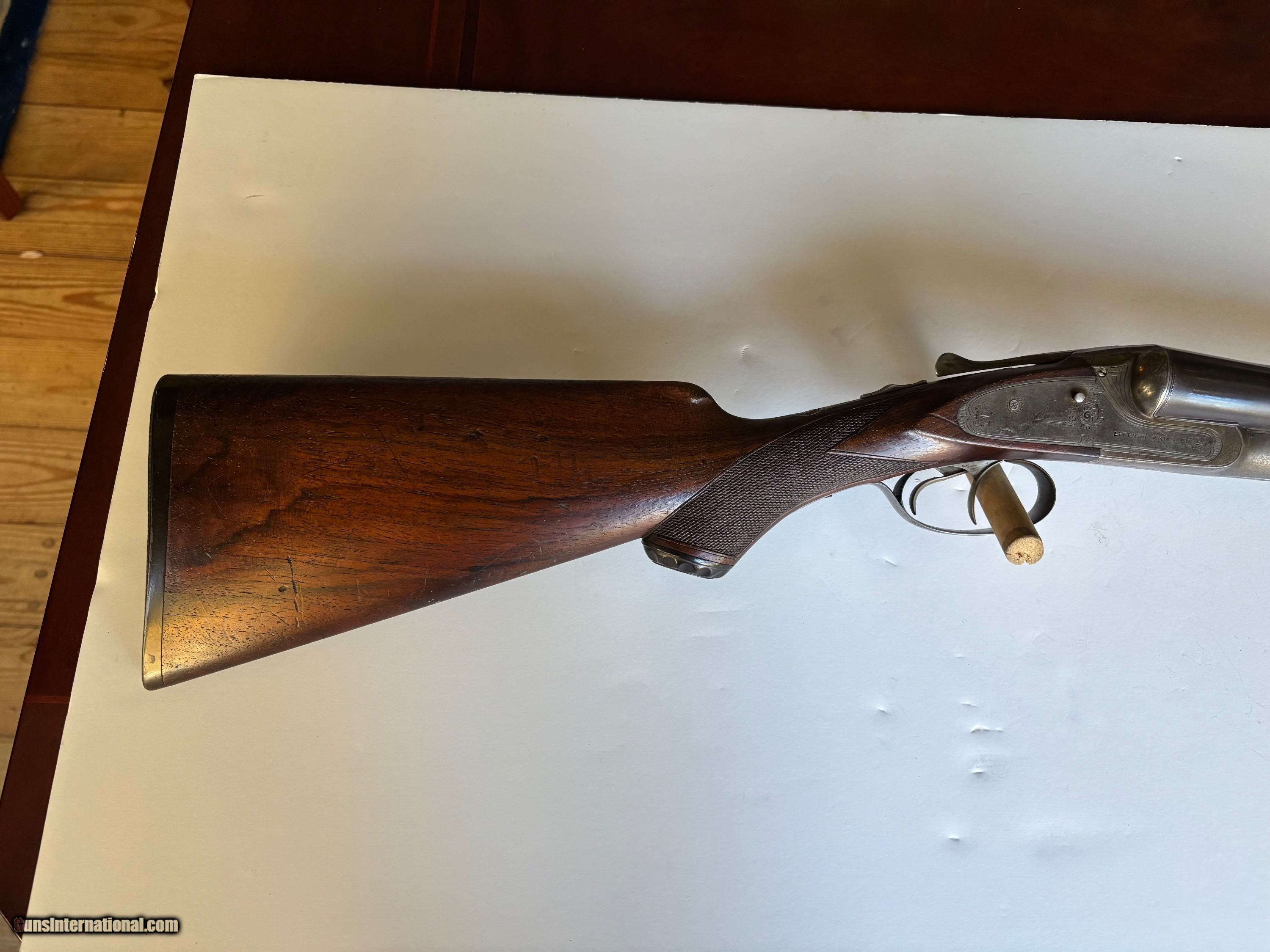 Description: Lefever Arms Co. 12 Ga. Double Barrel with Krupp Fluid Steel Barrels manufactured in 1900. Gun is in excellent condition shoots and functions as it should. Bluing is about 90% with scratces and wear commensurate with a 125 year old shotgun. The stock is oil finished and in good condition with no cracks. It has dents and scratches that show it's age. It is an F grade with Fgrade engraving. Case hardening colos are gone but there is no rust or corrosion. It has double triggers, 30 " barrels and a safety disconnect for trap shooting. It has left and right cocking indicators. All numbers match and the bores are bright with no dents or corrosion. Curio/Relic: Yes Shotgun Gauge: 12 Gauge Manufacturer: Lefever Arms Co. Model: Grade F Serial Number: 35042 Barrel Length: 30 Condition: Excellent Metal Condition: excellent Wood Condition: excellent Bore Condition: excellent Barrels: 2 Barrel Type: Krupp Fluid Steel Action: Break Open Triggers: 2 Stock: Walnut Stock Drop: 2 1/2 Fore End: Walnut Butt Pad: Original hard rubber LAC logo LOP: 14" to Front Trigger Rib: yes Finish: Blued Weight: 7 lbs. 7 oz. Sights: single bead Manufacture Date: 1900 Choke Left: Full Choke Right: Modified Engraving: Yes Item Location: Pennsylvania Price: $2,195.00 Shipping: $80.00 Buy Now Contact Seller |