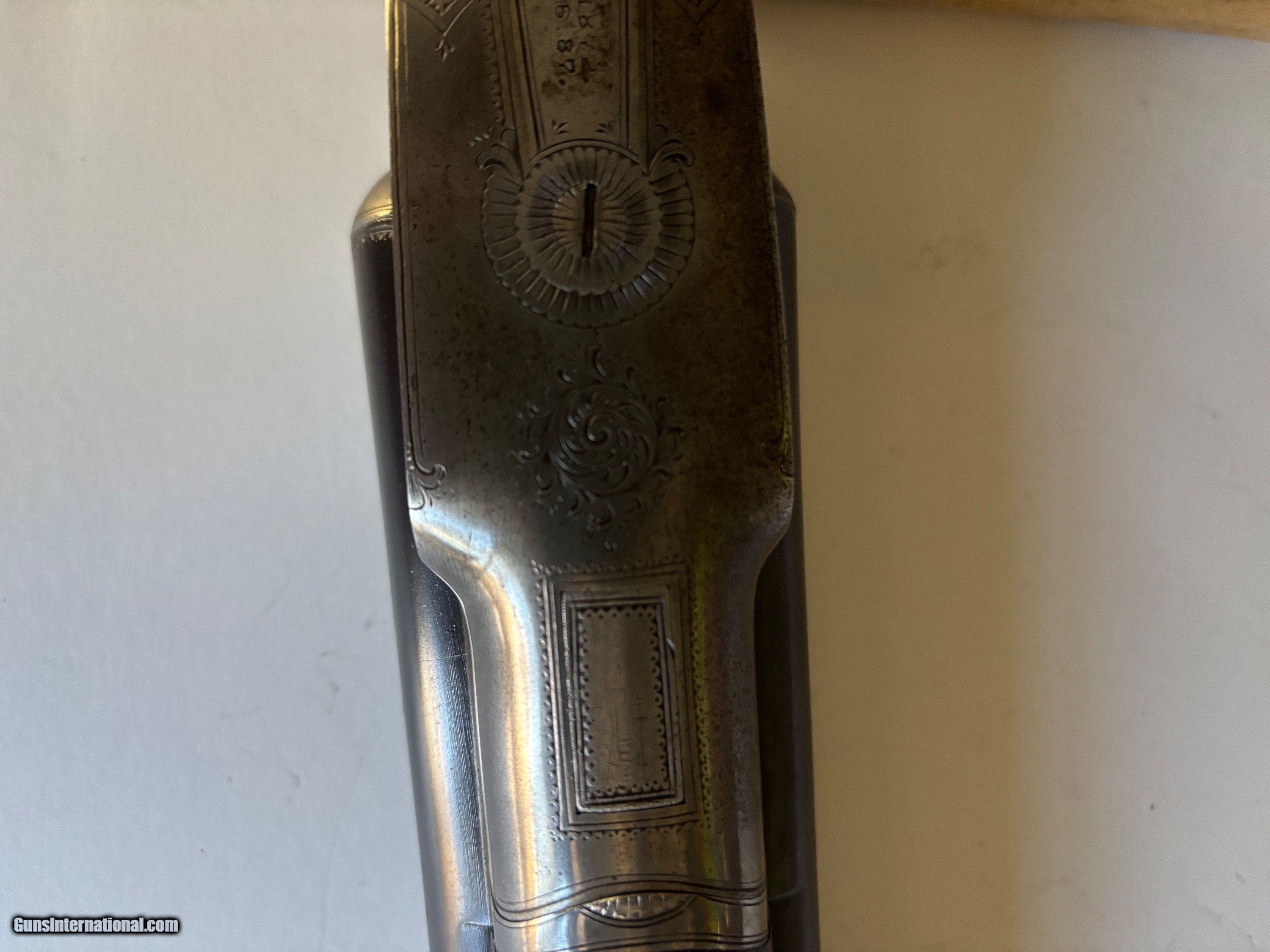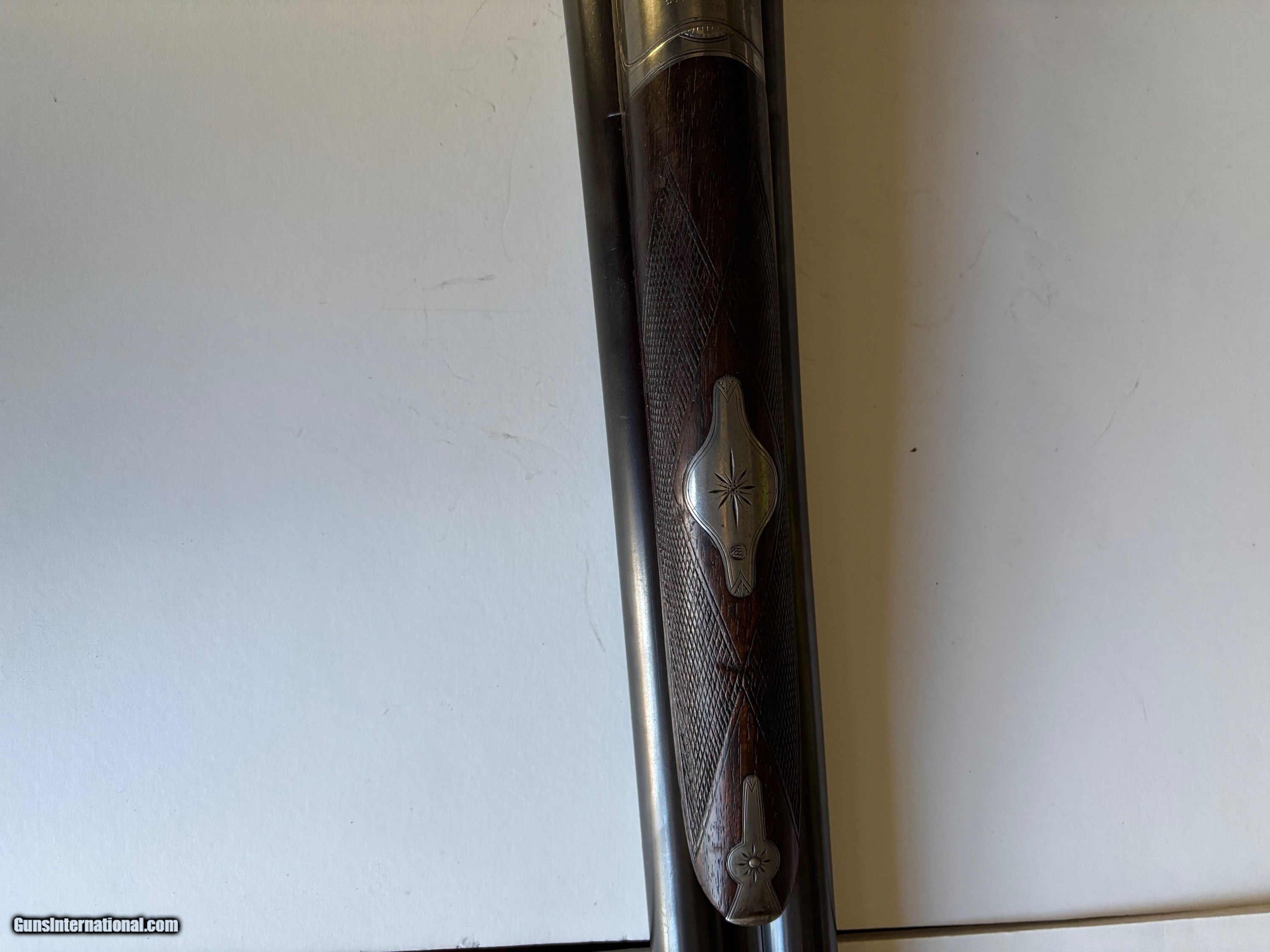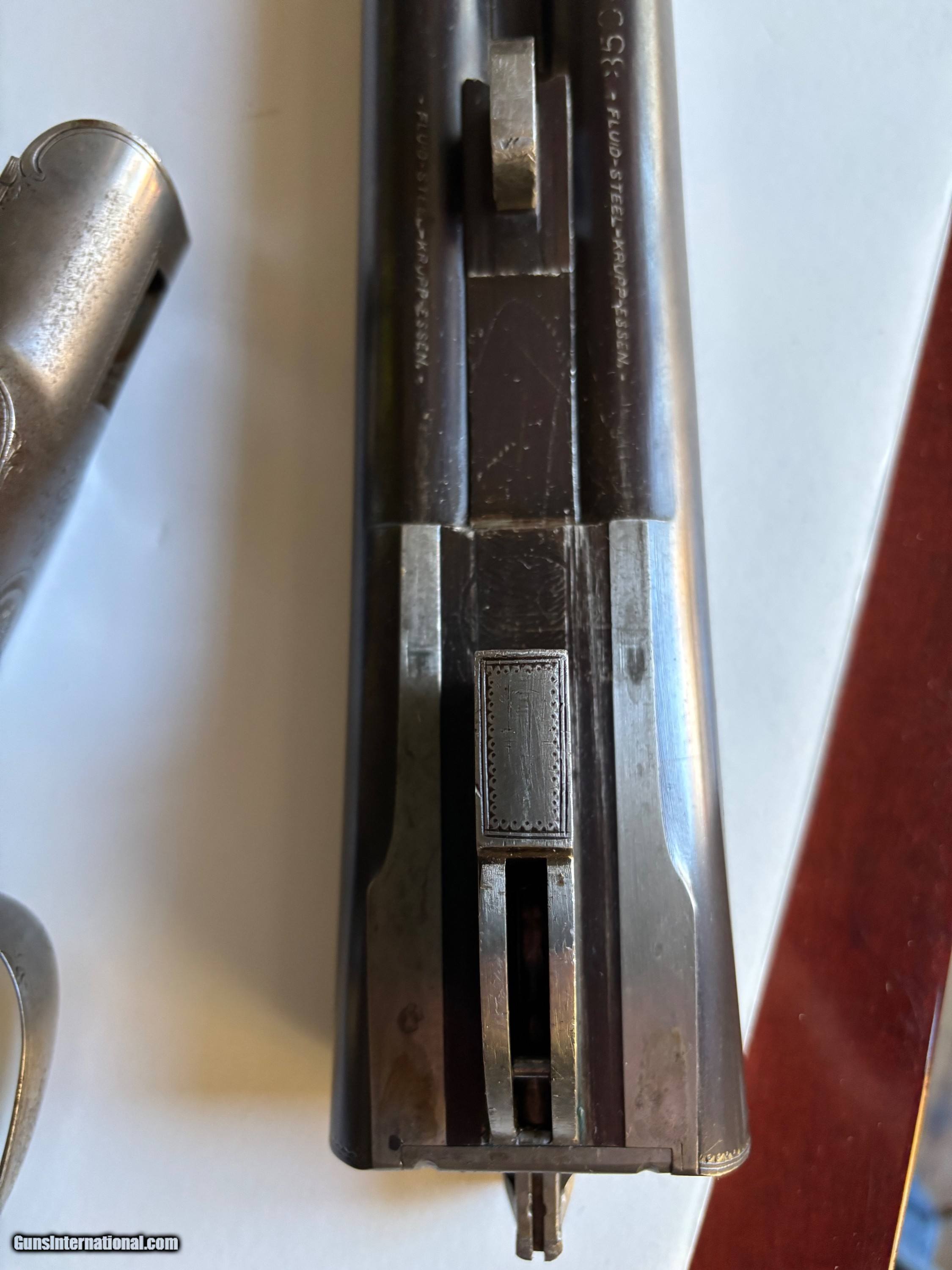 Description: Lefever Arms Co. 12 Ga. Double Barrel with Krupp Fluid Steel Barrels manufactured in 1900. Gun is in excellent condition shoots and functions as it should. Bluing is about 90% with scratces and wear commensurate with a 125 year old shotgun. The stock is oil finished and in good condition with no cracks. It has dents and scratches that show it's age. It is an F grade with Fgrade engraving. Case hardening colos are gone but there is no rust or corrosion. It has double triggers, 30 " barrels and a safety disconnect for trap shooting. It has left and right cocking indicators. All numbers match and the bores are bright with no dents or corrosion. Curio/Relic: Yes Shotgun Gauge: 12 Gauge Manufacturer: Lefever Arms Co. Model: Grade F Serial Number: 35042 Barrel Length: 30 Condition: Excellent Metal Condition: excellent Wood Condition: excellent Bore Condition: excellent Barrels: 2 Barrel Type: Krupp Fluid Steel Action: Break Open Triggers: 2 Stock: Walnut Stock Drop: 2 1/2 Fore End: Walnut Butt Pad: Original hard rubber LAC logo LOP: 14" to Front Trigger Rib: yes Finish: Blued Weight: 7 lbs. 7 oz. Sights: single bead Manufacture Date: 1900 Choke Left: Full Choke Right: Modified Engraving: Yes Item Location: Pennsylvania Price: $2,195.00 Shipping: $80.00 Buy Now Contact Seller |