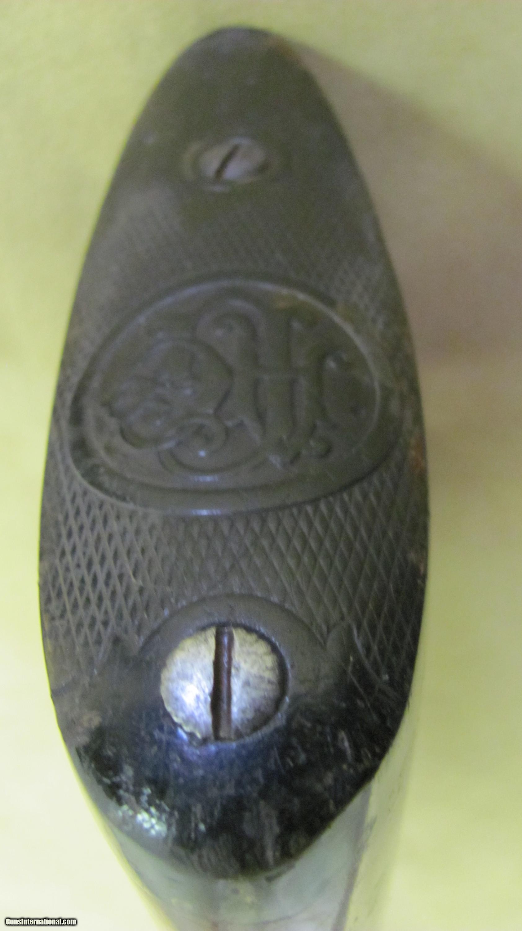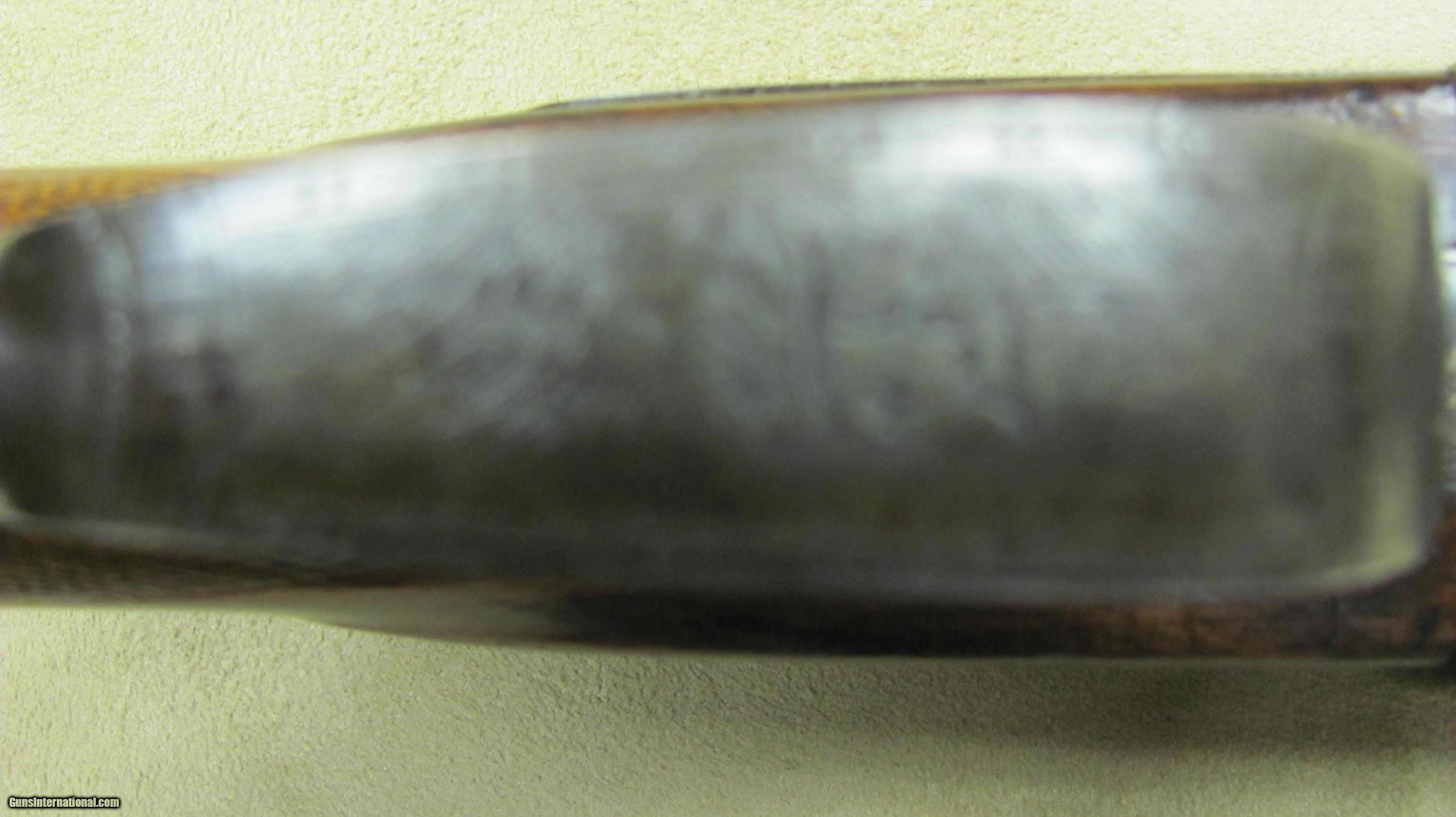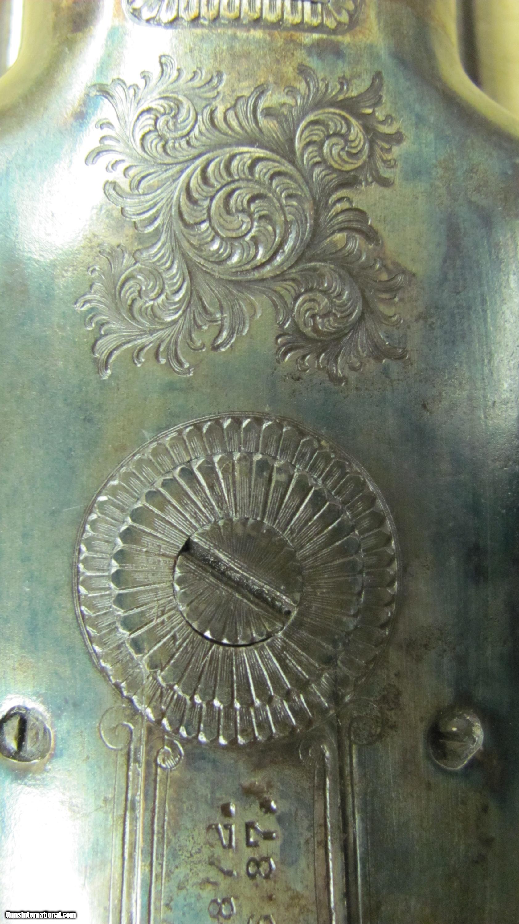 Description: High grade Lefever double barrel shotgun (D Grade) with 26" Damascus barrels chocked Cyl and Imp, Cyl. LOP iis 14", DAC is 1 5/8", DAH is 2 1/2". Weight is 7.0 lbs. This shotgun has highly figured factory wood on the stock and forend. All engraving is very sharp. Good damacus pattern on barrels and barrels have good bores. A very nice classic American shotgun. SOLD Curio/Relic: Yes Manufacturer: Lefever Model: D Grade |