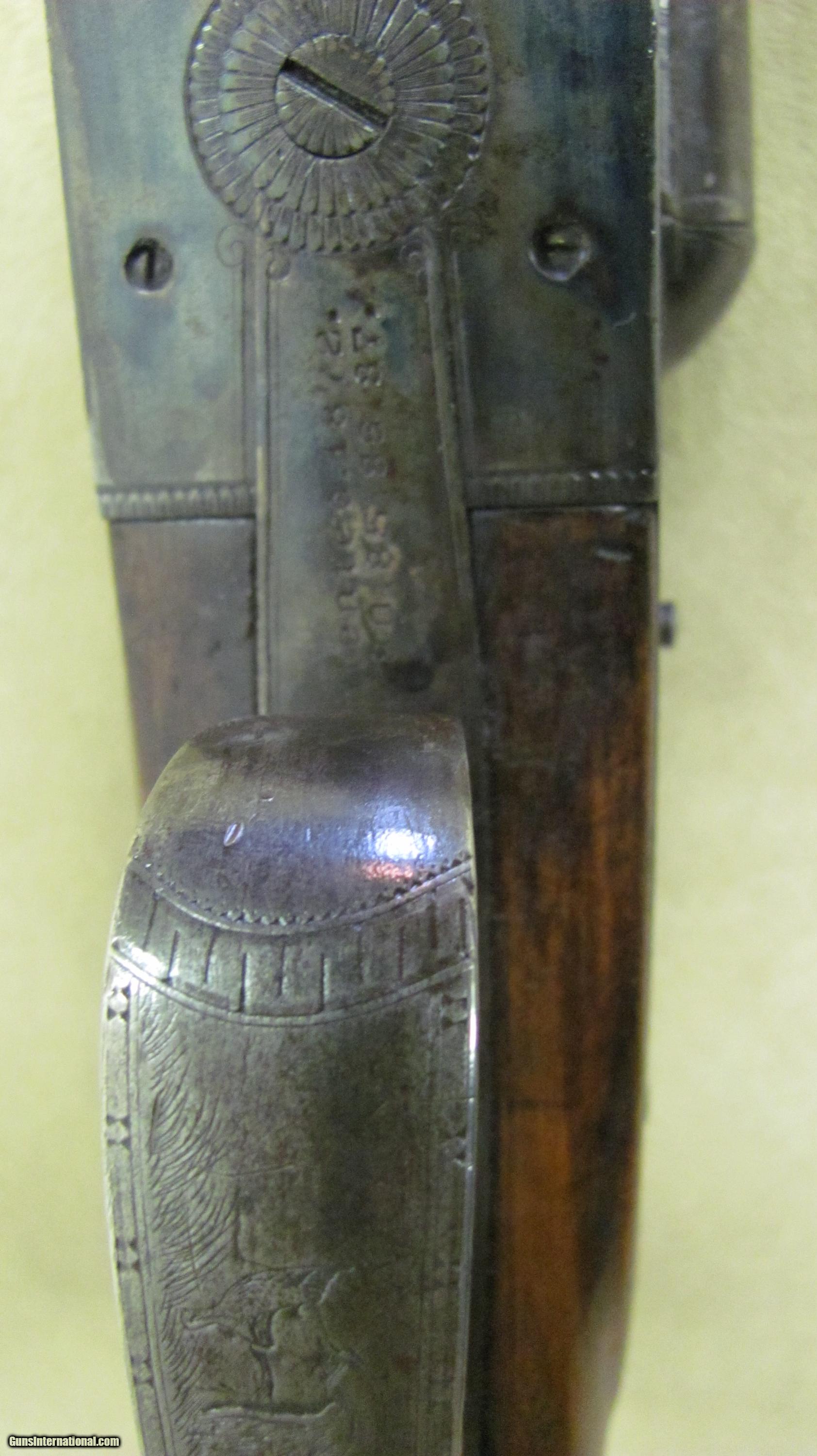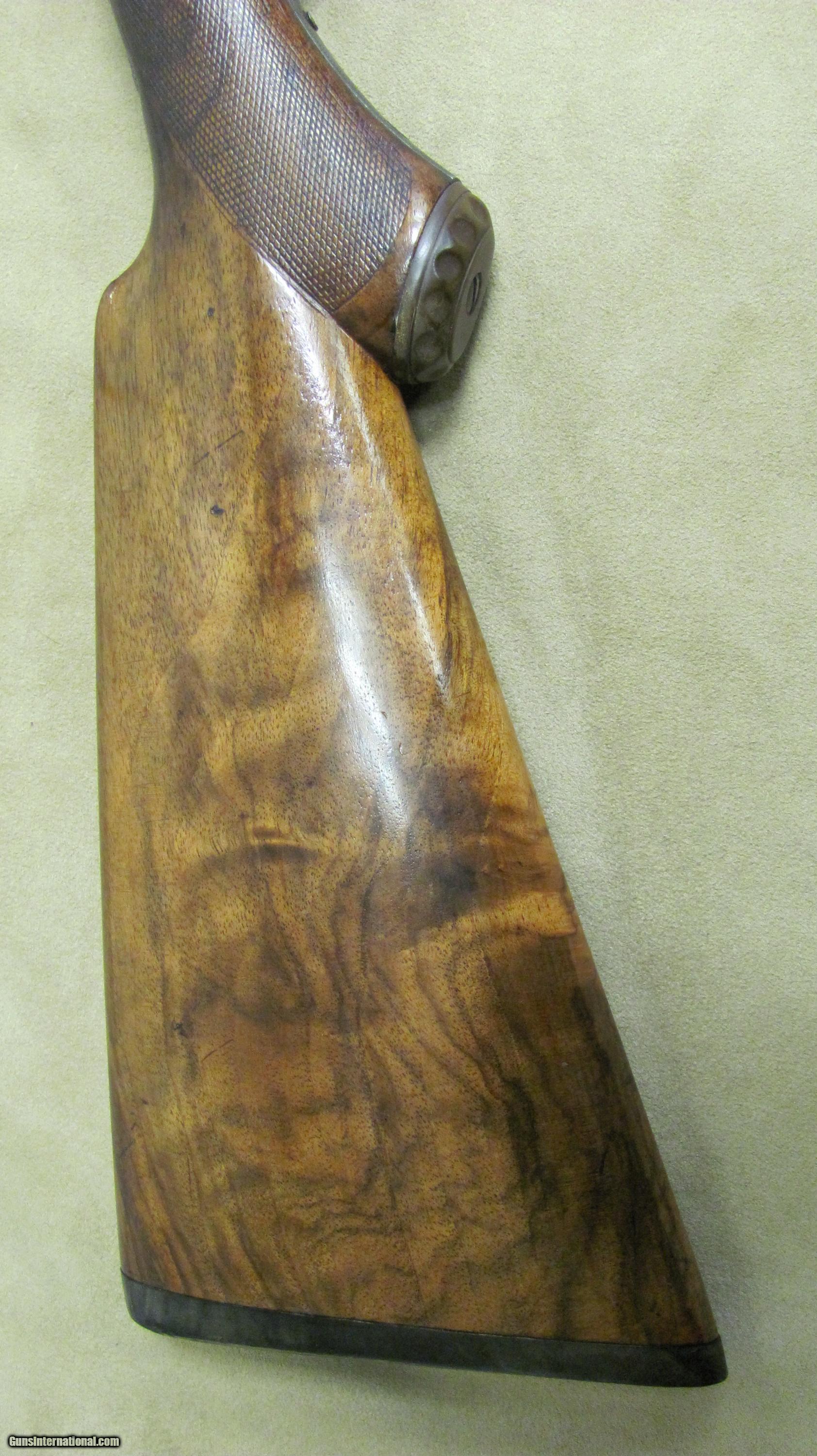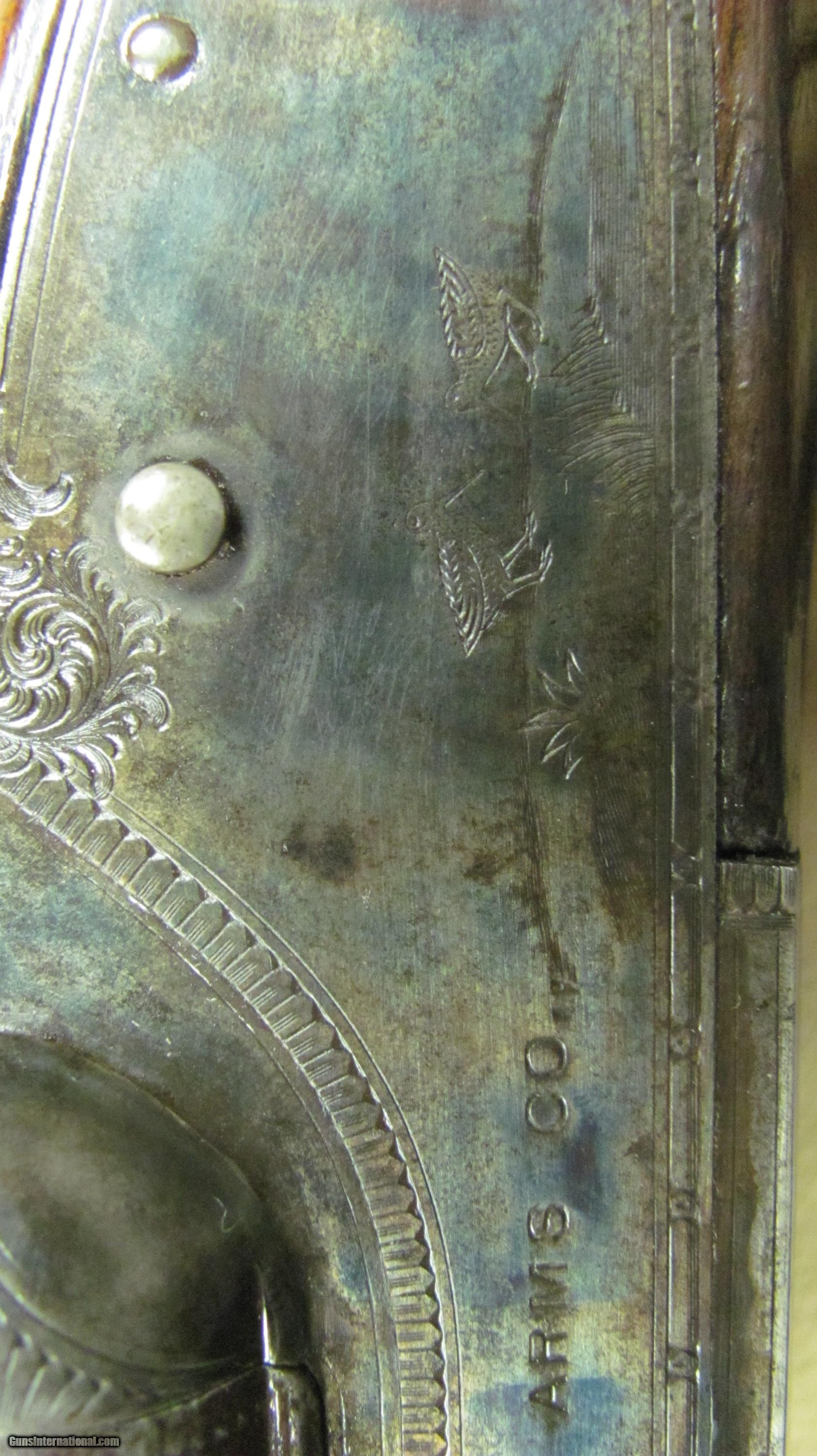 Description: High grade Lefever double barrel shotgun (D Grade) with 26" Damascus barrels chocked Cyl and Imp, Cyl. LOP iis 14", DAC is 1 5/8", DAH is 2 1/2". Weight is 7.0 lbs. This shotgun has highly figured factory wood on the stock and forend. All engraving is very sharp. Good damacus pattern on barrels and barrels have good bores. A very nice classic American shotgun. SOLD Curio/Relic: Yes Manufacturer: Lefever Model: D Grade |