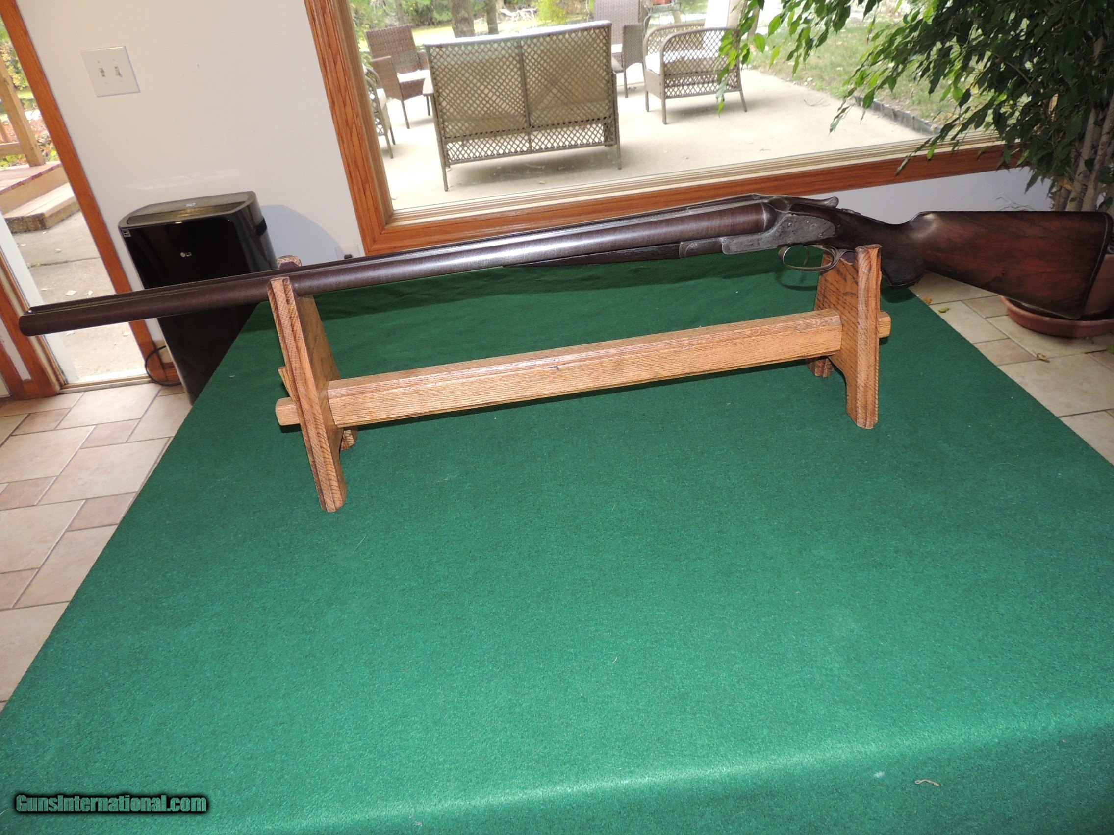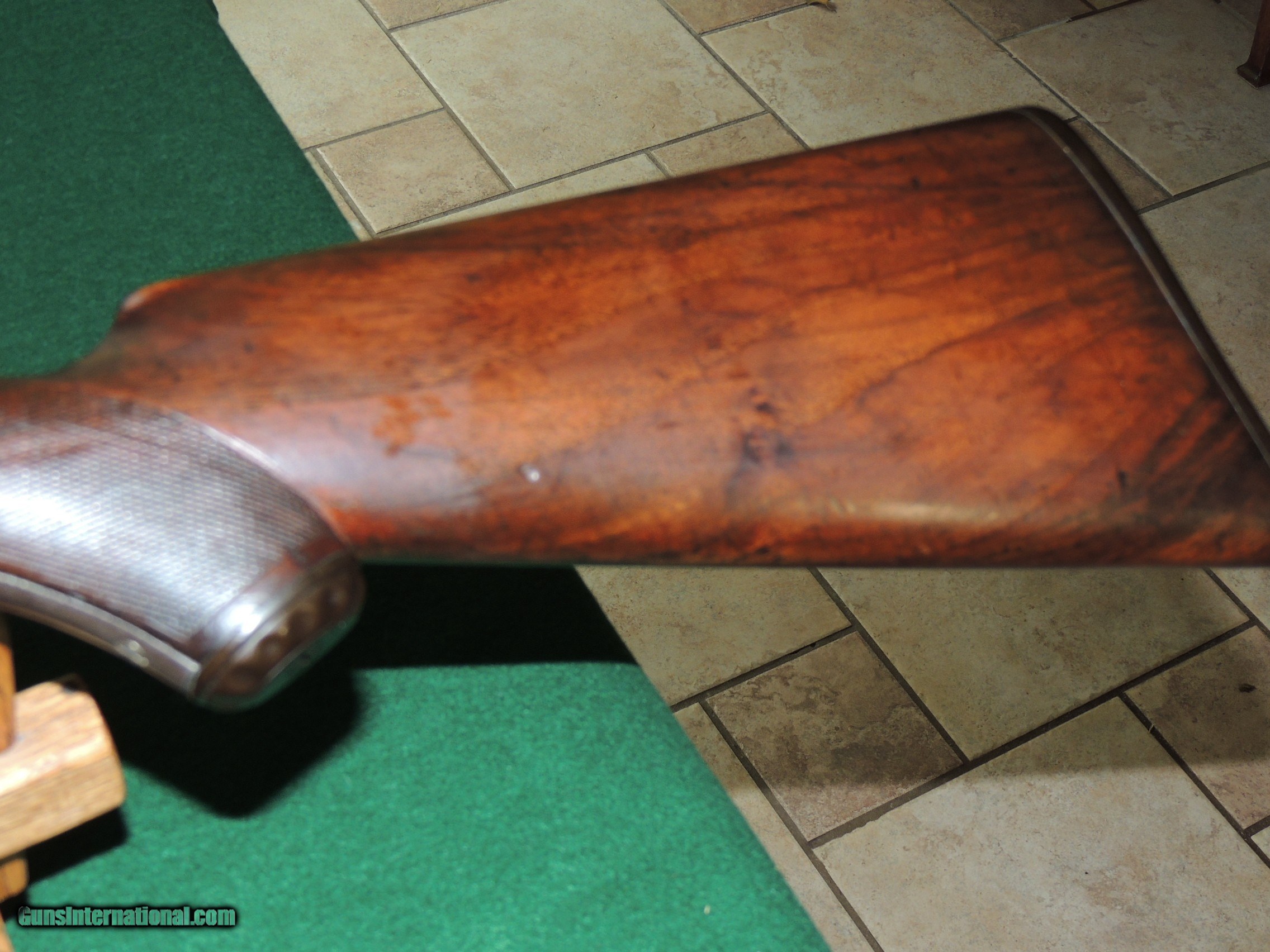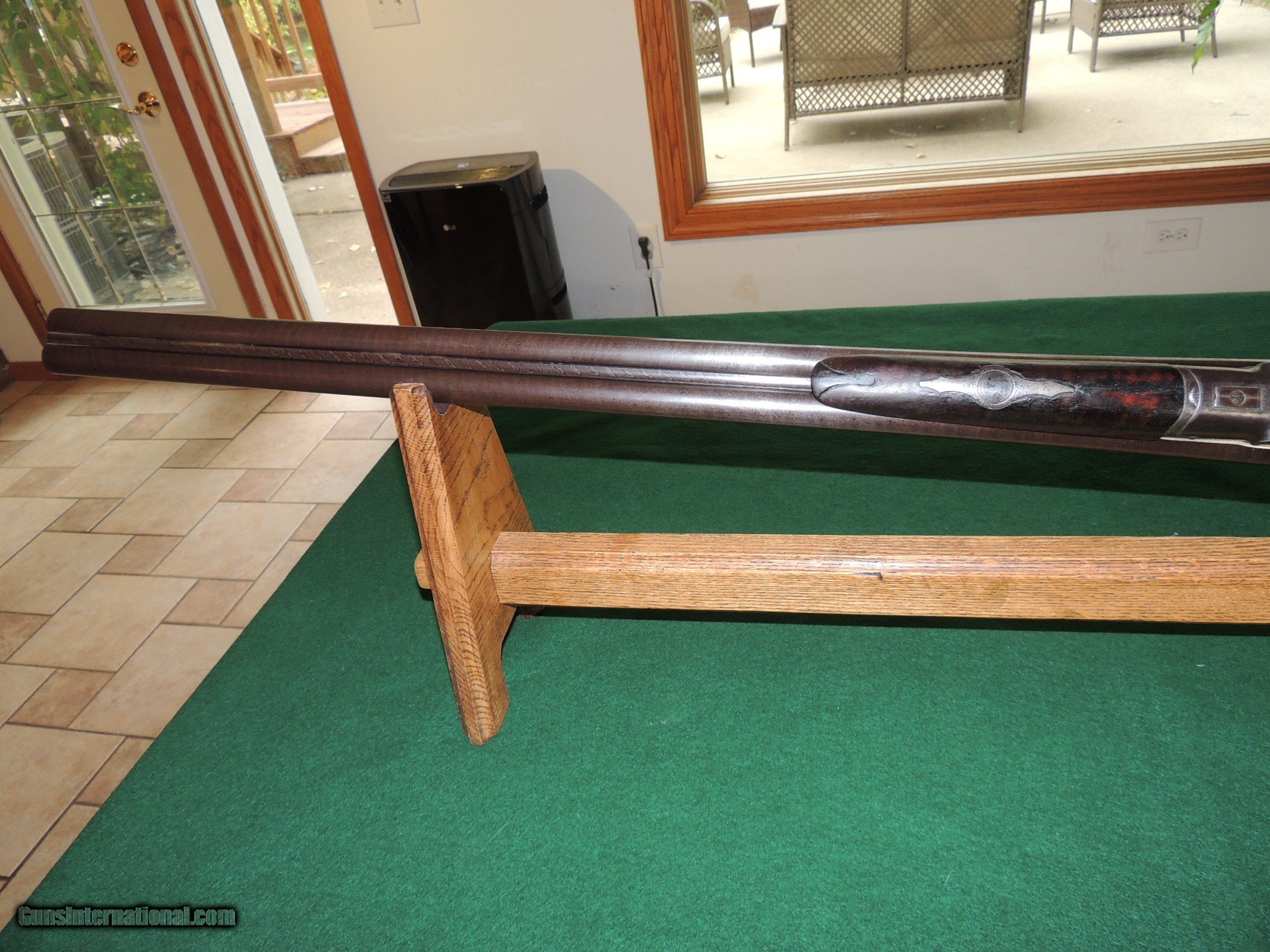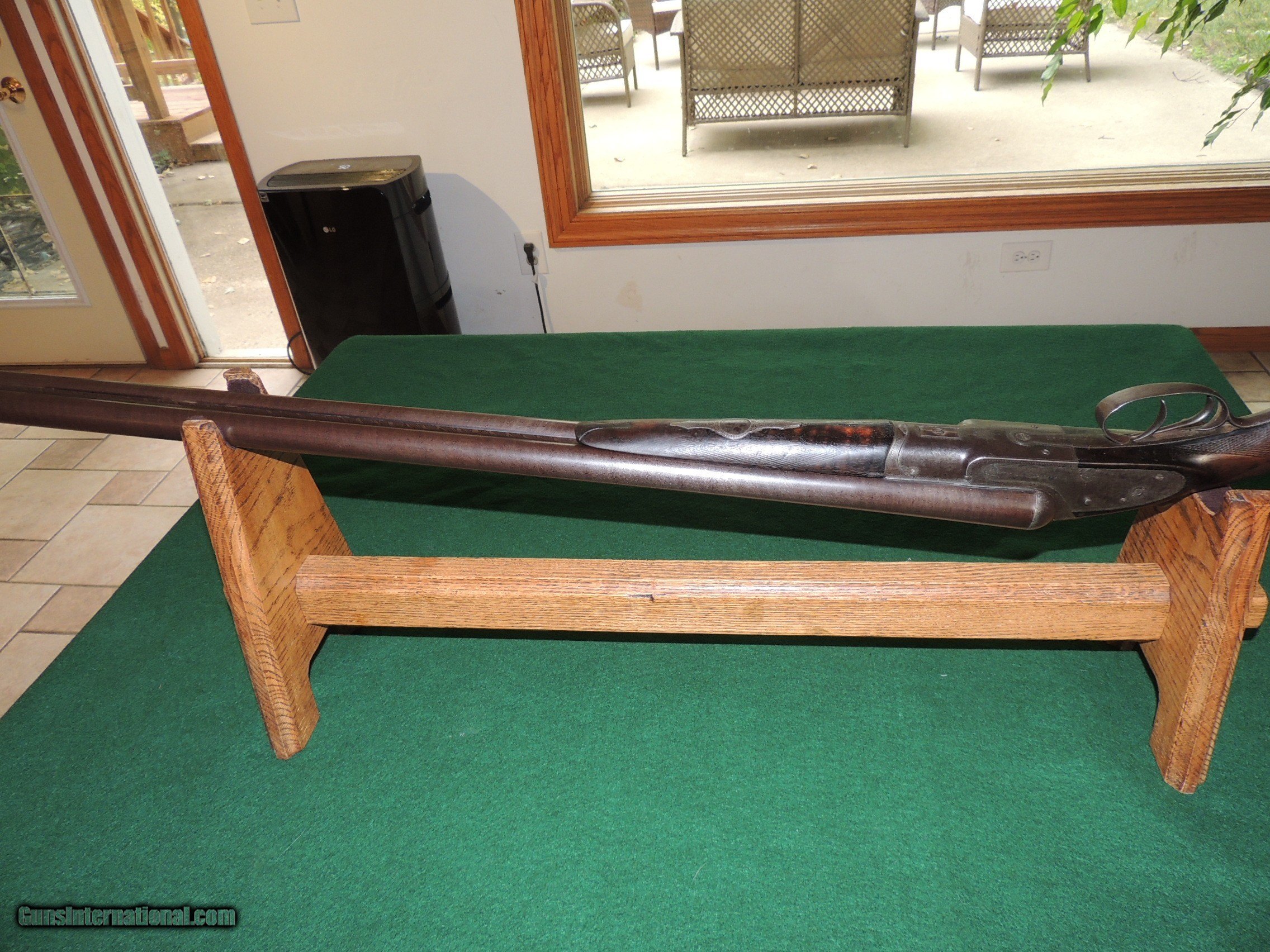 Description: 30” Damascus barrel Super Clean, Extractors, Double trigger, very early gun with pivot lever, push button forend, LOP 14 ½, DAC 2 ¾” DAH 3 ¾”, LeFever butt plate, WT 9# 1 oz. . Solid Gun. SOLD Antique: Yes |