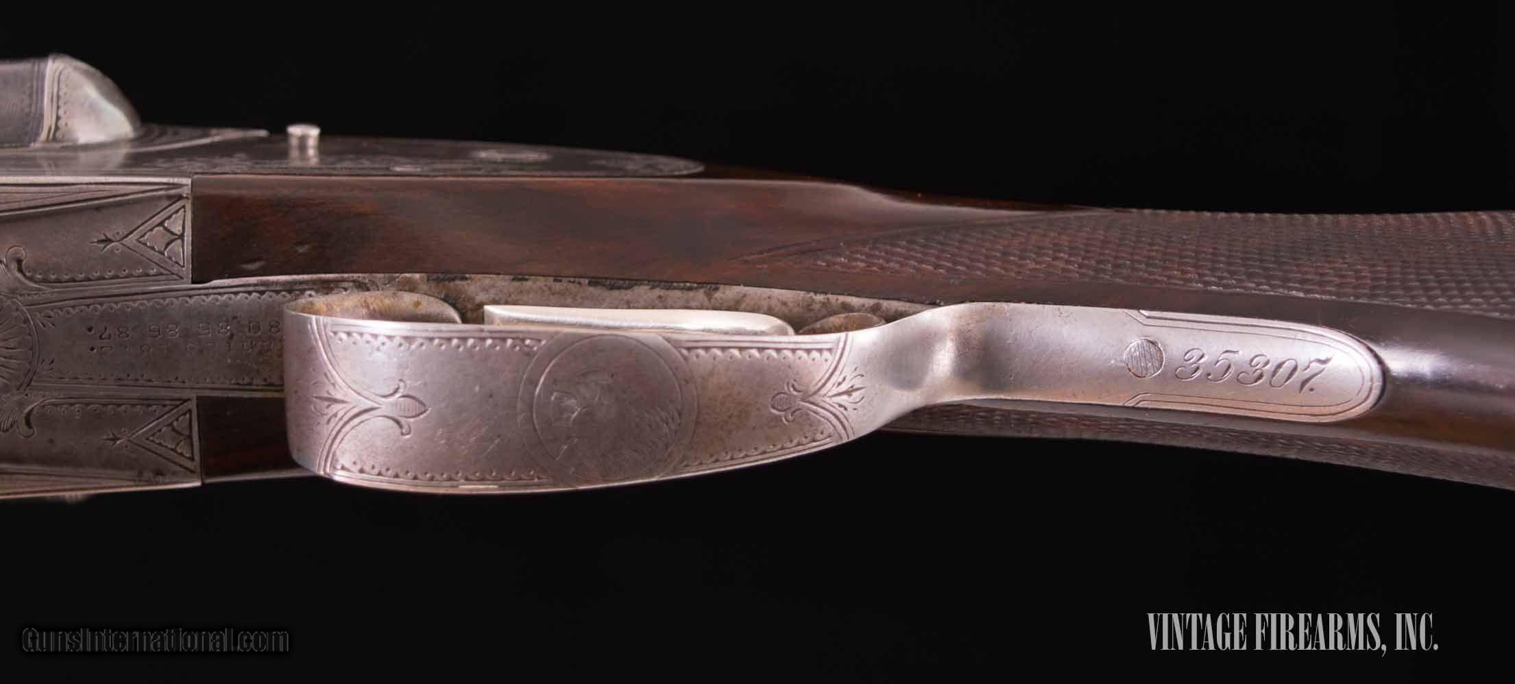 Description: Lefever EE Grade 12ga. – BEAUTIFUL DAMASCUS, GREAT DIMENSIONS BEAUTIFUL DAMASCUS, GREAT DIMENSIONS General Specs: Lefever, Year 1901, 12 Gauge, 7lbs 10oz, SxS Serial Number: 35307E Most who pursue American doubles are aware that Lefever Arms Co. of Syracuse, N.Y. produced very elegant shotguns. The engraving is better than most in its tasteful application, the frames were ornately sculpted and shaped, and the workmanship overall was superior to the competition of the day. With the last Lefever being produced in 1919, Lefever produced relatively few guns; in the range of 50.000 or so in all grades and gauges, most being lower grade guns. Mr. Elliot’s book “Uncle Dan Lefever—Master Gunmaker” notes there were few high grade Lefevers produced, and most gunners that search for fine American vintage double guns are aware that there are few Lefever EE Grade guns ever seen for sale, especially in great original condition. MOST IMPORTANTLY, THIS LEFEVER, SN35307 MADE IN 1901, RETAINS PLENTY OF FACTORY ORIGINAL CASE COLORS. Look at the engraving executed by the master Joseph Loy and the sculpting of the frame. A Lefever EE Grade 12ga. is not a rare gun, but in this condition it is not often seen. The EE Grade is high enough to show Lefever elegance in the engraving, wood figure, fit/finish, but still seen often enough to be affordable. Sporting 30" fine damascus barrels with excellent bores choked IM/F, with a minimum barrel wall thickness of 25 thou, ejectors that are strong and timed, and a gorgeous well figured walnut stock with modern shooting dimensions, she is ready to take waterfowl, upland, or clays for you with high style. This is a fine, investment quality Lefever that will always be a highly sought-after gun. Thanks for looking! Barrels Barrel Length: 30" Chokes: .030/.036 IM/F Bores: excellent Bore Diameter: .740/.738 Wall Thickness: .033/.025 % Blue: 97% black/silver Chambers: 2 5/8" Ribs: tight Sights: single Action Action: tight Ejectors or Extractors: Ejectors, well timed Case Color: 70% fading factory Screws: excellent Engraving: Joseph Loy engraved; clear, sharp, awesome Trigger Type: double, crisp Trigger Guard Color: dog scene silver/grey Stock Type: capped pistol grip/splinter forend; figured circassian LOP: 14 1/8" LOP To End Of Wood: 13 1/16" DAH: 2 1/4" DAC: 1 5/8" Cast: 0 Checkering Condition: excellent Butt Treatment: orange silvers pad There are more photos upon request. We offer a 30 day mechanical warranty on this fine shotgun. Call us for full details. PLEASE SEE MY OTHER FINE VINTAGE FIREARMS. Just open one of my ads and click on the line that says “see all items from this seller” and a very nice list of fine sporting and collectible arms will appear. I have many more fine sxs shotguns not yet listed. Thanks for looking! We employ a full time gunsmith on premises and can perform alterations to suit your needs within a few weeks of purchase. Payment Methods: Money Order, Certified Check, Personal Check, Wire Transfer Inspection Period / Return Policy: Three Days from the date the item was received. Sales Tax: 6% Michigan Only Shipping & Insurance: Ground $45.00 We ship internationally! Item Condition: Used Requires FFL?: Yes If you have any questions about this item or payment, please email or call us at #616-292-6240. Thanks! Vintage Firearms Inc We employ a full time gunsmith on premises and can perform alterations to suit your needs within a few weeks of purchase. Common requests are: -stock bending to suit your particular requirements -addition of any specified butt pad to increase length of pull -alteration of chokes to suit your shooting preferences -lengthening of chambers and forcing cones -darkening stock color with penetrating stains -restoring any part of the gun including rust blue, charcoal blue, bone and charcoal case color, wood restoration and checkering recuts. If you like one our guns but it needs "tweaked", let us know and we can quote you a time and price. Some enthusiasts like the guns "as found" and others want them "just so". We often list guns as found and let the particular buyer choose how they want their gun to fit or look. SOLD Curio/Relic: Yes |