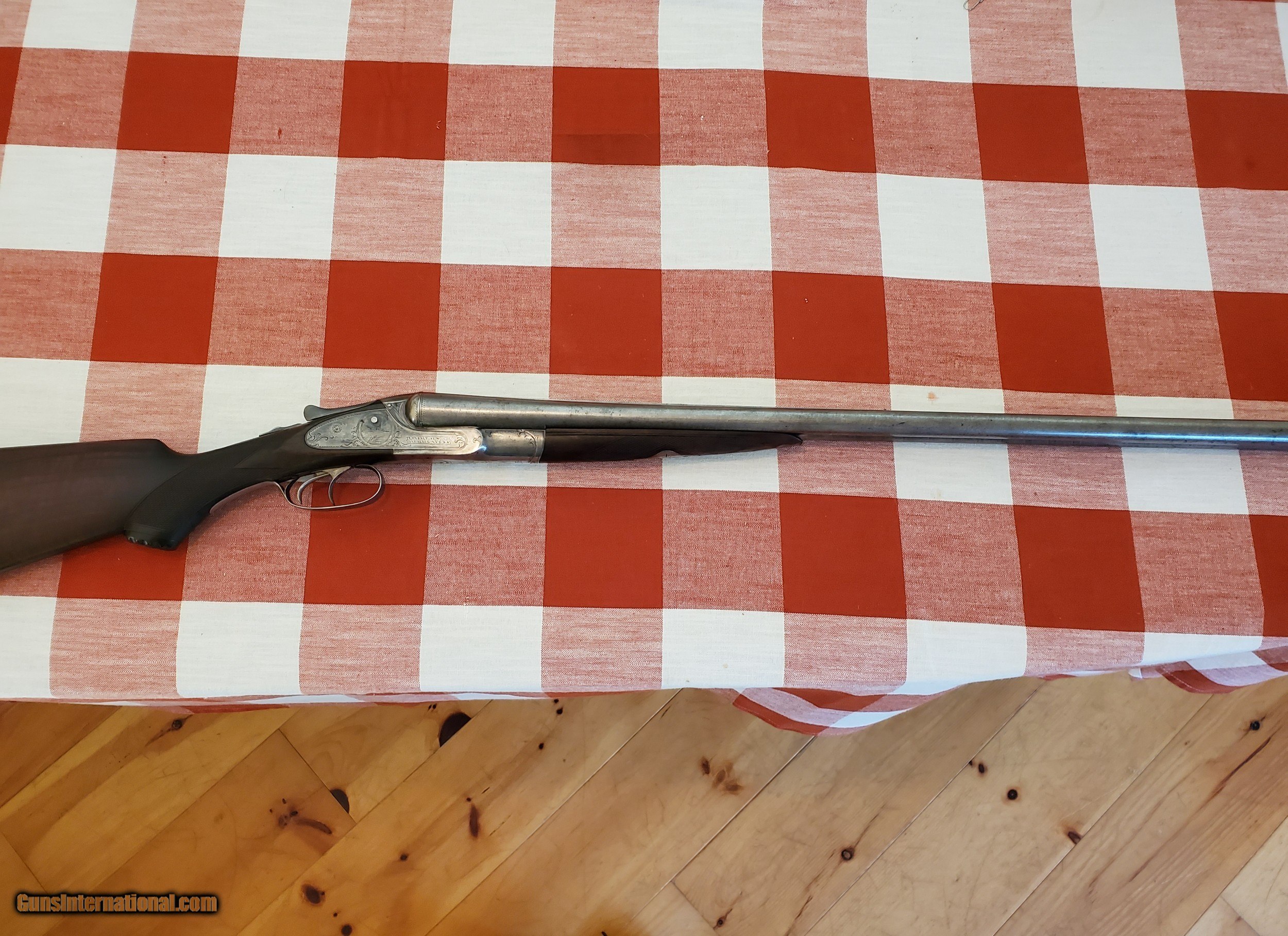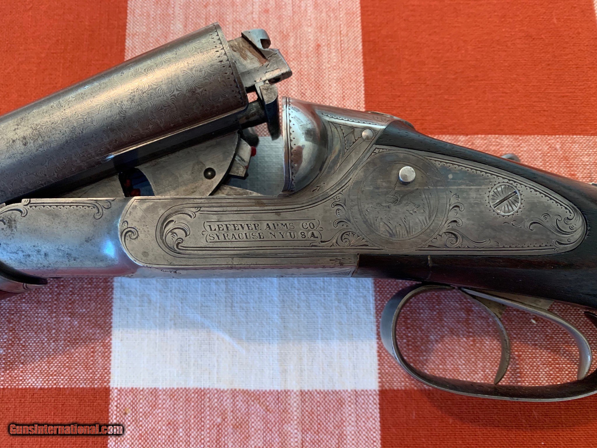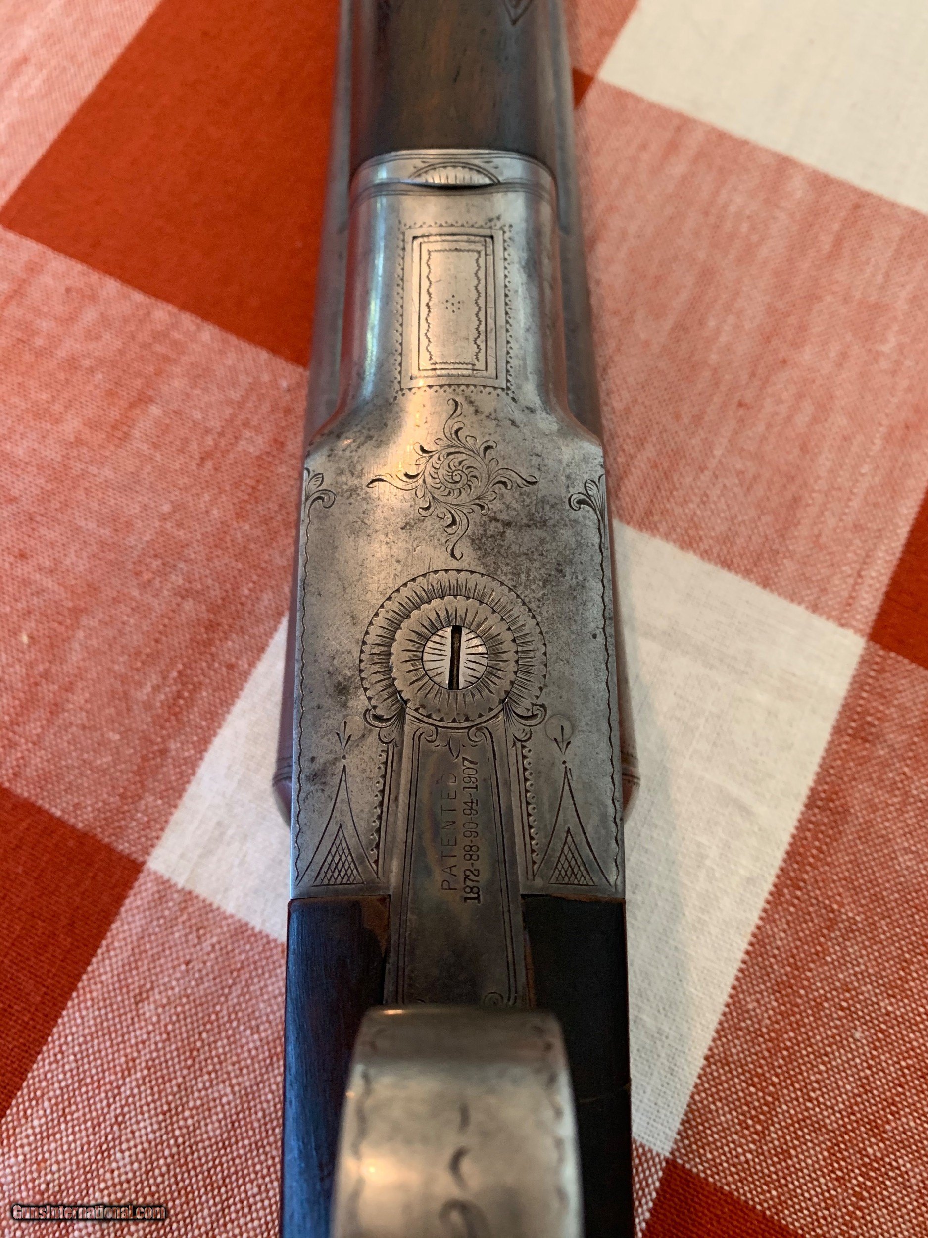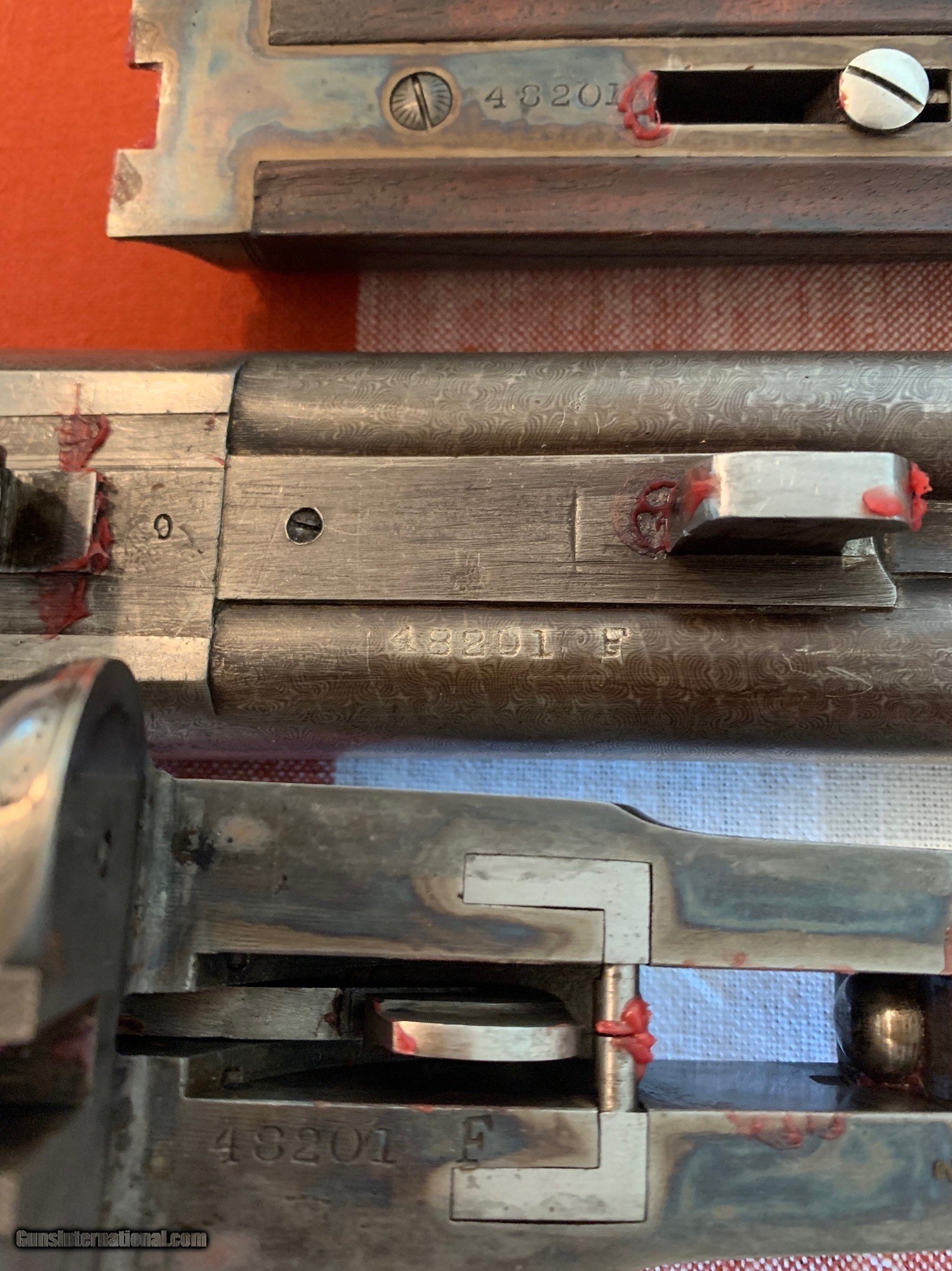 Description: Refinished 16ga Lefever FE weighing in at 6lbs 3oz. A joy to carry in the woods or field, this gun has enough choke to do serious work downrange or paired with vintage, spreader loads in the right barrel can bring down grouse and woodcock with ease. Damascus pattern remains albeit with some light browning/patina towards the end of the barrels. Stock "horn" by triggerplate has been repaired by Craig Libhart of Susquehanna Stockworks. Gun has not been shot since strip and clean by contributing writer to Shooting Sportsman, Dewey Vicknair of Vicknair Restorations. Secure your proper, American-made game gun today! SOLD Manufacturer: Lefever Model: FE Serial Number: 48201 Bore: 16 Chambers: 2.56 Ejectors: Yes Condition: Good Metal Condition: Good Wood Condition: Fair Bore Condition: Good Barrels: 28" Damascus Triggers: Double Gauge Info: 16 Stock Comb: 1.5 Stock Heel: 2.31 Stock Cast: Cast-on LOP: 13.63 Finish: Linseed oil Weight: 6lbs 3oz Manufacture Date: 1903 Choke Left: IM Choke Right: IM Item Location: Union, ME |