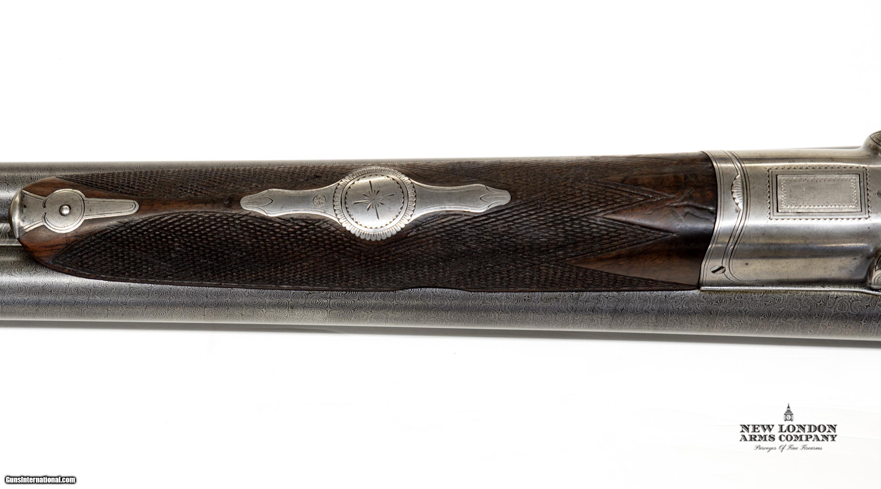 Description: Beautiful LeFever Grade D 12G extractor gun with fine engraving. Barrels are 30" fine black and white Damascus. Other features: - Pivot top lever - Fish hook unit of two cocking hooks. - Very nice stock with 15" LOP over a Mark Larson stock extension....barely visible. - Flat filed rib. This is a very nice example from the collection of a serious LeFever collector who is also a past winner of the Uncle Dan Cup. Payment The listed price is for payment by certified funds, like money orders and certified checks. Most major credit cards are accepted for a 3% processing fee based on the price of the item(s) purchased. North Carolina residents are subject to applicable state sales and local sales taxes. Shipping and Handling New London Arms Company charges a fixed rate on all Shipments. The charge forrifles and shotguns is $45. Insurance may be added at 1.75% of the total purchase price. We do not ship to California, Massachusetts, Maryland or New York State. Buyers should know the applicable laws and regulations in their state and city to ensure this item(s) is legal in their area. Other If you have questions please email us. Our address is - info at newlondonarms then com We are a Premium firearms dealer and are not open to the general public. Our store is open by appointment only. For buyers, this ensures you get a pristine, mint condition firearm that has not been ‘manhandled’. Our inventory is usually shipped out in the same box it arrived in. All Firearms are new in box unless otherwise specified All firearms, magazines, receivers and restricted law enforcement items are sold and shipped in accordance with all existing federal, state and local laws and regulations. Many of the firearms, magazines and parts for sale on this may be restricted or prohibited in your area. Please check your local and state regulations before purchasing. SOLD Manufacturer: LeFever Arms Co Model: Grade D Serial Number: 13591 Chambers: 2 3/4 Ejectors: No Barrels: 30 Barrel Type: BW Damascus Action: Sideplates Triggers: Double Gauge Info: 12 Stock: Semi pistol grip Stock Comb: 1 5/8 Stock Heel: 2 5/8 Stock Cast: None Fore End: Push Button LOP: 15" Over Extension Rib: Flat filed Weight: 7'11 Manufacture Date: 1890 Choke Left: .019 Choke Right: .004 Engraving: Very Nice Case: None Minimum Wall Thickness Left: .036 Minimum Wall Thickness Right: .031 |