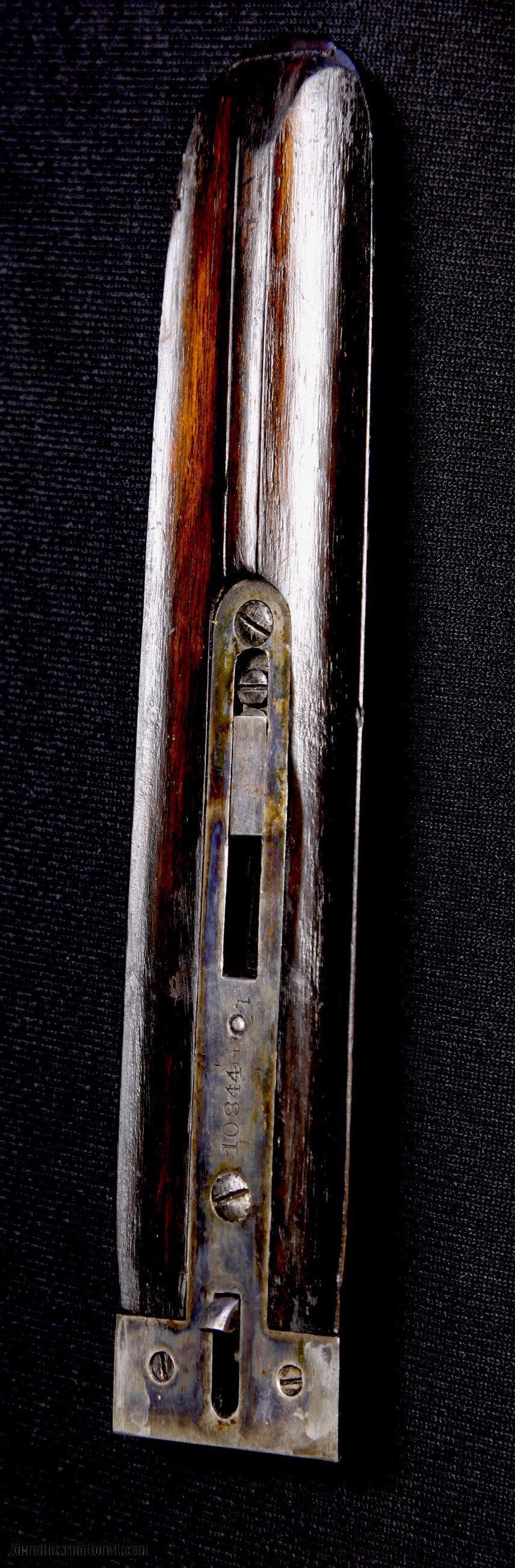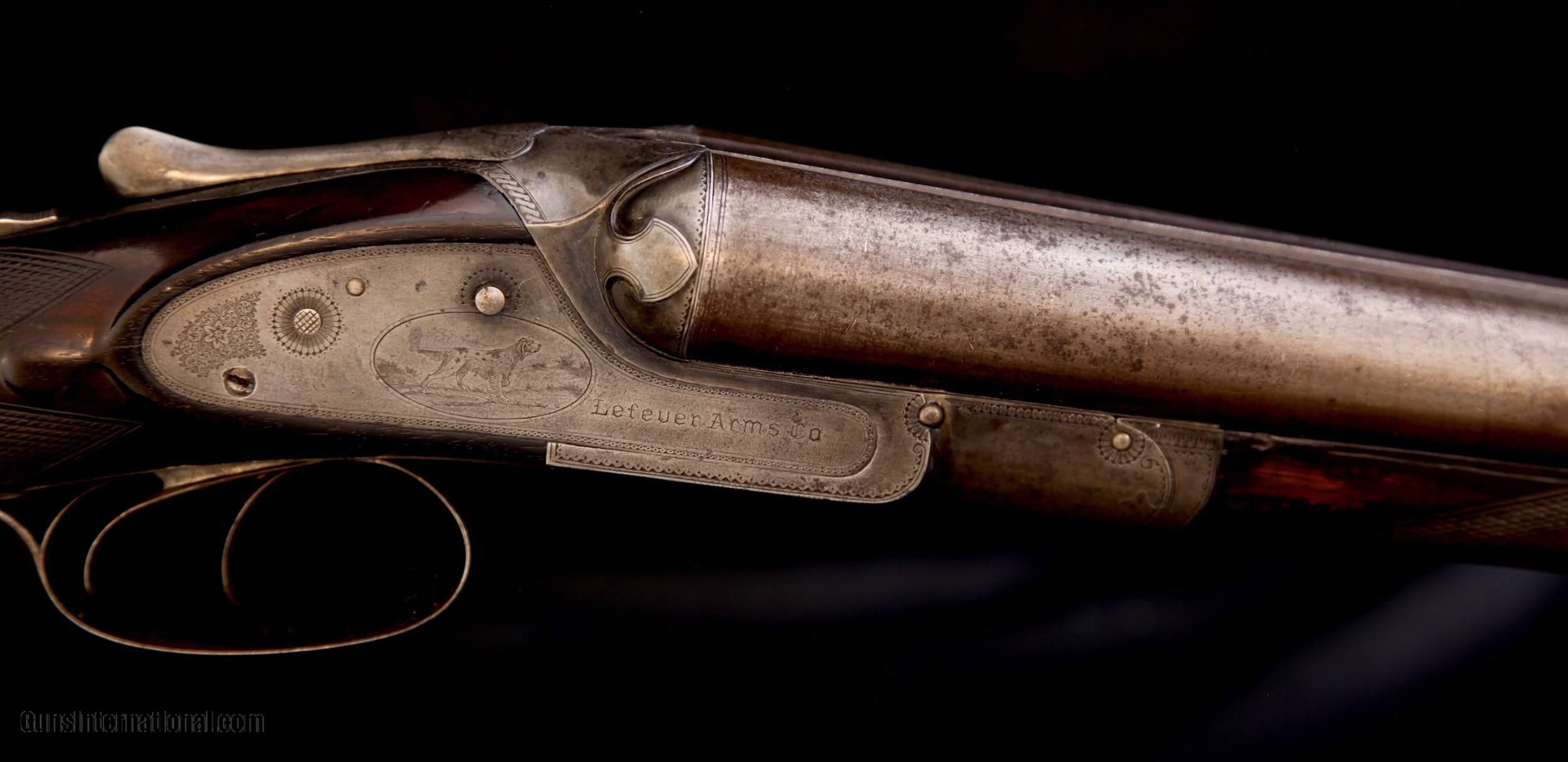 Description: Early D Grade Lefever guns are seen with some regularity, but rarely do we see one that has special features like this one has. The gun has a clear barrel legend which states "Kilby Damascus Steel Manufactured By Lefever Arms Co." on tops of both barrel tubes and barrels are 30" Long. The gun has a special gold inlaid monogram on the trigger guard with the letters "FPC". This is an extremely rare feature and surely original and special order. The gun was made with double triggers (originally gold plated), splinter forend with engraved push button release, and capped pistol grip English Walnut buttstock. The pad is an older replacement Hawkins which should be replaced. The gun is a cocking rod era gun with pivot opener. Of great importance is a small "S" Engraved in the game scene on the left side. This is likely the hallmark of A.E. Spangler who mostly likely engraved this special order Lefever. Signed Lefevers are an extreme rarity!!! This gun is priced at $3495 plus shipping. It is an antique so it can be shipped directly to your door! Please dont hesitate to contact me with any questions or reasonable offers on this unique Lefever. I can be reached via PM on this site or at (704) 280-2382. SOLD Antique: Yes Manufacturer: Lefever Model: D Grade Special Order Serial Number: 10844 Bore: 10 Bore Chambers: 2-7/8" Ejectors: Extractors Condition: Very good Metal Condition: Very good Wood Condition: Very good Bore Condition: Good with some pits Barrels: Kilby Damascus Triggers: Double triggers Stock: Capped pistol grip Stock Drop: 2" DAC 3" DAH Fore End: Push button opener / Splinter Butt Pad: Hawkins LOP: 14-1/8 Weight: 8lbs 14oz Chokes: Full / Full Choke Left: .036. .779 bore Choke Right: .040 .775 bore |