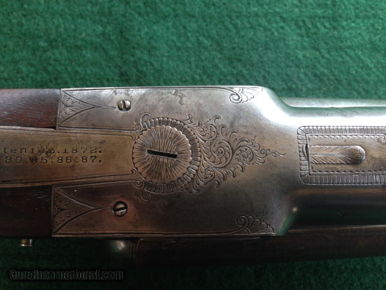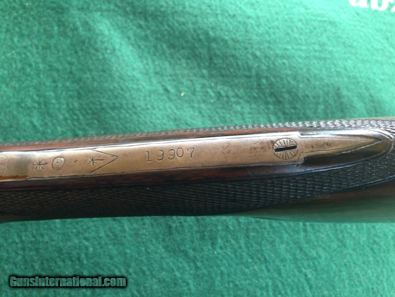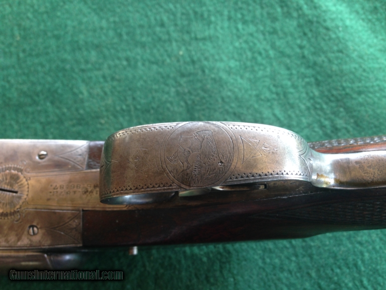 Description: Rare Lefever EE/DE 10ga gun. What an upland game gun- original 28" barrels choked .018 and .040. Straight stock with excellently figured wood as can be seen in the photos. Good bores throughout, not mint, but very nice and shiny. Gun retains about 30-35% original case hardening. Roughly 85% original damascus pattern. Chambers are 2 3/4". We can't get factory letters on these Lefever guns but I believe this gun started life as a pistol gripped gun and was converted by Lefever Arms to a straight stocked gun during the period of use. It has a full length trigger guard tang with appropriate Lefever factory engraving. Checkering is very nice throughout. Stocks show a few bumps but nothing offensive and could be cleaned up if the new owner wishes to do so. 14" LOP over a Lefever monogrammed buttplate. 1 3/8 DAC and 2 1/2 DAH. Fabulously figured stock! Wonderful and shootable dimensions and an upland dream gun in 10bore. Weighs 7lbs 9oz.- Please contact me with any questions SOLD Curio/Relic: Yes Antique: Yes |